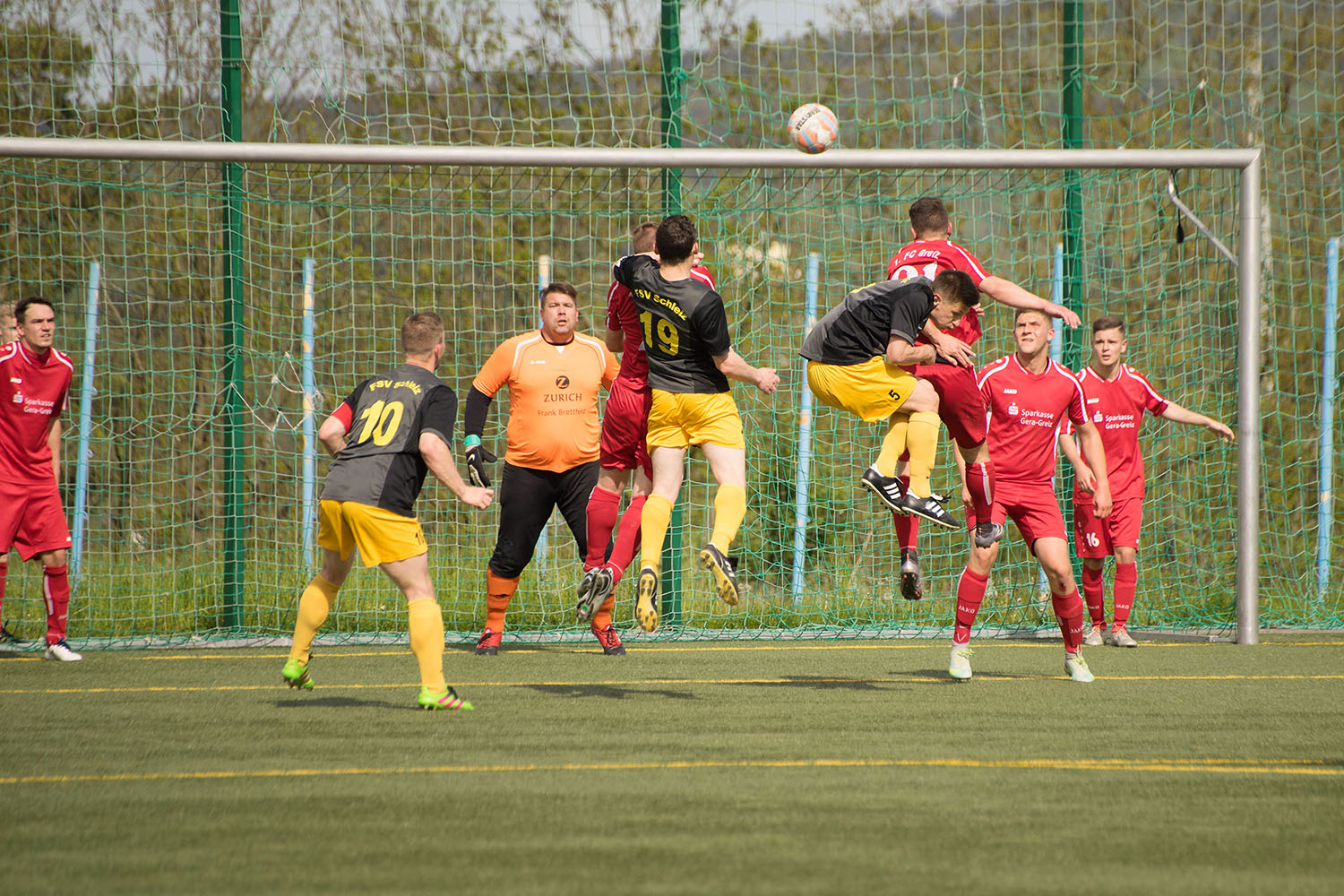 Flugballett im Greizer Strafraum als sich die Schleizer Mirko Horn (Nr.5) und Albert Pohl (Nr.19) am Kopfball nach einer Ecke versuchen, Frank Gerisch (Nr.10) beobachtet die Situation.