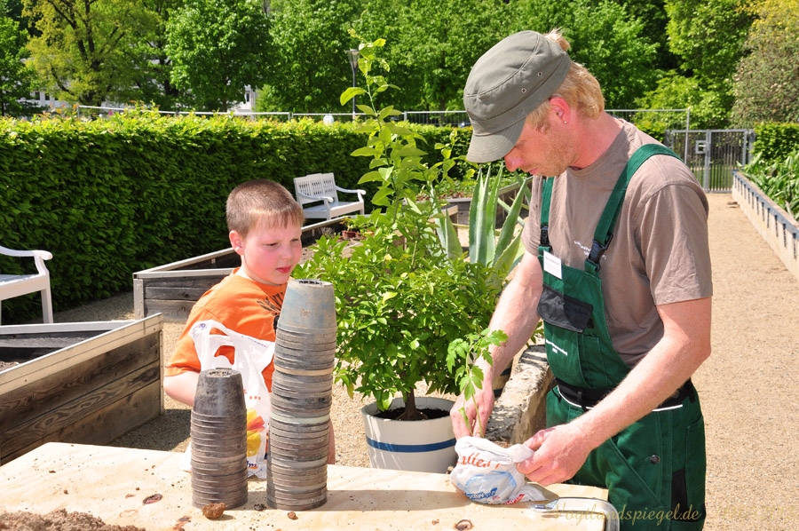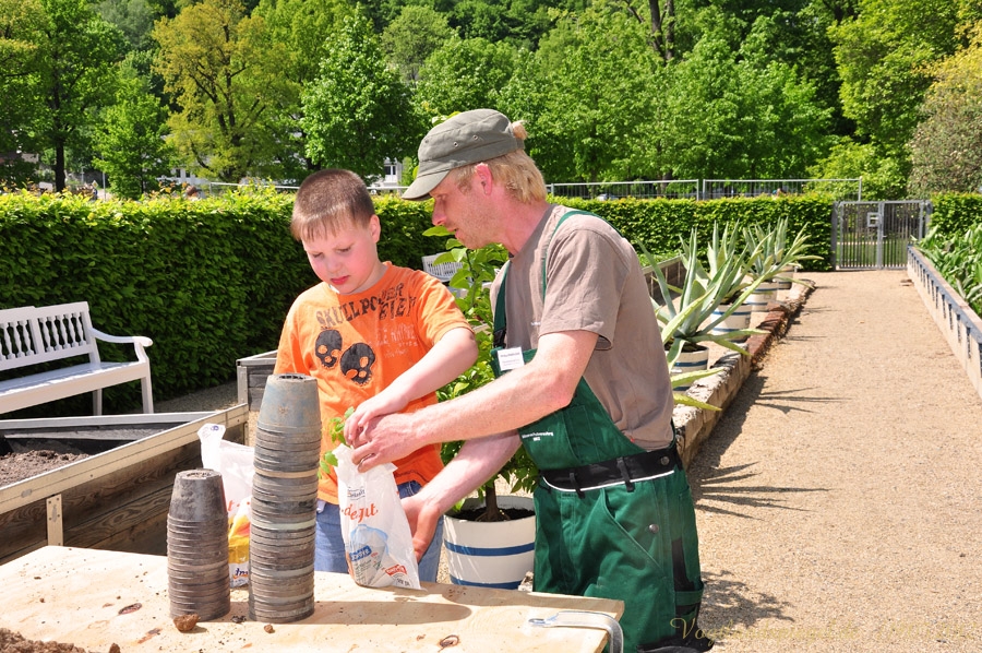 »1.Greizer Parkfrühling« wird von den etwa 850 Besuchern bestens angenommen. Informative Einblicke in die Arbeit der Parkgärtnerei Das Topfen von Pflanzen wurde in der Kindergärtnerei bestens angenommenGREIZ. „Immer muss der Park den Charakter der freien Natur tragen.“ Diese Aussage von Rudolph Reineken (1846-1928), der als „Vollender des Greizer Parks“ gilt und als Hofgärtner in den Diensten von Fürst Heinrich XXII., Reuß ältere Linie stand, wurde der kleinen Ausstellung „Der Greizer Park – ein Juwel der Gartenkunst“ vorangestellt. Der frühlingshafte Pflanzenmarkt und das bunte Programm rund um die Parkgärtnerei im Greizer Park wurden am Sonnabend von den Besuchern bestens angenommen. Bei strahlendem Sonnenschein strömten die ersten Gäste schon kurz vor der offiziellen Eröffnung heran und umlagerten die Stände, an denen Pflanzen, Blumen, Kräuter, aber auch Bücher, Publikationen und Töpferwaren angeboten wurden. „Die Pflanzen wurden uns förmlich aus den Händen gerissen“, wie Parkverwalterin Anja Riemann lächelnd sagte. Sehr gut besucht waren auch die beiden Führungen durch die Orangerie und das Warmgewächshaus. „Hier kommt man ja sonst nicht hinein“, wie sich Kurt Menzel freute, der selbst einen großen Garten bewirtschaftet und zum „1. Greizer Parkfrühling“ extra aus Weida kam. Interessant fand er vor allem die automatische Bewässerung der Pflanzen. Zum Lichtbilder-Vortrag „Ein Garten wächst nicht von allein – Parkpflege im Greizer Park“, den Anja Riemann hielt, fanden sich zahlreiche Interessierte in einem Dienstraum der Parkgärtnerei ein und erfuhren, wie sich das Gärtnerjahr des Teams gestaltet, das sich seit Anfang letzten Jahres im Auftrag der Stiftung Thüringer Schlösser und Gärten sach-und fachkundig um die Geschicke des denkmalgeschützten Parks kümmert. „Der Park besticht seither wieder durch sein hochwertiges Erscheinungsbild“, wie es Constanze Meinel formulierte, die in Reichenbach/V. wohnt, mit ihrer Familie aber oft im Greizer Park spazieren geht. Die „frischen Früchtchen“ aus dem Frühbeet, die nicht nur gut schmecken, sondern auch schön aussehen und betörend duften, fand die Vogtländerin ebenfalls interessant. Über den historischen Rasenmäher, den Vorarbeiter Markus Madalschek demonstrierte, freute sich Alfred Dinger, der sich noch an dessen Einsatz im Park erinnern konnte. Anja Vetter kam mit den Kindern der Kindertafel des Cafe` O.K. zum Parkfrühling. Vor allem das Angebot für Kinder gefiel ihr: der Maltisch, das Rätsel zur Baumbestimmung und besonders die Möglichkeit, das eigene Blümchen zu vereinzeln und zu topfen. Der achtjährige Kai Stolpmann zeigte sich stolz über seine Tomatenpflanze, die er mit nach Hause nehmen durfte. Das kleine Violinkonzert des Duos Marius Frantz/Franziska Reiher, das zwischen den Frühbeeten stattfand, gefiel Christine Kappert aus Kleingera besonders gut. Das Fachsimpeln zu verschiedenen Gartenthemen fand Horst Heppner spannend. Tatkräftige Unterstützung in der perfekten Organisation des 1. Greizer Parkfrühlings fanden Anja Riemann und ihr Team bei der Schlossverwaltung des Sommerpalais sowie dem Freundeskreis des Greizer Parks e.V., der sich für die kulinarische Verpflegung der Gäste verantwortlich zeichnete. Erfrischende Maibowle oder Brote mit leckerem Aufstrich gehörten zum gut genutzten Angebot des Vereins. Eine Fortsetzung des 1.Greizer Parkfrühlings wurde von allen Gästen der Veranstaltung ausdrücklich und einhellig gewünscht. Antje-Gesine Marsch @19.05.2012