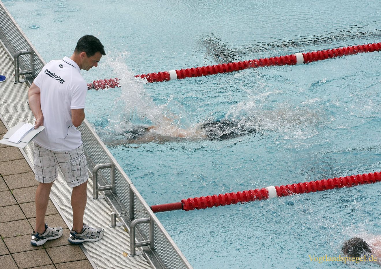 Genau schaut der Kampfrichten auf den Anschlag am Beckenrand.
