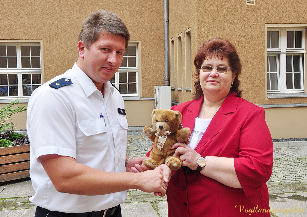 GREIZ. Die Deutsche Teddy-Stiftung, die es seit fünfzehn Jahren gibt, hat sich auf die Fahnen geschrieben, mit Plüschtieren Trost zu spenden. Um das Konzept möglichst flächendeckend zu realisieren, sollen Streifenfahrzeuge der Polizei, Rettungs-und Feuerwehrfahrzeuge sowie die Ambulanzen der Krankenhäuser mit diesen flauschigen Bären ausgestattet werden. Am Mittwochvormittag fanden sich Stellvertreter von Polizeistationen aus ganz Thüringen im Innenhof der Greizer Polizeiinspektion ein, um 750 Teddys in Empfang zu nehmen. Im Beisein der beiden Stellvertretenden Vorsitzenden der Leerer Stiftung, Harmut Dornieden und Erich Braams, sowie der Teddy-Botschafterin im Saale-Orla-Kreis, Cornelia Remde und KOR Mirko Remmert nahmen die Beamten die Trösteteddys in Empfang. Ginge es nach den Vorständen der Stiftung, solle in Greiz eine Initialzündung für ganz Thüringen ausgelöst werden. Der Bedarf ist leider sehr groß wies Erich Braams auch auf die Zwiespältigkeit der Aktion hin. Zum einen sollen die Bären bei Unfällen oder ähnlichen angsterregenden Situationen Kindern Trost und Mut zusprechen, zum anderen wünscht man sich natürlich so wenig wie möglich solcher Umstände. Habe man vor 15 Jahren mit 1000 Teddys angefangen, belaufe sich der Umschlag nunmehr auf etwa 17000 jährlich, was eine ausgeklügelte Logistik verlange. Der Anstieg der Zahlen zeige die Notwendigkeit dieser Initiative, die rein ehrenamtlich arbeite. Alle Einnahmen die auch durch Verkäufe von Teddys getätigt werden würden 1:1 in die Stiftung fließen. Der Greizer Polizeichef Thomas Lenk bekam 100 Teddys übergeben, die fortan an Bord der Einsatzfahrzeuge ihr Domizil finden. Nachdenklich zeigte sich Polizeidirektor Andre` Röder: Die Teddys werden in China fabriziert. Besser wäre doch, wenn sie vor Ort in einer Behinderten-oder Reha-Werkstatt gefertigt würden.