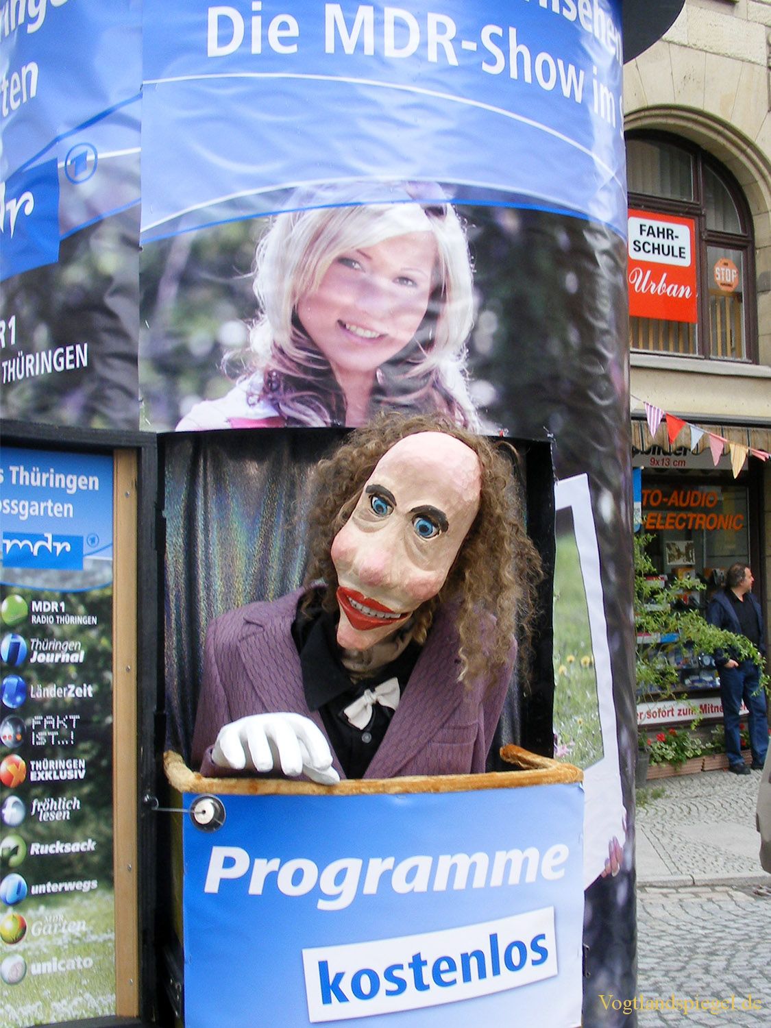 Lustige Werbeaktion des MDR aus einer Litfasssäule heraus.