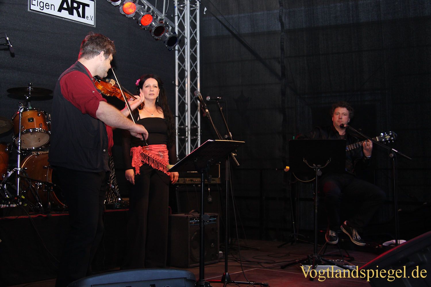 Das Folkprojekt Greiz eröffnet den Schlossfolk. v.l. Gerd Mallon, Antje-Gesine Marsch, Ronny Kerl