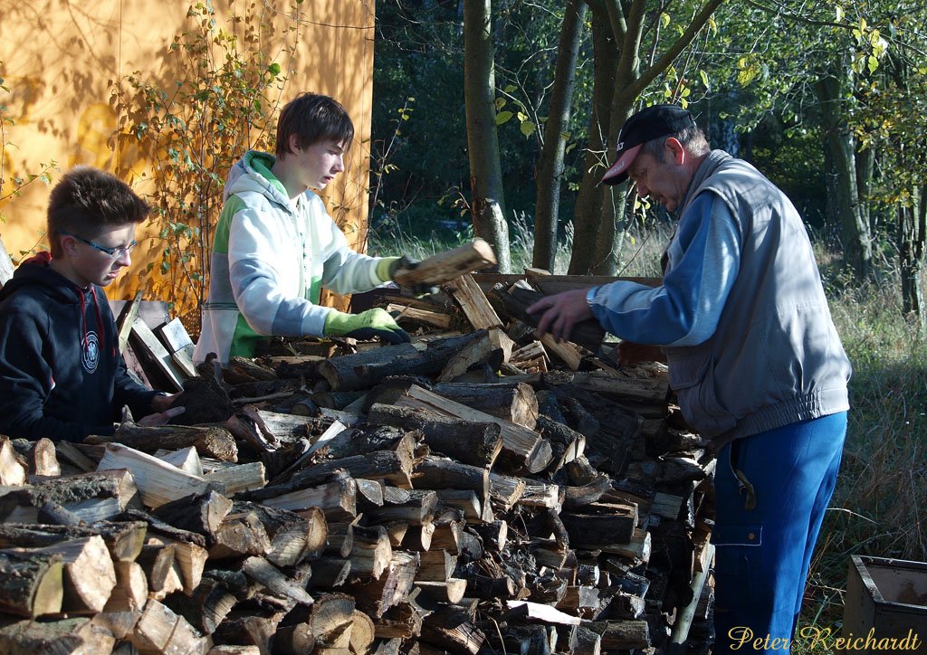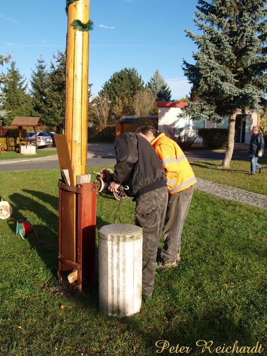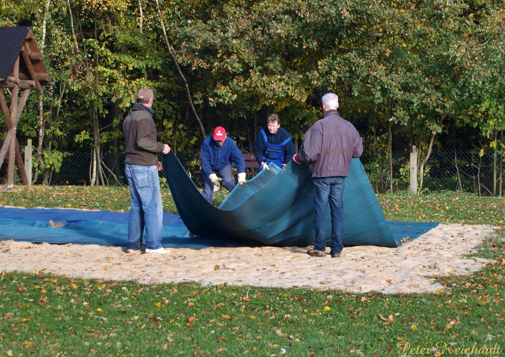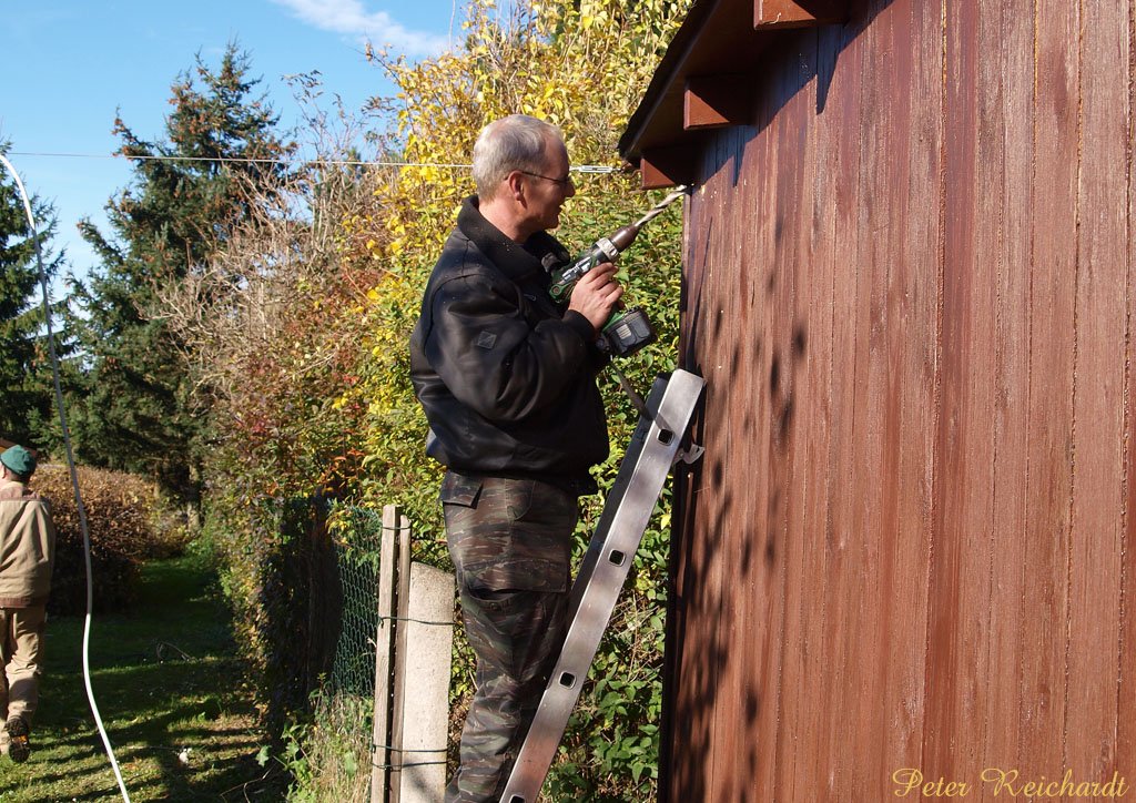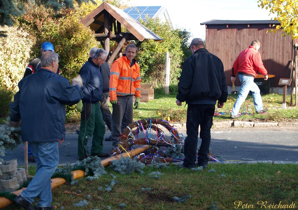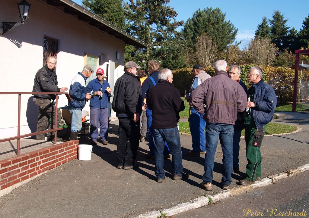 Doch zurück zum 18. Aktionstag vom vergangenen Sonnabend. Da wuselte es in den Vorgärten, Gärten und Straßenabschnitten vor den Gebäuden, um Schmutz und Laub zu beseitigen, die Grünflächen winterfest zu machen, Obstbäume zu verschneiden, aber auch die Schnittgerinne an den Straßen von Laub und Schmutz zu befreien. Neben der Pflege der eigenen Grundstücke und deren Winterfestmachung hatten der Ortsteilrat und die in Gommla ansässigen Vereine einige Schwerpunkte in den Mittelpunkt dieser Aktion gestellt. So wurde am Gedenkstein für die Opfer der beiden Weltkriege am Eichberg aufgeräumt und Pflasterreparaturen durchgeführt. Die Kameraden der FFW Gommla und die Mitglieder des Feuerwehrvereins legten den Maibaum an der Wendeschleife um und bauten diesen ab. Es wurden Fundamente für ein transportables Gartenhäuschen gebaut, das beim Gommlaer Weihnachtsmarkt am 30. November die schon vorhandene Infrastruktur weiter untersetzt. Dabei war sich selbst Dr. Reinhard Sell, Abgeordneter des Greizer Stadtrates, nicht zu schade selbst mit Hand anzulegen. Und nicht zuletzt wurden Elektroleitungen verlegt, um die sichere Elektroversorgung zu den unterschiedlichsten Anlässen, die die Gommlaer an der Wendeschleife gemeinsam feiern zu gewährleisten. Selbst die vorhandenen Sitzgelegenheiten an der Wendeschleife wurden repariert. Die Sportler des ASV 1882 Gommla hatten sich ihren Sportplatz vorgenommen. Da wurde die Beach-Volleyballanlage mit Planen abgedeckt und winterfest gemacht. Die Dächer und die Dachrinnen des Vereinsheimes wurden vom Laub und Moos befreit. Der Sport- und Gerätecontainer wurde einer grundlegenden Inspektion unterzogen und die erkannten Schäden repariert. Ja, selbst Feuerholz für das Vereinsheim wurde aufbereitet, hatte doch der Wind an einigen altersschwachen Bäumen gerüttelt und einige äste bzw. Stämme herunter gerissen. Erfreulich, dass sich auch die Vereinsjugend mit Jonathan Lätzsch und Vicent Hoffmann an diesen Aktivitäten beteiligte und so ihren Beitrag bei der Winterfestmachung des Sportplatzes geleistet hat. Freiwillige Feuerwehr, Feuerwehrverein, Sportverein, der Ortsteilrat und viele Gommlaer haben den 18. Aktionstag mit Leben erfüllt, damit für das Ansehen und Aussehen des Greizer Ortsteiles entscheidendes getan und, was noch viel wichtiger ist, bürgerschaftliches Engagement für den Ortsteil sowie die eigene Heimat unter Beweis gestellt und das Miteinander im Ort für seine Bürger praktiziert. Ein Erfolg, der die Gommlaer mit Stolz erfüllen kann. Dass man sich dann in den Mittagsstunden nach getaner Arbeit auch noch zu einer Bratwurst und einem Bierchen an der Wendeschleife getroffen hat, ist nicht nur schon Tradition in Gommla, sondern dient auch dem Zusammengehörigkeitsgefühl der Gommlaer untereinander.