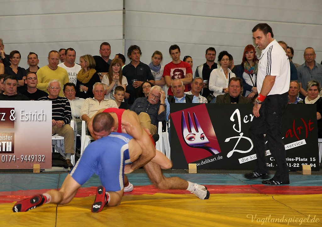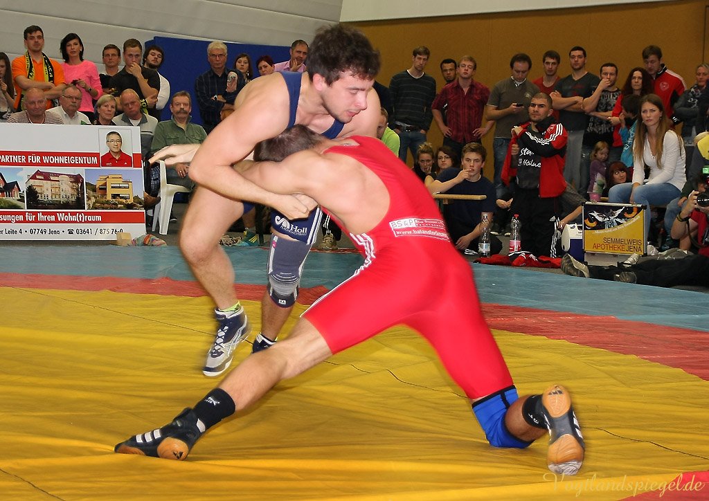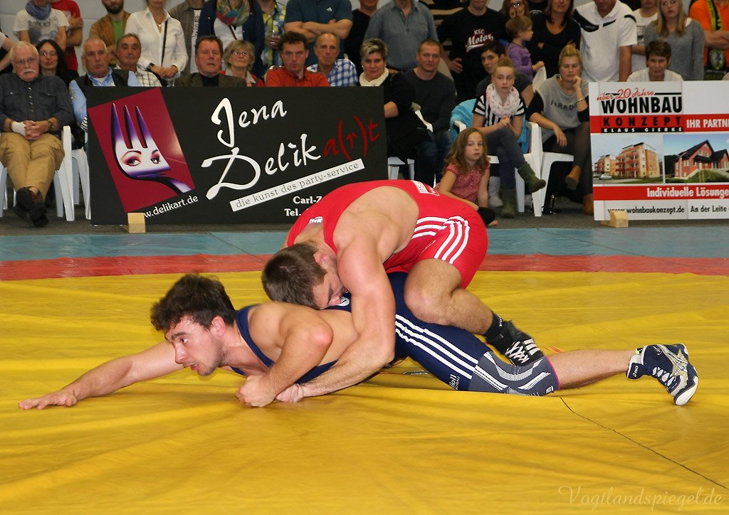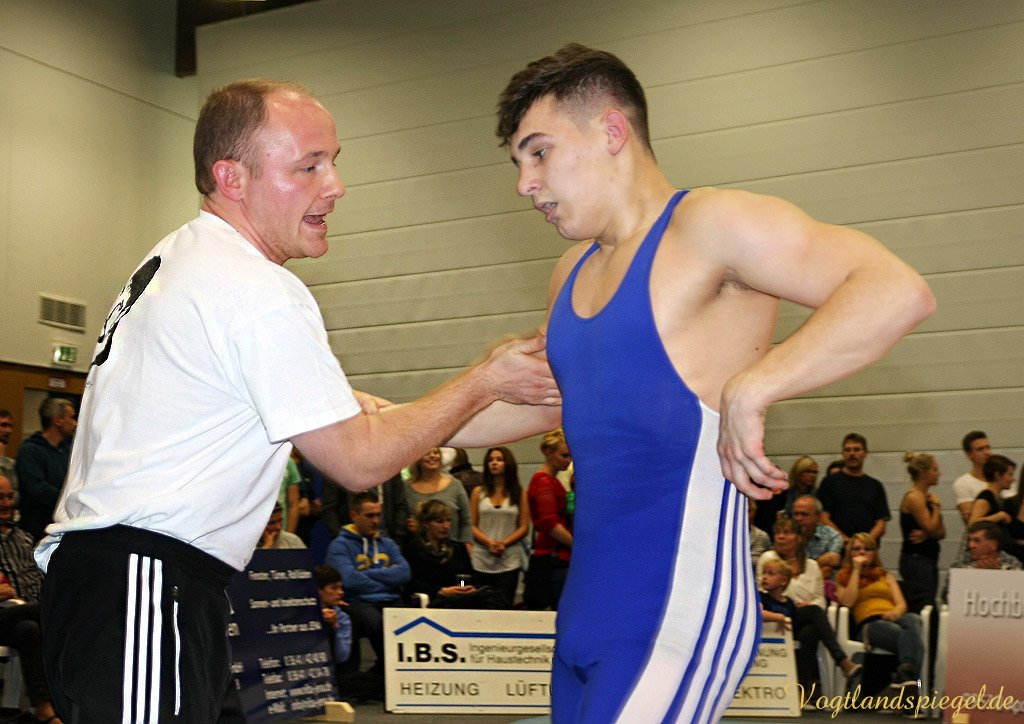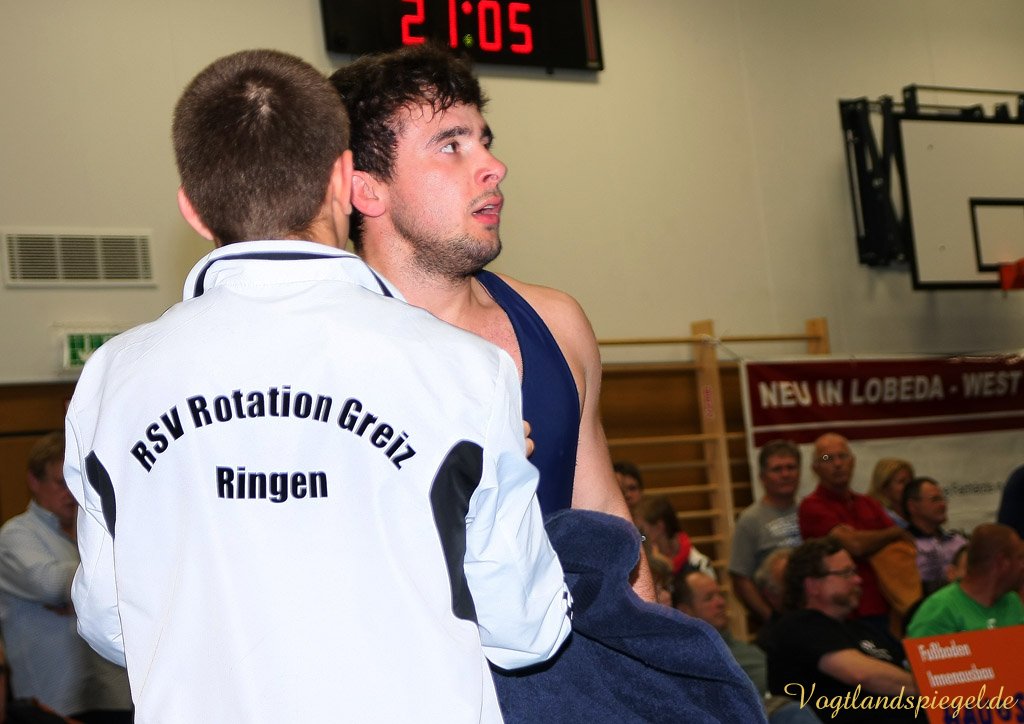 Nach drei Rollen am Boden nach rechts und weiteren zwei in die entgegengesetzte Richtung war der Kampf bei 12:0 schon nach 1:36 Minuten beendet. (16:8) Auch Patryk Dublinowski (84 kg/Freistil) ging als klarer Favorit ins Rennen, knallte aber nach 8 Sekunden nach einem Hammer des pfeilschnellen Gagik Egiazarov mit den Schultern auf die Matte. Dann öffnete der Greizer allerdings seine Trickkiste und führte hauptsächlich durch Beinangriffe zur Pause 13:3. Noch einmal gelang dem Jenaer im zweiten Abschnitt eine Zweierwertung, diesmal als Konter, dann stand nach 21 Sekunden der 17:5 Erfolg fest. (16:8) Die begeisterten Greizer Fans skandierten: Au.., Au.., Auswärtssieg. Der für den dienstlich verhinderten Trainer Tino Hempel die Mannschaft betreuende Swen Lieberamm setzte im 74 kg Limit des freien Stils auf Nachwuchsmann Daniel Sartakov, der bereits in der Anfangsphase gegen den ehemaligen Kaderringer Rüdiger Kabus in Rückstand geriet. Er kämpfte aber beherzt bis zum Schluss weiter, musste aber eine 0:7 Niederlage einstecken. (20:11) Im letzten Kampf gab es das ewig junge Duell, wie Hallensprecher Lars Wolf ankündigte, zwischen Toni Stade (74 kg/greco) und dem tschechischen Vizemeister Karel Hanak. Als der Tscheche zu Boden musste, konnte ihn der Greizer zweimal von vorn ankippen und ging so 4:0 in Führung. Beide Aktionen waren grenzwertig, der Kari hatte aber die beste Sicht. Der deutsche Vizemeister brachte die Führung geschickt, auch in der Bodenlage als Untermann über die Zeit. Am 22:11 Erfolg der Greizer gab es nichts mehr zu rütteln. ähnlich wie in Pausa hatte man aber nun den Kampfrichter als Schuldigen für die Heimniederlage ausgemacht. Hanak erhielt nach der offiziellen Verkündung der Siegermannschaft nach einem deutlichen Fingerzeig gegen den Kampfrichter die rote Karte.