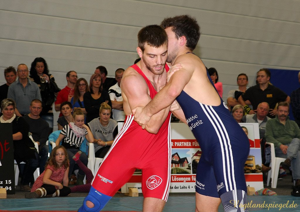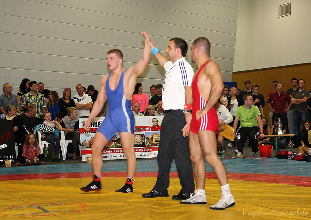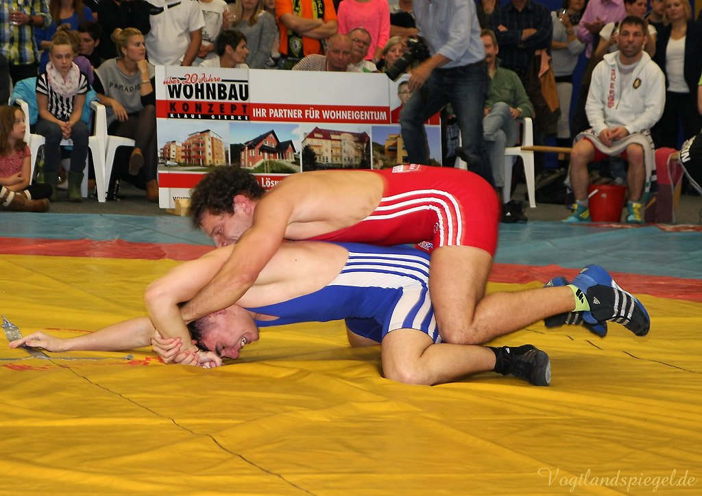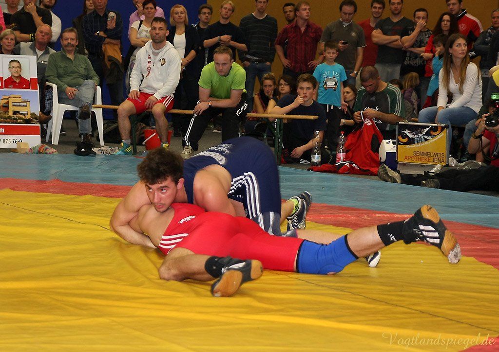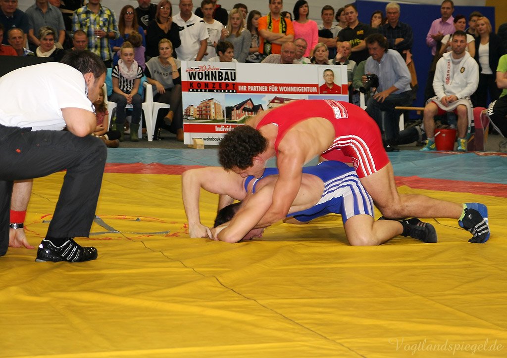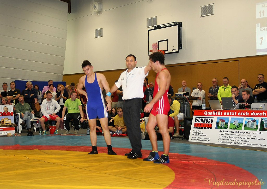 Nach drei Rollen am Boden nach rechts und weiteren zwei in die entgegengesetzte Richtung war der Kampf bei 12:0 schon nach 1:36 Minuten beendet. (16:8) Auch Patryk Dublinowski (84 kg/Freistil) ging als klarer Favorit ins Rennen, knallte aber nach 8 Sekunden nach einem Hammer des pfeilschnellen Gagik Egiazarov mit den Schultern auf die Matte. Dann öffnete der Greizer allerdings seine Trickkiste und führte hauptsächlich durch Beinangriffe zur Pause 13:3. Noch einmal gelang dem Jenaer im zweiten Abschnitt eine Zweierwertung, diesmal als Konter, dann stand nach 21 Sekunden der 17:5 Erfolg fest. (16:8) Die begeisterten Greizer Fans skandierten: Au.., Au.., Auswärtssieg. Der für den dienstlich verhinderten Trainer Tino Hempel die Mannschaft betreuende Swen Lieberamm setzte im 74 kg Limit des freien Stils auf Nachwuchsmann Daniel Sartakov, der bereits in der Anfangsphase gegen den ehemaligen Kaderringer Rüdiger Kabus in Rückstand geriet. Er kämpfte aber beherzt bis zum Schluss weiter, musste aber eine 0:7 Niederlage einstecken. (20:11) Im letzten Kampf gab es das ewig junge Duell, wie Hallensprecher Lars Wolf ankündigte, zwischen Toni Stade (74 kg/greco) und dem tschechischen Vizemeister Karel Hanak. Als der Tscheche zu Boden musste, konnte ihn der Greizer zweimal von vorn ankippen und ging so 4:0 in Führung. Beide Aktionen waren grenzwertig, der Kari hatte aber die beste Sicht. Der deutsche Vizemeister brachte die Führung geschickt, auch in der Bodenlage als Untermann über die Zeit. Am 22:11 Erfolg der Greizer gab es nichts mehr zu rütteln. ähnlich wie in Pausa hatte man aber nun den Kampfrichter als Schuldigen für die Heimniederlage ausgemacht. Hanak erhielt nach der offiziellen Verkündung der Siegermannschaft nach einem deutlichen Fingerzeig gegen den Kampfrichter die rote Karte.