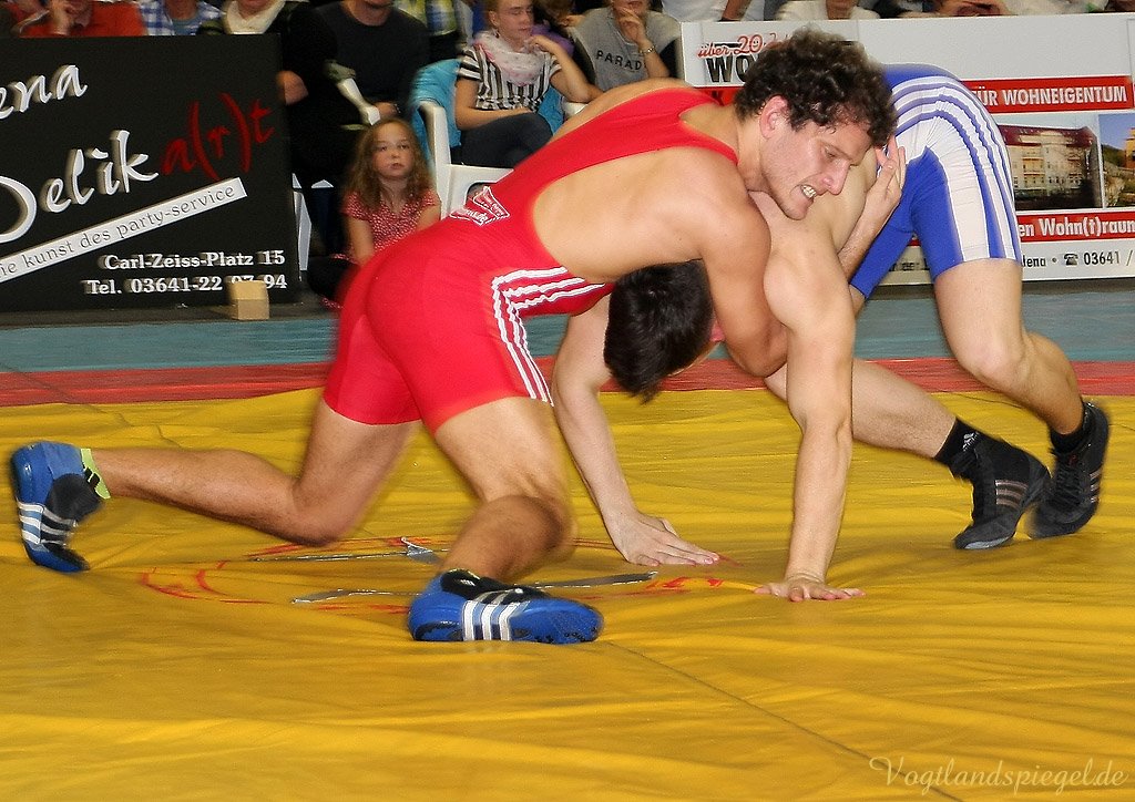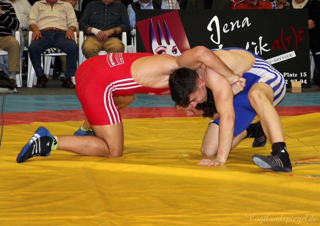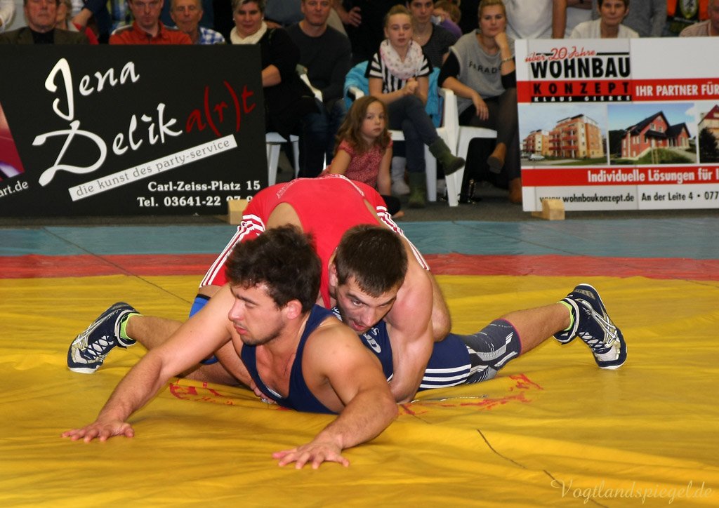 Die Greizer konnten aus verschiedenen Gründen zum Abschluss der Vorrunde nicht mit ihrer stärksten Mannschaft antreten. Trotzdem konnte mit viel Kampfgeist und Herz vor geschätzt 400 Zuschauern ein überzeugender Sieg errungen werden. Heißester Favorit auf Greizer Seite war Vladimir Codreanu (55 kg/Freistil), der zum Auftakt auf den erst 14-jährigen Joel Wrensch traf und diesen in nur 55 Sekunden beim Stande von 10:0 schulterte. (Kampfstand aus Greizer Sicht: 4:0) Jetzt hat es auch die Greizer erwischt, erstmals in dieser Saison konnten sie eine Gewichtsklasse nicht besetzen. So kam im 120 kg-Limit der DM-Dritte Toni Bernhardt kampflos zu den Punkten. (4:4) Mateusz Bierzanowski (60 kg/greco) traf auf den 34-jährigen Robert Lehmann, der mit diesem Kampf seine aktive Laufbahn beendete. Beide kämpften verbissen, ohne sich technische Vorteile zu erarbeiten. Beim Publikum kam langsam Derbystimmung auf. Der erfahren Kampfrichter Jörg Jähnichen aus Gelenau vergab zuerst eine Einserwertung an den Jenenser, dann an den Greizer. Da es im Ringen schon lange kein Unentschieden mehr gibt, entschied die letzte Wertung über den Sieg, der so nach Greiz ging. Ein Remis wäre wohl gerechter gewesen. (6:5) Die Vergleiche zwischen Sebastian Wendel (96 kg/Freistil) und Michael Dengler, der ehemaligen Zimmergenossen an der Sportschule, gehen immer sehr knapp aus. Bei der deutschen Meisterschaft siegte der wieder nach Jena zurückgekehrte Ex-Greizer. Diesmal konnte Wendel wieder triumphieren. Mit einer starken kämpferischen Leistung bog er einen 0:1 Rückstand mit Hilfe zweier 30 Sekunden-Strafen in einen 2:1 Erfolg um und trotzte auch der Schlussoffensive des Jenaers. (8:6) Radoslaw Kisiel (66 kg/Freistil) musste sich mit dem deutschen Vizemeister Mario Koch auseinandersetzen. Es kam zu einem hochklassigen und punktreichen Gefecht. Der Greizer ging zwar durch Beinangriff 2:0 in Führung, doch der 35-jährige Routinier machte aus einer Aktion noch vor der Pause 6 Punkte. Kisiel kämpfte sich auf 5:6 heran. Als es so aussah, als ob der Jenenser konditionell abbauen würde, setzte dieser noch einmal alles auf eine Karte und drängte den nie aufgebenden Kisiel von der Matte: 5:7. So ging es mit 9:8 für Greiz in die Pause, nach der Tom Linke (84 kg/greco) auf Thomas Leffler traf. Der Greizer musste in der zweiten Minute zu Boden, gab aber keinen Punkt ab, sondern überraschte seinen Widerpart mit einem Angriff sofort nach Beginn des Standkampfes. In der zweiten Halbzeit baute er mit einem Konter die Führung auf 4:0 aus und kam kampfbestimmend noch zum 5:0. Eine starke Leistung. (8:12) Als klarer Favorit traf der 18-jährige Lucas Bast (66 kg/greco) auf den gleichaltrigen Tillmann-Joseph Germar. Nach etwas mehr als einer Minute brachte der Greizer seinen Gegner zu Boden. Dann ging alles sehr schnell.