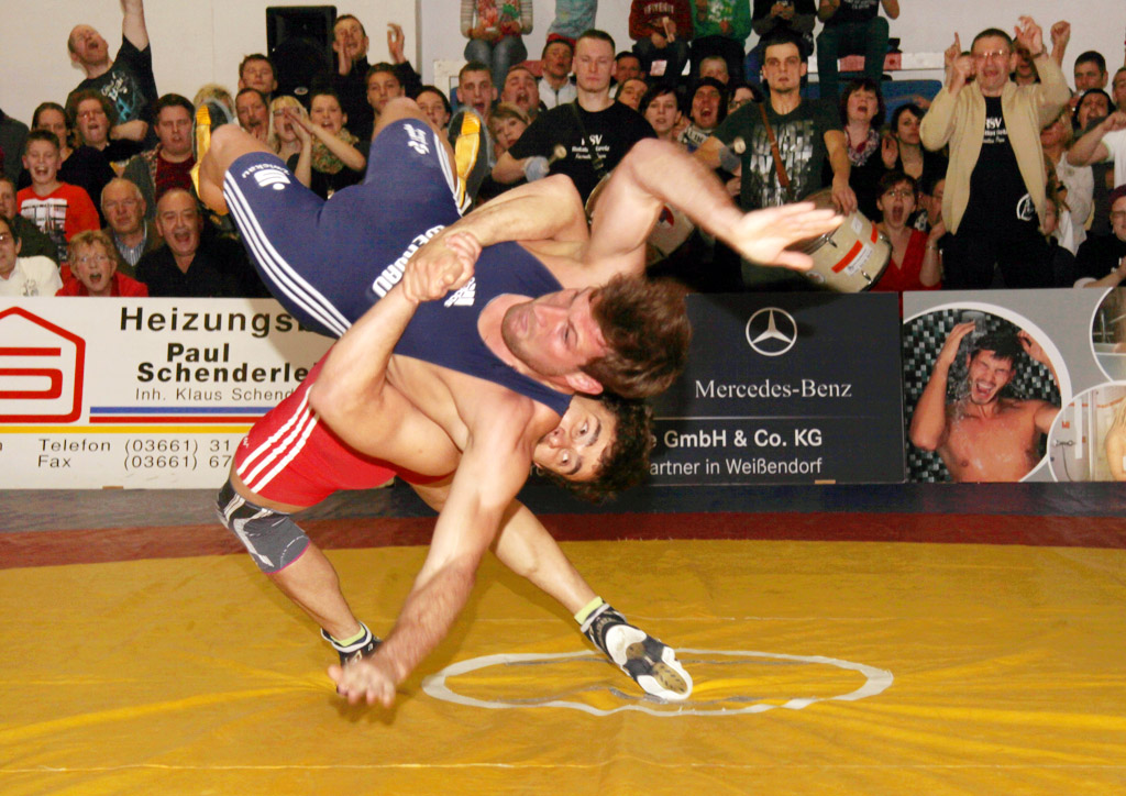 RSV Rotation Greiz gegen AC 1897 Werdau 20:13 74Akg Gr.-röm. Toni Stade (rot), RSV Rotation Greiz gegen Chris Wemme, AC 1897 Werdau. Foto:Günter StuchlikGREIZ. Der Tenor in den Presseveröffentlichungen der letzten Wochen zwischen dem Erzgebirge und Mecklenburg lautete meistens: In der 2.Bundesliga Nord kann jeder jeden schlagen. Nur gegen Greiz gewinnt keiner. Wer nun daraus schließen wollte, der weitere Saisonverlauf des RSV Rotation Greiz würde ein Selbstläufer, sah sich getäuscht. Der in der Rückrunde noch unbezwungene AC 1897 Werdau war, wie angekündigt, der wohl stärkste Widersacher in diesem Jahr. Erstmals in dieser Saison lagen die Greizer Ringer zur Halbzeit weit zurück (5:9). So entwickelte sich ein spannender dramatischer Kampf, bei dem die Zuschauer voll auf ihre Kosten kamen. Allen Unkenrufen zum Trotz war die Jahnturnhalle trotz des zeitgleich laufenden Fußballspiels Dortmund gegen München wieder hervorragend besucht. Entsprechend der Leistungen ihres Teams in den letzten Wochen reisten auch zahlreiche Fans aus Westsachsen an. Trotz beträchtlichen Blechschadens bei einem Auffahrunfall 200 Meter von der Jahnturnhalle entfernt, war die erste Sorge eines Werdauer Anhängers, nun die ersten Kämpfe zu verpassen. Beide Trainer hatten ihre Mannschaft gegenüber den letzten Kämpfen umgestellt, so dass sich unerwartete Konstellationen ergaben. Eine erwartete Paarung gab es zum Auftakt als Vladimir Codreanu (55 kg/greco) auf Kirk Reimer traf. Der Moldawier wirkte robuster, beherrschte den Dritten der deutschen Meisterschaften im Standkampf, kam aber kaum zu Punkten. Nach fünf Minuten führte er 4:1, doch ein blitzschnell gezogener Kopf-Hüft-Schwung des Ex-Lugauers brachte die Überraschung. Der Greizer lag 20 Sekunden vor Schluss auf beiden Schultern und hatte seinen ersten Kampf verloren.(Zwischenstand: 0:4) Die Werdauer Fans feierten und hofften nun auf ihren Juniorenmeister Ilja Litvinov, der Sebastian Wendel (120 kg/Freistilals Gegner hatte. Bundestrainer Thiele hatte den Neu-Werdauer den Start in der Vorrunde im 96 kg-Limit verboten, was, wie an seinem muskulösem Oberkörper zu erkennen war, nicht ohne Erfolg geblieben ist. Doch der Greizer ließ sich wegen der 10 kg Gewichtsdifferenz nicht ins Bockshorn jagen. Mit einer zugegeben etwas unorthodoxen Technik brachte er Litvinov in die Brückenlage, hatte sogar die Chance zum Schultersieg. Der etwas nervös wirkende Schiedsrichter Marco Scalisi aus Berlin übersah hier zwar eine Wertung für den Greizer, doch dieser punktete hauptsächlich durch Konter auf Beinangriffe munter weiter und sicherte sich einen ungefährdeten 6:0 Sieg (3:4). Dramatik pur im Kampf zwischen Merlin Sewina (60 kg/Freistil) und dem Dritten der diesjährigen Jugendmeisterschaften Deward Stier. Warum der Kampfrichter so lange brauchte um die Führung des Greizers anzuzeigen, bleibt sein Geheimnis. Doch der Werdauer kam durch Beinangriff zur 2:1 Halbzeitführung. Was Trainer Tino Hempel in der Pause zu seinem Schützling sagte, ist nicht bekannt, aber der Greizer kam völlig verändert aus der Ecke, drehte innerhalb von 18 Sekunden den Kampf auf 5:2. und es ging so weiter. Durch Beinangriffe und Rollen stand es bald 12:2. Als die Fans skandierten: Einer geht noch, lief der Greizer in einem Achselwurf und kam von der Rolle. Der Kampf bot alles, am Ende siegte der Greizer mit 12:9 und beide Sportler lagen völlig verausgabt am Boden. (5:5) Mit Boris Eisenstein (96 kg/greco) und dem mehrfachen tschechischen Meister Vojtech Kukla trafen zwei etwa gleichstarke Athleten aufeinander, die verbissen mit großer Härte kämpften, sich in ihren Aktionen aber jeweils neutralisierten. Auch im Bodenkampf kam nichts zählbares zu Stande. Zwanzig Sekunden vor Schluss disqualifizierte der Kampfrichter beide. (5:5) Einen schweren Stand hatte Brian Tewes (66 kg/greco) gegen Michal Novak, der seit 2002 bei den tschechischen Meisterschaften nicht zu schlagen war. Trotz starker Gegenwehr kam er vor allem in den beiden letzten Kampfminuten immer mehr in die Defensive und wurde 35 Sekunden vor Schluss beim Stande von 0:5 disqualifiziert. (5:9) Patryk Dublinowski (84 kg/Freistil) erkämpfte gegen den eine Klasse aufgerückten Kirk Haupt ohne Probleme in zwei Minuten einen 11:0 Überlegenheitssieg. (9:9) Mit einer phänomenalen Abwehrleistung brachte Radoslaw Kisiel (66 kg/Freistil) den RSV erstmals in Front. Der ungarische Spitzenringer Jozsef Molnar machte zwar den Kampf, griff ständig an, der Greizer entwand sich aber immer wieder geschickt auch aus den schier aussichtslosesten Situationen und siegte mit 4:1. (11:10) Tom Linke (84 kg/greco) war dem aufgerückten tschechischen Meister der letzten beiden Jahre Pavel Powada klar überlegen. Dem auf Grund seiner bereits gefällten Urteile nun unter Zugzwang stehenden Kampfrichter blieb nichts anderes übrig als den Werdauer beim Stande von 0:7 nach fünf Minuten zu disqualifizieren. Der deutsche Vizemeister Toni Stade (74 kg/greco) war eigentlich auf Revanche gegen Powada eingestellt, musste sich aber mit dem gleichaltrigen Chris Wemme auseinandersetzen, dem er technisch und physisch klar überlegen war. Der Greizer sammelte Punkt auf Punkt, dass dem Kampfrichter keine Zeit blieb Verwarnungen an den Werdauer zu vergeben. Beim Stande von 7:0 erwischte der Greizer Wemme an der Hüfte und beendete den Kampf mit einem lehrbuchmäßigen Wurf, der eine 5-er Wertung brachte, in nur 98 Sekunden. (19:10) Im letzten Kampf traf Konstantin Sommer (74 kg/Freistil), der den Vorkampf gewonnen hatte, auf William Stier. Der Greizer lag zur Pause 1:1 in Führung (das klingt zwar widersinnig, ist aber beim Ringen aber möglich), geriet aber 1:3 in Rückstand. Im Bestreben auszugleichen versuchte Sommer den am Kopf geschnürten Gegner mit einer Drehung um die eigene Längsachse an der Hüfte zu erwischen. Das gelang zwar nicht, aber die Zweierwertung für Stier war eine Fehlentscheidung, die den Kampf mit einer wohl auch nicht gerechtfer