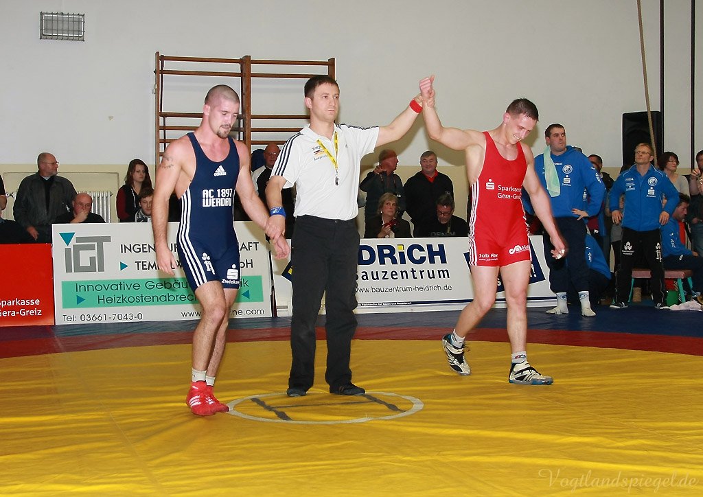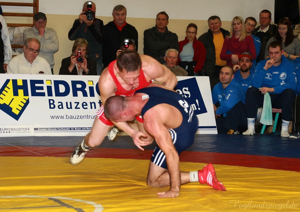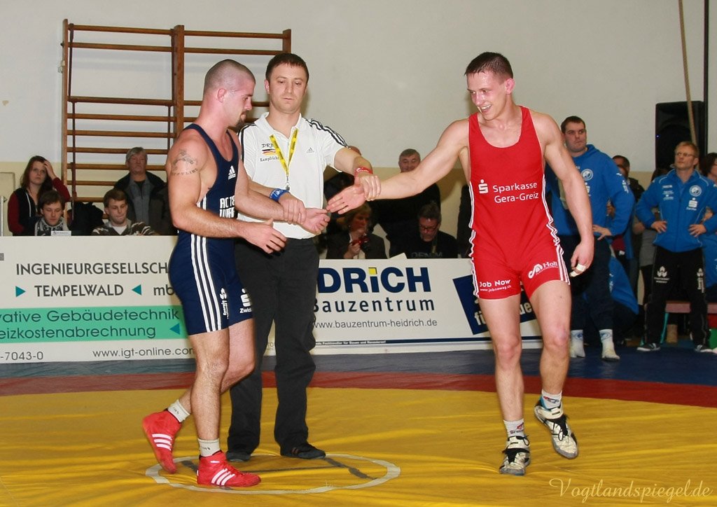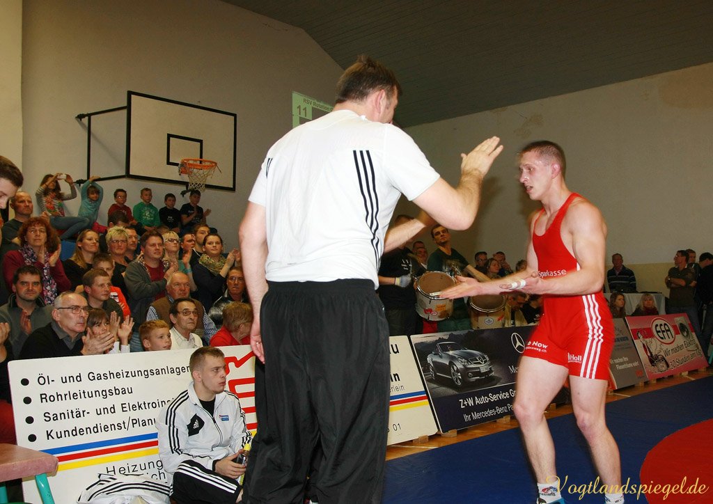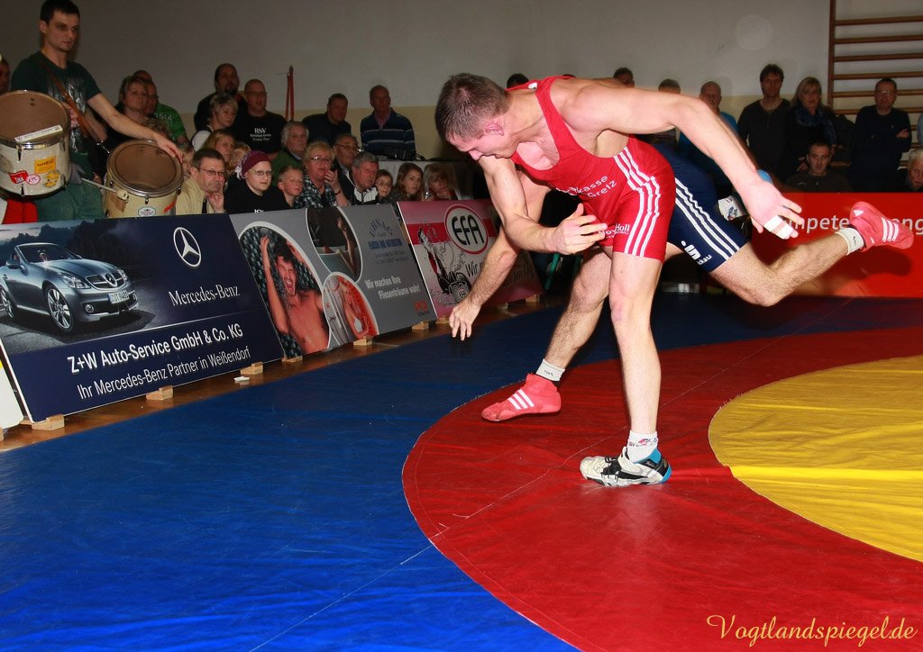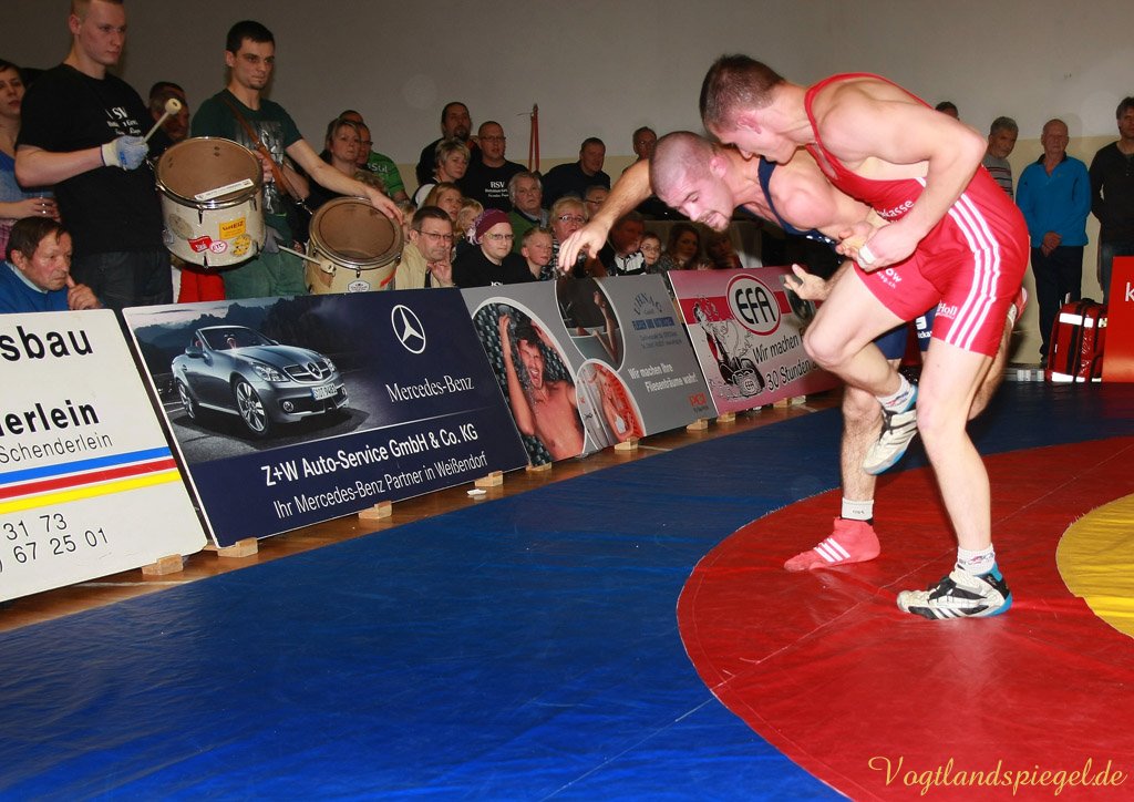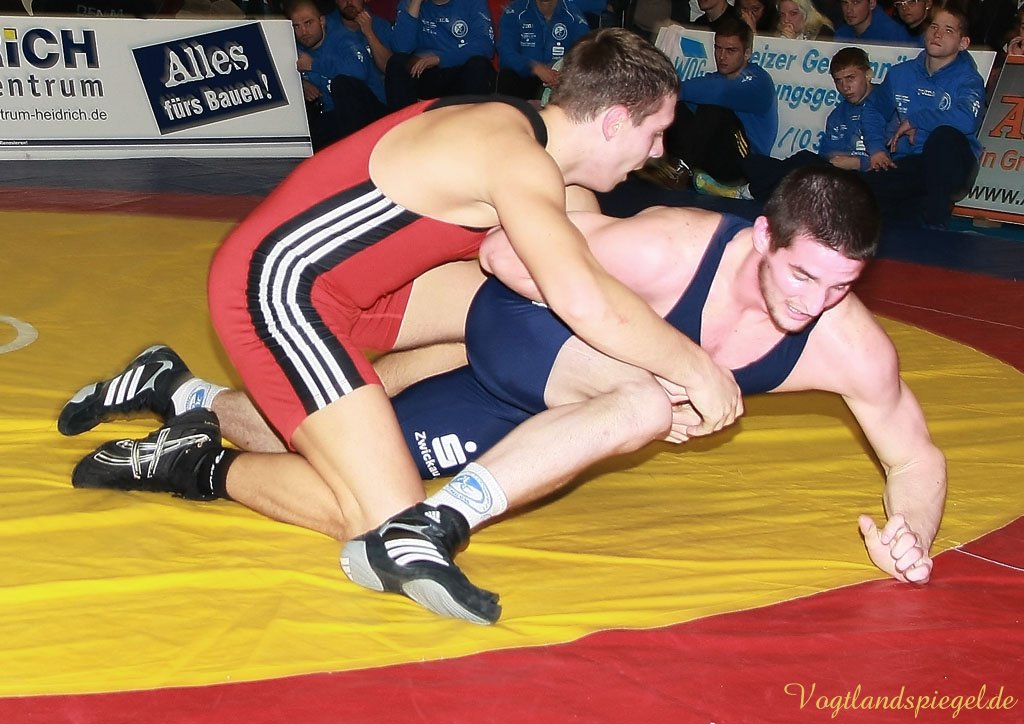 RSV Rotation Greiz gegen AC 1897 Werdau 20:13 74Akg Gr.-röm. Toni Stade (rot), RSV Rotation Greiz gegen Chris Wemme, AC 1897 Werdau. Foto:Günter StuchlikGREIZ. Der Tenor in den Presseveröffentlichungen der letzten Wochen zwischen dem Erzgebirge und Mecklenburg lautete meistens: In der 2.Bundesliga Nord kann jeder jeden schlagen. Nur gegen Greiz gewinnt keiner. Wer nun daraus schließen wollte, der weitere Saisonverlauf des RSV Rotation Greiz würde ein Selbstläufer, sah sich getäuscht. Der in der Rückrunde noch unbezwungene AC 1897 Werdau war, wie angekündigt, der wohl stärkste Widersacher in diesem Jahr. Erstmals in dieser Saison lagen die Greizer Ringer zur Halbzeit weit zurück (5:9). So entwickelte sich ein spannender dramatischer Kampf, bei dem die Zuschauer voll auf ihre Kosten kamen. Allen Unkenrufen zum Trotz war die Jahnturnhalle trotz des zeitgleich laufenden Fußballspiels Dortmund gegen München wieder hervorragend besucht. Entsprechend der Leistungen ihres Teams in den letzten Wochen reisten auch zahlreiche Fans aus Westsachsen an. Trotz beträchtlichen Blechschadens bei einem Auffahrunfall 200 Meter von der Jahnturnhalle entfernt, war die erste Sorge eines Werdauer Anhängers, nun die ersten Kämpfe zu verpassen. Beide Trainer hatten ihre Mannschaft gegenüber den letzten Kämpfen umgestellt, so dass sich unerwartete Konstellationen ergaben. Eine erwartete Paarung gab es zum Auftakt als Vladimir Codreanu (55 kg/greco) auf Kirk Reimer traf. Der Moldawier wirkte robuster, beherrschte den Dritten der deutschen Meisterschaften im Standkampf, kam aber kaum zu Punkten. Nach fünf Minuten führte er 4:1, doch ein blitzschnell gezogener Kopf-Hüft-Schwung des Ex-Lugauers brachte die Überraschung. Der Greizer lag 20 Sekunden vor Schluss auf beiden Schultern und hatte seinen ersten Kampf verloren.(Zwischenstand: 0:4) Die Werdauer Fans feierten und hofften nun auf ihren Juniorenmeister Ilja Litvinov, der Sebastian Wendel (120 kg/Freistilals Gegner hatte. Bundestrainer Thiele hatte den Neu-Werdauer den Start in der Vorrunde im 96 kg-Limit verboten, was, wie an seinem muskulösem Oberkörper zu erkennen war, nicht ohne Erfolg geblieben ist. Doch der Greizer ließ sich wegen der 10 kg Gewichtsdifferenz nicht ins Bockshorn jagen. Mit einer zugegeben etwas unorthodoxen Technik brachte er Litvinov in die Brückenlage, hatte sogar die Chance zum Schultersieg. Der etwas nervös wirkende Schiedsrichter Marco Scalisi aus Berlin übersah hier zwar eine Wertung für den Greizer, doch dieser punktete hauptsächlich durch Konter auf Beinangriffe munter weiter und sicherte sich einen ungefährdeten 6:0 Sieg (3:4). Dramatik pur im Kampf zwischen Merlin Sewina (60 kg/Freistil) und dem Dritten der diesjährigen Jugendmeisterschaften Deward Stier. Warum der Kampfrichter so lange brauchte um die Führung des Greizers anzuzeigen, bleibt sein Geheimnis. Doch der Werdauer kam durch Beinangriff zur 2:1 Halbzeitführung. Was Trainer Tino Hempel in der Pause zu seinem Schützling sagte, ist nicht bekannt, aber der Greizer kam völlig verändert aus der Ecke, drehte innerhalb von 18 Sekunden den Kampf auf 5:2. und es ging so weiter. Durch Beinangriffe und Rollen stand es bald 12:2. Als die Fans skandierten: Einer geht noch, lief der Greizer in einem Achselwurf und kam von der Rolle. Der Kampf bot alles, am Ende siegte der Greizer mit 12:9 und beide Sportler lagen völlig verausgabt am Boden. (5:5) Mit Boris Eisenstein (96 kg/greco) und dem mehrfachen tschechischen Meister Vojtech Kukla trafen zwei etwa gleichstarke Athleten aufeinander, die verbissen mit großer Härte kämpften, sich in ihren Aktionen aber jeweils neutralisierten. Auch im Bodenkampf kam nichts zählbares zu Stande. Zwanzig Sekunden vor Schluss disqualifizierte der Kampfrichter beide. (5:5) Einen schweren Stand hatte Brian Tewes (66 kg/greco) gegen Michal Novak, der seit 2002 bei den tschechischen Meisterschaften nicht zu schlagen war. Trotz starker Gegenwehr kam er vor allem in den beiden letzten Kampfminuten immer mehr in die Defensive und wurde 35 Sekunden vor Schluss beim Stande von 0:5 disqualifiziert. (5:9) Patryk Dublinowski (84 kg/Freistil) erkämpfte gegen den eine Klasse aufgerückten Kirk Haupt ohne Probleme in zwei Minuten einen 11:0 Überlegenheitssieg. (9:9) Mit einer phänomenalen Abwehrleistung brachte Radoslaw Kisiel (66 kg/Freistil) den RSV erstmals in Front. Der ungarische Spitzenringer Jozsef Molnar machte zwar den Kampf, griff ständig an, der Greizer entwand sich aber immer wieder geschickt auch aus den schier aussichtslosesten Situationen und siegte mit 4:1. (11:10) Tom Linke (84 kg/greco) war dem aufgerückten tschechischen Meister der letzten beiden Jahre Pavel Powada klar überlegen. Dem auf Grund seiner bereits gefällten Urteile nun unter Zugzwang stehenden Kampfrichter blieb nichts anderes übrig als den Werdauer beim Stande von 0:7 nach fünf Minuten zu disqualifizieren. Der deutsche Vizemeister Toni Stade (74 kg/greco) war eigentlich auf Revanche gegen Powada eingestellt, musste sich aber mit dem gleichaltrigen Chris Wemme auseinandersetzen, dem er technisch und physisch klar überlegen war. Der Greizer sammelte Punkt auf Punkt, dass dem Kampfrichter keine Zeit blieb Verwarnungen an den Werdauer zu vergeben. Beim Stande von 7:0 erwischte der Greizer Wemme an der Hüfte und beendete den Kampf mit einem lehrbuchmäßigen Wurf, der eine 5-er Wertung brachte, in nur 98 Sekunden. (19:10) Im letzten Kampf traf Konstantin Sommer (74 kg/Freistil), der den Vorkampf gewonnen hatte, auf William Stier. Der Greizer lag zur Pause 1:1 in Führung (das klingt zwar widersinnig, ist aber beim Ringen aber möglich), geriet aber 1:3 in Rückstand. Im Bestreben auszugleichen versuchte Sommer den am Kopf geschnürten Gegner mit einer Drehung um die eigene Längsachse an der Hüfte zu erwischen. Das gelang zwar nicht, aber die Zweierwertung für Stier war eine Fehlentscheidung, die den Kampf mit einer wohl auch nicht gerechtfer