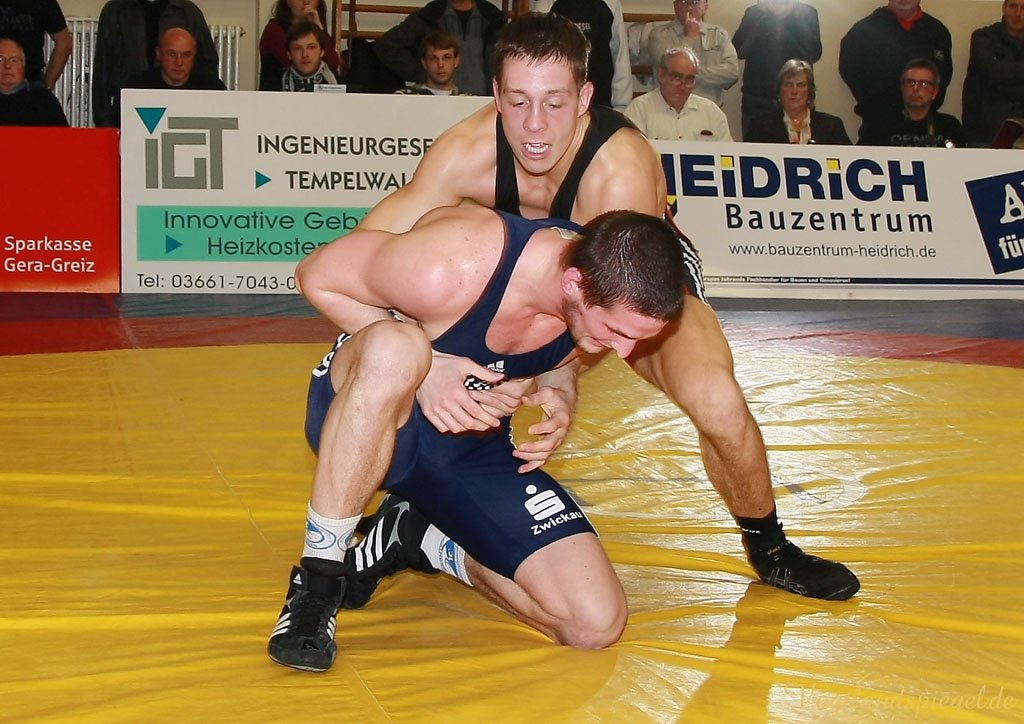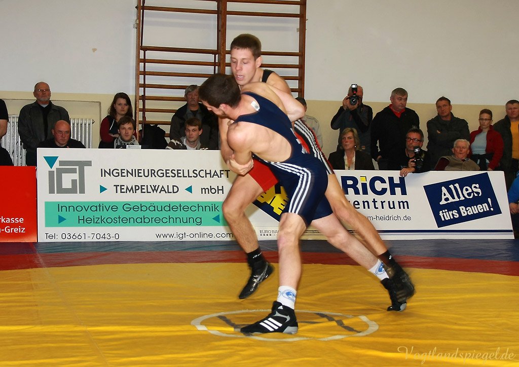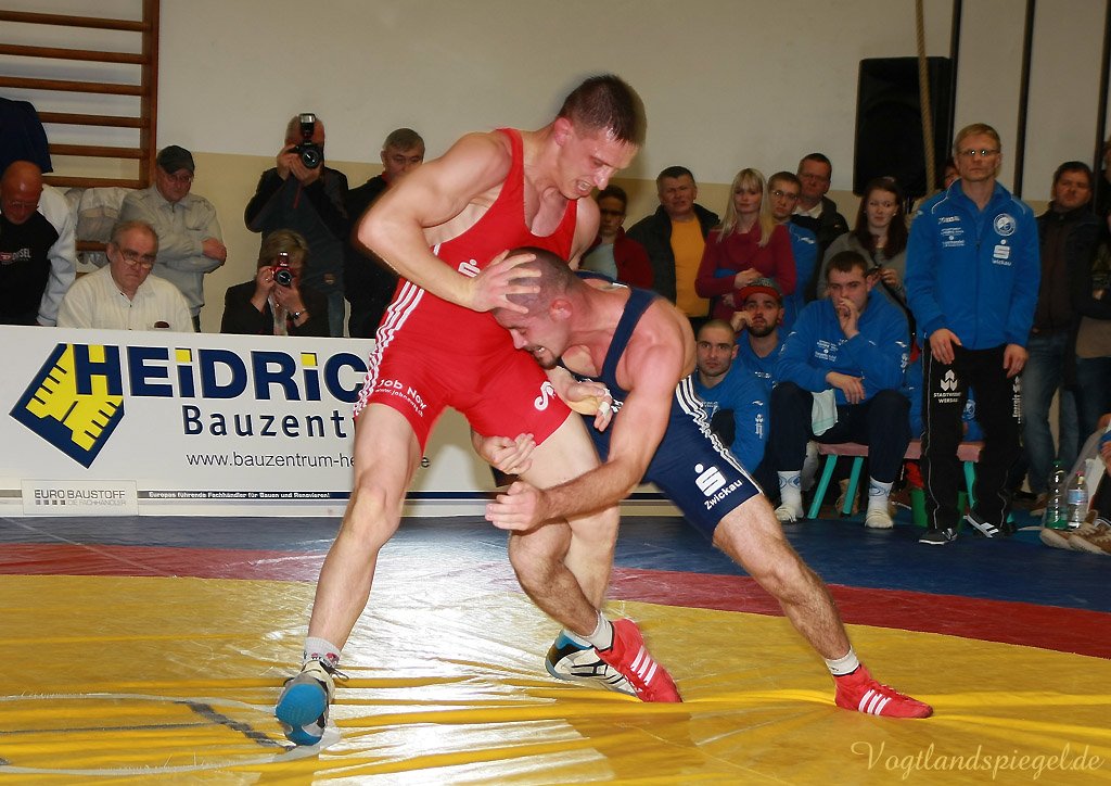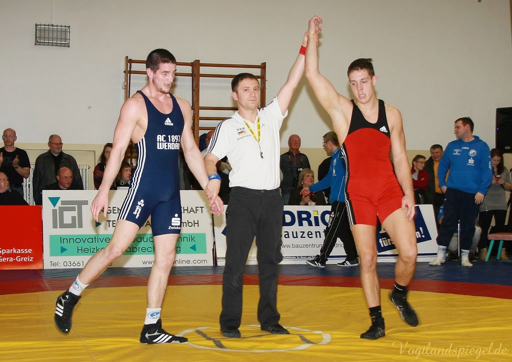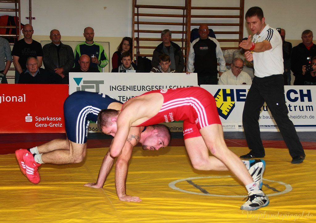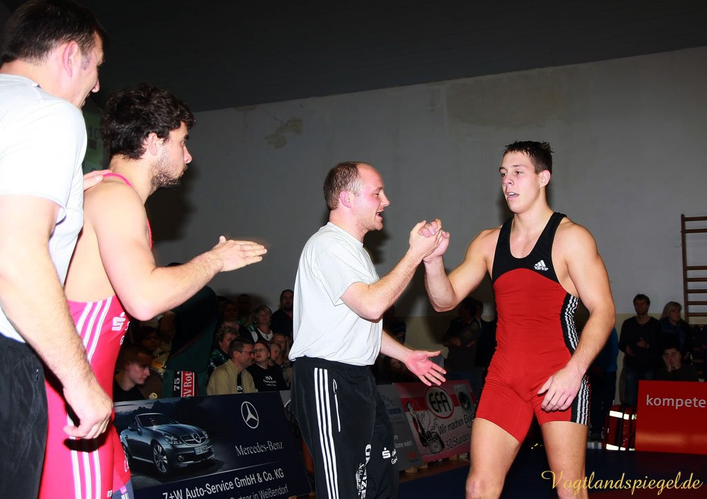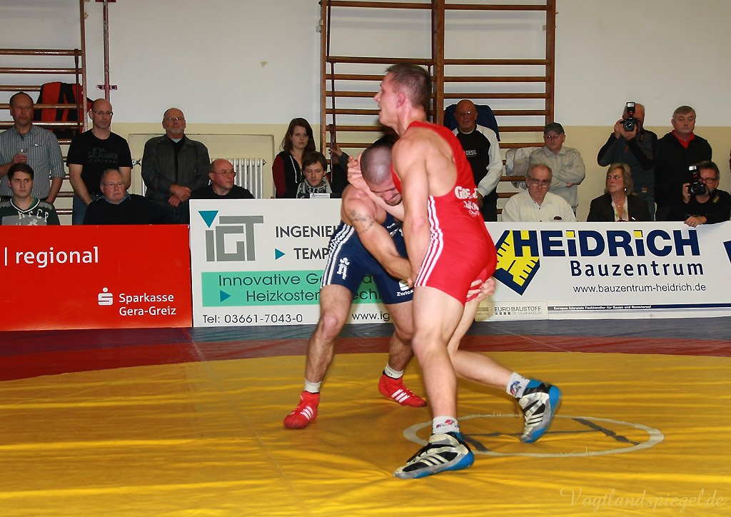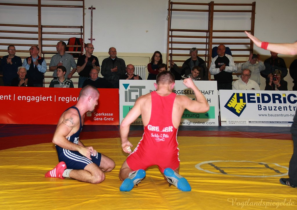RSV Rotation Greiz gegen AC 1897 Werdau 20:13 74Akg Gr.-röm. Toni Stade (rot), RSV Rotation Greiz gegen Chris Wemme, AC 1897 Werdau. Foto:Günter StuchlikGREIZ. Der Tenor in den Presseveröffentlichungen der letzten Wochen zwischen dem Erzgebirge und Mecklenburg lautete meistens: In der 2.Bundesliga Nord kann jeder jeden schlagen. Nur gegen Greiz gewinnt keiner. Wer nun daraus schließen wollte, der weitere Saisonverlauf des RSV Rotation Greiz würde ein Selbstläufer, sah sich getäuscht. Der in der Rückrunde noch unbezwungene AC 1897 Werdau war, wie angekündigt, der wohl stärkste Widersacher in diesem Jahr. Erstmals in dieser Saison lagen die Greizer Ringer zur Halbzeit weit zurück (5:9). So entwickelte sich ein spannender dramatischer Kampf, bei dem die Zuschauer voll auf ihre Kosten kamen. Allen Unkenrufen zum Trotz war die Jahnturnhalle trotz des zeitgleich laufenden Fußballspiels Dortmund gegen München wieder hervorragend besucht. Entsprechend der Leistungen ihres Teams in den letzten Wochen reisten auch zahlreiche Fans aus Westsachsen an. Trotz beträchtlichen Blechschadens bei einem Auffahrunfall 200 Meter von der Jahnturnhalle entfernt, war die erste Sorge eines Werdauer Anhängers, nun die ersten Kämpfe zu verpassen. Beide Trainer hatten ihre Mannschaft gegenüber den letzten Kämpfen umgestellt, so dass sich unerwartete Konstellationen ergaben. Eine erwartete Paarung gab es zum Auftakt als Vladimir Codreanu (55 kg/greco) auf Kirk Reimer traf. Der Moldawier wirkte robuster, beherrschte den Dritten der deutschen Meisterschaften im Standkampf, kam aber kaum zu Punkten. Nach fünf Minuten führte er 4:1, doch ein blitzschnell gezogener Kopf-Hüft-Schwung des Ex-Lugauers brachte die Überraschung. Der Greizer lag 20 Sekunden vor Schluss auf beiden Schultern und hatte seinen ersten Kampf verloren.(Zwischenstand: 0:4) Die Werdauer Fans feierten und hofften nun auf ihren Juniorenmeister Ilja Litvinov, der Sebastian Wendel (120 kg/Freistilals Gegner hatte. Bundestrainer Thiele hatte den Neu-Werdauer den Start in der Vorrunde im 96 kg-Limit verboten, was, wie an seinem muskulösem Oberkörper zu erkennen war, nicht ohne Erfolg geblieben ist. Doch der Greizer ließ sich wegen der 10 kg Gewichtsdifferenz nicht ins Bockshorn jagen. Mit einer zugegeben etwas unorthodoxen Technik brachte er Litvinov in die Brückenlage, hatte sogar die Chance zum Schultersieg. Der etwas nervös wirkende Schiedsrichter Marco Scalisi aus Berlin übersah hier zwar eine Wertung für den Greizer, doch dieser punktete hauptsächlich durch Konter auf Beinangriffe munter weiter und sicherte sich einen ungefährdeten 6:0 Sieg (3:4). Dramatik pur im Kampf zwischen Merlin Sewina (60 kg/Freistil) und dem Dritten der diesjährigen Jugendmeisterschaften Deward Stier. Warum der Kampfrichter so lange brauchte um die Führung des Greizers anzuzeigen, bleibt sein Geheimnis. Doch der Werdauer kam durch Beinangriff zur 2:1 Halbzeitführung. Was Trainer Tino Hempel in der Pause zu seinem Schützling sagte, ist nicht bekannt, aber der Greizer kam völlig verändert aus der Ecke, drehte innerhalb von 18 Sekunden den Kampf auf 5:2. und es ging so weiter. Durch Beinangriffe und Rollen stand es bald 12:2. Als die Fans skandierten: Einer geht noch, lief der Greizer in einem Achselwurf und kam von der Rolle. Der Kampf bot alles, am Ende siegte der Greizer mit 12:9 und beide Sportler lagen völlig verausgabt am Boden. (5:5) Mit Boris Eisenstein (96 kg/greco) und dem mehrfachen tschechischen Meister Vojtech Kukla trafen zwei etwa gleichstarke Athleten aufeinander, die verbissen mit großer Härte kämpften, sich in ihren Aktionen aber jeweils neutralisierten. Auch im Bodenkampf kam nichts zählbares zu Stande. Zwanzig Sekunden vor Schluss disqualifizierte der Kampfrichter beide. (5:5) Einen schweren Stand hatte Brian Tewes (66 kg/greco) gegen Michal Novak, der seit 2002 bei den tschechischen Meisterschaften nicht zu schlagen war. Trotz starker Gegenwehr kam er vor allem in den beiden letzten Kampfminuten immer mehr in die Defensive und wurde 35 Sekunden vor Schluss beim Stande von 0:5 disqualifiziert. (5:9) Patryk Dublinowski (84 kg/Freistil) erkämpfte gegen den eine Klasse aufgerückten Kirk Haupt ohne Probleme in zwei Minuten einen 11:0 Überlegenheitssieg. (9:9) Mit einer phänomenalen Abwehrleistung brachte Radoslaw Kisiel (66 kg/Freistil) den RSV erstmals in Front. Der ungarische Spitzenringer Jozsef Molnar machte zwar den Kampf, griff ständig an, der Greizer entwand sich aber immer wieder geschickt auch aus den schier aussichtslosesten Situationen und siegte mit 4:1. (11:10) Tom Linke (84 kg/greco) war dem aufgerückten tschechischen Meister der letzten beiden Jahre Pavel Powada klar überlegen. Dem auf Grund seiner bereits gefällten Urteile nun unter Zugzwang stehenden Kampfrichter blieb nichts anderes übrig als den Werdauer beim Stande von 0:7 nach fünf Minuten zu disqualifizieren. Der deutsche Vizemeister Toni Stade (74 kg/greco) war eigentlich auf Revanche gegen Powada eingestellt, musste sich aber mit dem gleichaltrigen Chris Wemme auseinandersetzen, dem er technisch und physisch klar überlegen war. Der Greizer sammelte Punkt auf Punkt, dass dem Kampfrichter keine Zeit blieb Verwarnungen an den Werdauer zu vergeben. Beim Stande von 7:0 erwischte der Greizer Wemme an der Hüfte und beendete den Kampf mit einem lehrbuchmäßigen Wurf, der eine 5-er Wertung brachte, in nur 98 Sekunden. (19:10) Im letzten Kampf traf Konstantin Sommer (74 kg/Freistil), der den Vorkampf gewonnen hatte, auf William Stier. Der Greizer lag zur Pause 1:1 in Führung (das klingt zwar widersinnig, ist aber beim Ringen aber möglich), geriet aber 1:3 in Rückstand. Im Bestreben auszugleichen versuchte Sommer den am Kopf geschnürten Gegner mit einer Drehung um die eigene Längsachse an der Hüfte zu erwischen. Das gelang zwar nicht, aber die Zweierwertung für Stier war eine Fehlentscheidung, die den Kampf mit einer wohl auch nicht gerechtfer