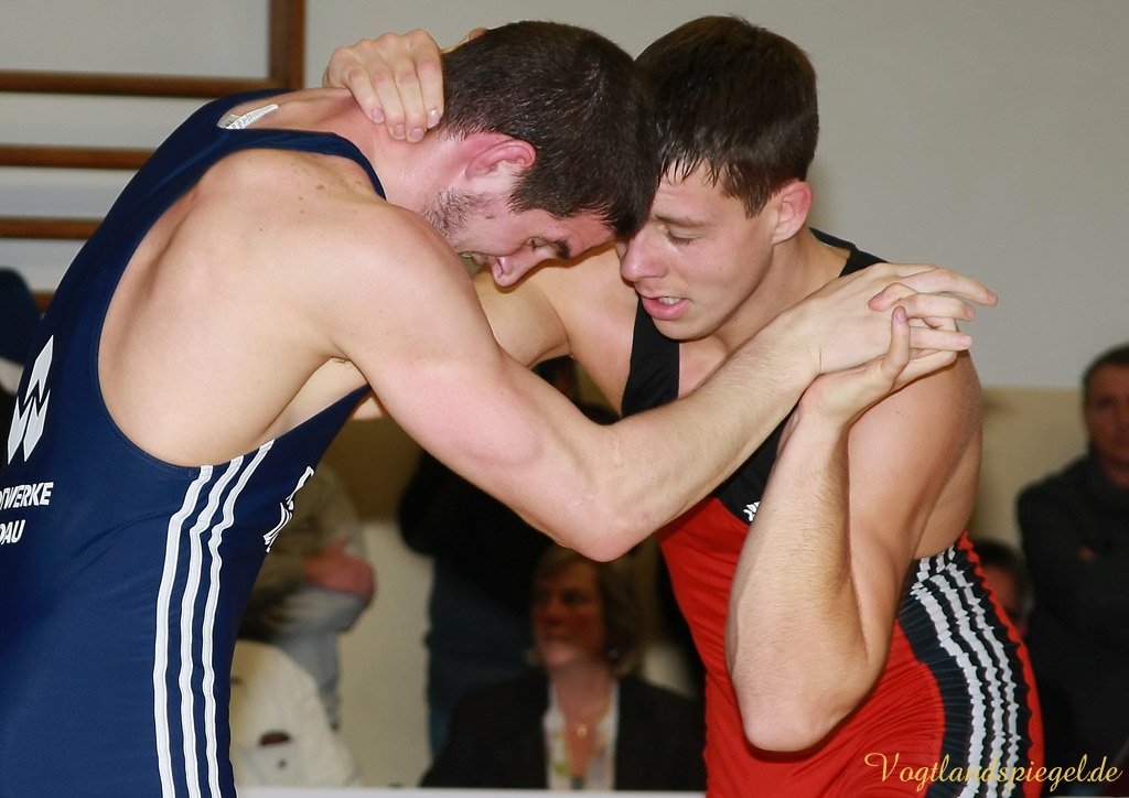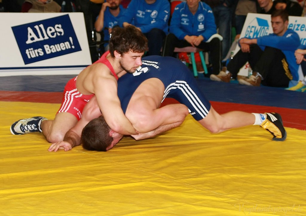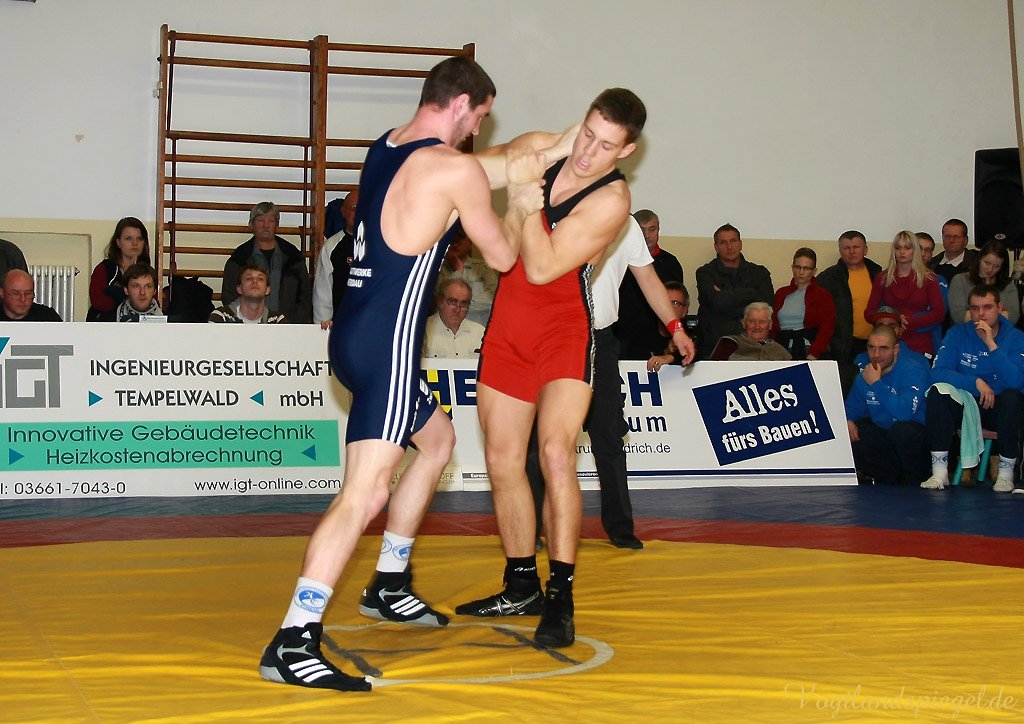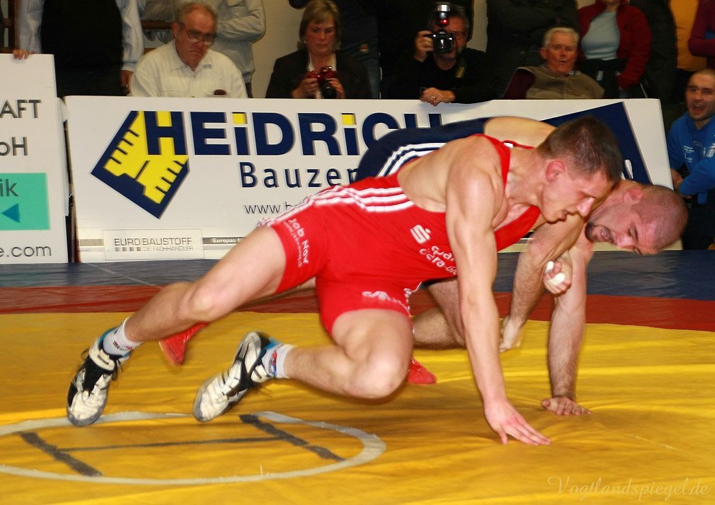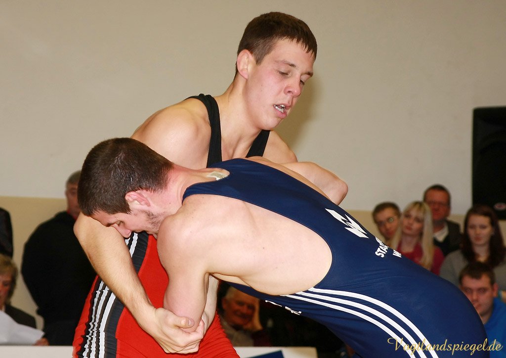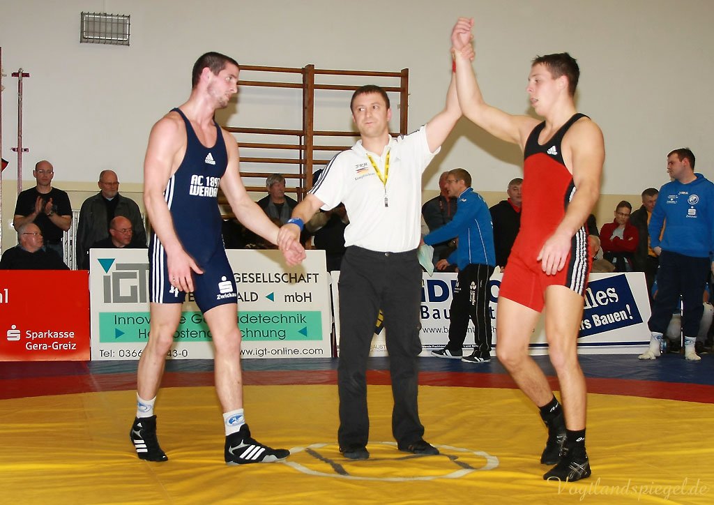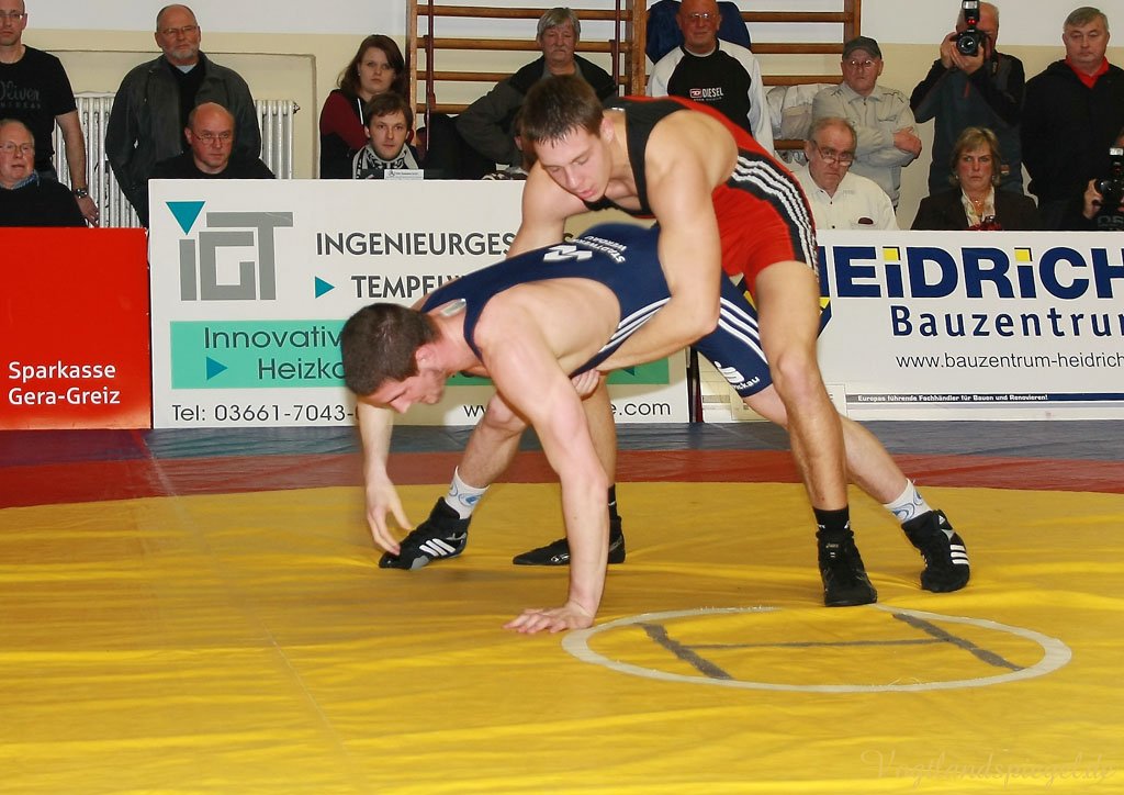 RSV Rotation Greiz gegen AC 1897 Werdau 20:13 74Akg Gr.-röm. Toni Stade (rot), RSV Rotation Greiz gegen Chris Wemme, AC 1897 Werdau. Foto:Günter StuchlikGREIZ. Der Tenor in den Presseveröffentlichungen der letzten Wochen zwischen dem Erzgebirge und Mecklenburg lautete meistens: In der 2.Bundesliga Nord kann jeder jeden schlagen. Nur gegen Greiz gewinnt keiner. Wer nun daraus schließen wollte, der weitere Saisonverlauf des RSV Rotation Greiz würde ein Selbstläufer, sah sich getäuscht. Der in der Rückrunde noch unbezwungene AC 1897 Werdau war, wie angekündigt, der wohl stärkste Widersacher in diesem Jahr. Erstmals in dieser Saison lagen die Greizer Ringer zur Halbzeit weit zurück (5:9). So entwickelte sich ein spannender dramatischer Kampf, bei dem die Zuschauer voll auf ihre Kosten kamen. Allen Unkenrufen zum Trotz war die Jahnturnhalle trotz des zeitgleich laufenden Fußballspiels Dortmund gegen München wieder hervorragend besucht. Entsprechend der Leistungen ihres Teams in den letzten Wochen reisten auch zahlreiche Fans aus Westsachsen an. Trotz beträchtlichen Blechschadens bei einem Auffahrunfall 200 Meter von der Jahnturnhalle entfernt, war die erste Sorge eines Werdauer Anhängers, nun die ersten Kämpfe zu verpassen. Beide Trainer hatten ihre Mannschaft gegenüber den letzten Kämpfen umgestellt, so dass sich unerwartete Konstellationen ergaben. Eine erwartete Paarung gab es zum Auftakt als Vladimir Codreanu (55 kg/greco) auf Kirk Reimer traf. Der Moldawier wirkte robuster, beherrschte den Dritten der deutschen Meisterschaften im Standkampf, kam aber kaum zu Punkten. Nach fünf Minuten führte er 4:1, doch ein blitzschnell gezogener Kopf-Hüft-Schwung des Ex-Lugauers brachte die Überraschung. Der Greizer lag 20 Sekunden vor Schluss auf beiden Schultern und hatte seinen ersten Kampf verloren.(Zwischenstand: 0:4) Die Werdauer Fans feierten und hofften nun auf ihren Juniorenmeister Ilja Litvinov, der Sebastian Wendel (120 kg/Freistilals Gegner hatte. Bundestrainer Thiele hatte den Neu-Werdauer den Start in der Vorrunde im 96 kg-Limit verboten, was, wie an seinem muskulösem Oberkörper zu erkennen war, nicht ohne Erfolg geblieben ist. Doch der Greizer ließ sich wegen der 10 kg Gewichtsdifferenz nicht ins Bockshorn jagen. Mit einer zugegeben etwas unorthodoxen Technik brachte er Litvinov in die Brückenlage, hatte sogar die Chance zum Schultersieg. Der etwas nervös wirkende Schiedsrichter Marco Scalisi aus Berlin übersah hier zwar eine Wertung für den Greizer, doch dieser punktete hauptsächlich durch Konter auf Beinangriffe munter weiter und sicherte sich einen ungefährdeten 6:0 Sieg (3:4). Dramatik pur im Kampf zwischen Merlin Sewina (60 kg/Freistil) und dem Dritten der diesjährigen Jugendmeisterschaften Deward Stier. Warum der Kampfrichter so lange brauchte um die Führung des Greizers anzuzeigen, bleibt sein Geheimnis. Doch der Werdauer kam durch Beinangriff zur 2:1 Halbzeitführung. Was Trainer Tino Hempel in der Pause zu seinem Schützling sagte, ist nicht bekannt, aber der Greizer kam völlig verändert aus der Ecke, drehte innerhalb von 18 Sekunden den Kampf auf 5:2. und es ging so weiter. Durch Beinangriffe und Rollen stand es bald 12:2. Als die Fans skandierten: Einer geht noch, lief der Greizer in einem Achselwurf und kam von der Rolle. Der Kampf bot alles, am Ende siegte der Greizer mit 12:9 und beide Sportler lagen völlig verausgabt am Boden. (5:5) Mit Boris Eisenstein (96 kg/greco) und dem mehrfachen tschechischen Meister Vojtech Kukla trafen zwei etwa gleichstarke Athleten aufeinander, die verbissen mit großer Härte kämpften, sich in ihren Aktionen aber jeweils neutralisierten. Auch im Bodenkampf kam nichts zählbares zu Stande. Zwanzig Sekunden vor Schluss disqualifizierte der Kampfrichter beide. (5:5) Einen schweren Stand hatte Brian Tewes (66 kg/greco) gegen Michal Novak, der seit 2002 bei den tschechischen Meisterschaften nicht zu schlagen war. Trotz starker Gegenwehr kam er vor allem in den beiden letzten Kampfminuten immer mehr in die Defensive und wurde 35 Sekunden vor Schluss beim Stande von 0:5 disqualifiziert. (5:9) Patryk Dublinowski (84 kg/Freistil) erkämpfte gegen den eine Klasse aufgerückten Kirk Haupt ohne Probleme in zwei Minuten einen 11:0 Überlegenheitssieg. (9:9) Mit einer phänomenalen Abwehrleistung brachte Radoslaw Kisiel (66 kg/Freistil) den RSV erstmals in Front. Der ungarische Spitzenringer Jozsef Molnar machte zwar den Kampf, griff ständig an, der Greizer entwand sich aber immer wieder geschickt auch aus den schier aussichtslosesten Situationen und siegte mit 4:1. (11:10) Tom Linke (84 kg/greco) war dem aufgerückten tschechischen Meister der letzten beiden Jahre Pavel Powada klar überlegen. Dem auf Grund seiner bereits gefällten Urteile nun unter Zugzwang stehenden Kampfrichter blieb nichts anderes übrig als den Werdauer beim Stande von 0:7 nach fünf Minuten zu disqualifizieren. Der deutsche Vizemeister Toni Stade (74 kg/greco) war eigentlich auf Revanche gegen Powada eingestellt, musste sich aber mit dem gleichaltrigen Chris Wemme auseinandersetzen, dem er technisch und physisch klar überlegen war. Der Greizer sammelte Punkt auf Punkt, dass dem Kampfrichter keine Zeit blieb Verwarnungen an den Werdauer zu vergeben. Beim Stande von 7:0 erwischte der Greizer Wemme an der Hüfte und beendete den Kampf mit einem lehrbuchmäßigen Wurf, der eine 5-er Wertung brachte, in nur 98 Sekunden. (19:10) Im letzten Kampf traf Konstantin Sommer (74 kg/Freistil), der den Vorkampf gewonnen hatte, auf William Stier. Der Greizer lag zur Pause 1:1 in Führung (das klingt zwar widersinnig, ist aber beim Ringen aber möglich), geriet aber 1:3 in Rückstand. Im Bestreben auszugleichen versuchte Sommer den am Kopf geschnürten Gegner mit einer Drehung um die eigene Längsachse an der Hüfte zu erwischen. Das gelang zwar nicht, aber die Zweierwertung für Stier war eine Fehlentscheidung, die den Kampf mit einer wohl auch nicht gerechtfer