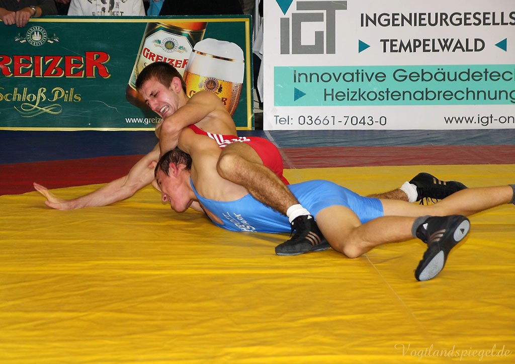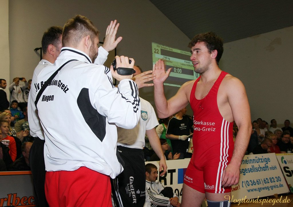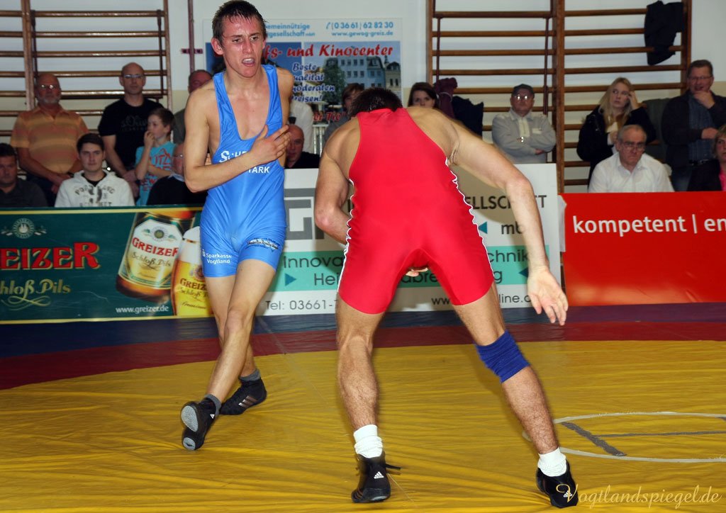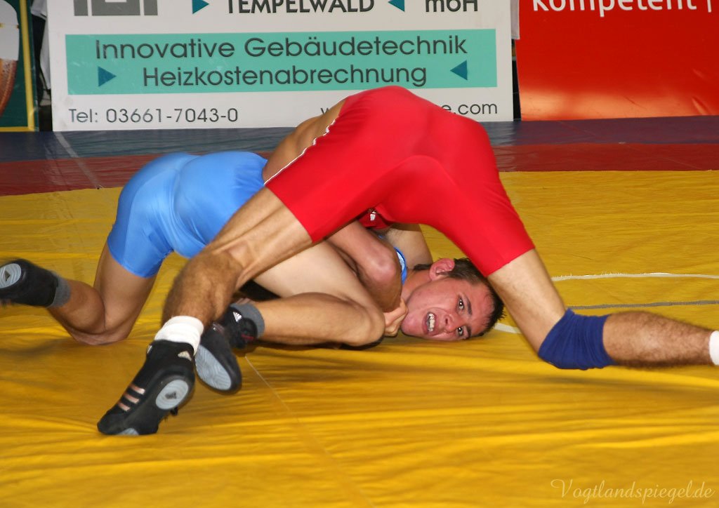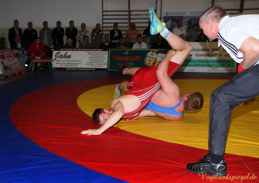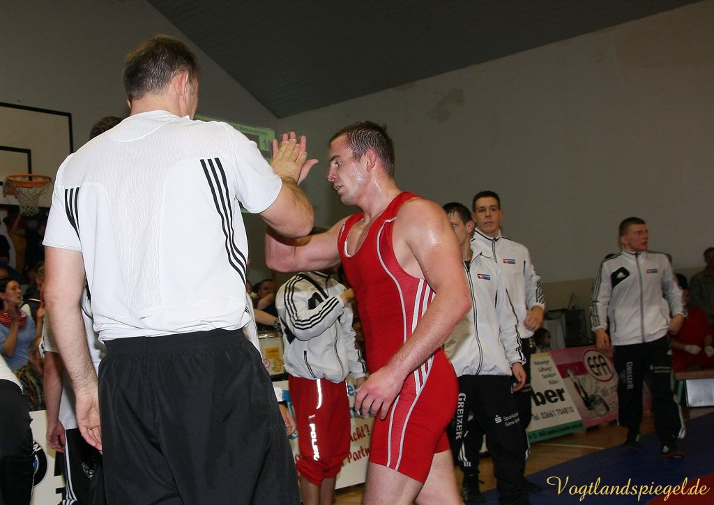 Bein sich mit dem Hinausdrängen aus der Matte begnügte (Wertung:1) anstelle beim Versuch, eine höhere Wertung zu erzielen, einen Konter zu riskieren. Der Altmeister gab sich nicht mit dem 0:5 geschlagen und versuchte kurz vor Ultimo wenigstens noch einen Mannschaftspunkt zu erkämpfen. Aber auch diesen Angriff konnte der Greizer kontern. (14:7) Die Greizer Kampfmaschine Radoslaw Kisiel (66 kg/Freistil) verlangte Heiko Holzapfel von der ersten Sekunde an alles ab. Er spielte sein ganzes technischer Repertoire aus und siegte gegen den früheren zweimaligen deutschen Jugendmeister durch Stand- und Bodengriffe bereits nach 4:06 Minuten mit 11:0. (18:7) Mit Marian Mihalik hatte Tom Linke (84 kg/greco) einen starken Widersacher. Der Greizer kämpfte gut. Doch da keine Punkte fielen, nutzte der gut und unauffällig leitende Kampfrichter Jörg Fleiter aus Gütersloh die leichten optischen Vorteile des mehrmaligen slowakischen Meisters, um den Greizer zweimal zu Boden zu schicken. Der Slowake kam so zu 6 Punkten. Trotz großen Kampfgeistes gelang Linke der Ehrenpunkt nicht mehr. (18:10). Da Toni Stade (74 kg/greco) im Vorkampf Filip Dubsky bezwungen hatte, stellten die Gäste diesmal mit Daniel Schlemmer den Bronzemedaillengewinner der Junioren auf. Der erreichte die Halbzeit aber nicht. Mit der zweiten Verwarnung zu Boden geschickt, wurde er von Toni Stade zu Beginn der dritten Minute geschultert. Der Kölner, der in Frankfurt/Oder trainiert, konnte es nicht fassen. Aber selbst Andy Schubert, der Markneukirchner Betreuer, der Kari und Gegner gern kritisiert und dabei oftmals kurz vor der roten Zone steht, unterstützte ihn nicht. (22:10) Der Sieg war sicher, die Fans skandierten: Hier regiert der RSV! als Adam Sobieraj (74 kg/Freistil) die Matte betrat. Sein Landsmann Lukasz Gorczynski, im Frühjahr von Pausa abgeworben, hatte es wirklich nicht leicht. Mit dem ersten Angriff ging der Greizer Verteidigungskünstler in Führung. Dann aber die Sensation, der Greizer wird am Bein gefasst rausgeschoben. Erster Verlustpunkt in dieser Saison 4:1. Das kann der Greizer nicht auf sich sitzen lassen, fünf Sekunden später steht es 6:1, kurz darauf 8:1. Nach der Pause erwischt der Gästeringer noch mal das Bein. 50 Sekunden wehrt sich der Greizer mit traumhafter Sicherheit, dann muss er doch noch von der Matte: 8:2. Am Ende geht alles sehr schnell. 14:2 in 5:41 Minuten. Greiz hat mit 26:10 den höchsten Saisonsieg eingefahren und 5 Runden vor Schluss 7 Punkte Vorsprung auf Verfolger Lübtheen. Wetter, die gegen den Staffelsieg von Greiz setzen, werden verzweifelt gesucht. Der nächste Kampf ist bereits am Freitag, um 20.30 Uhr in Leipzig.