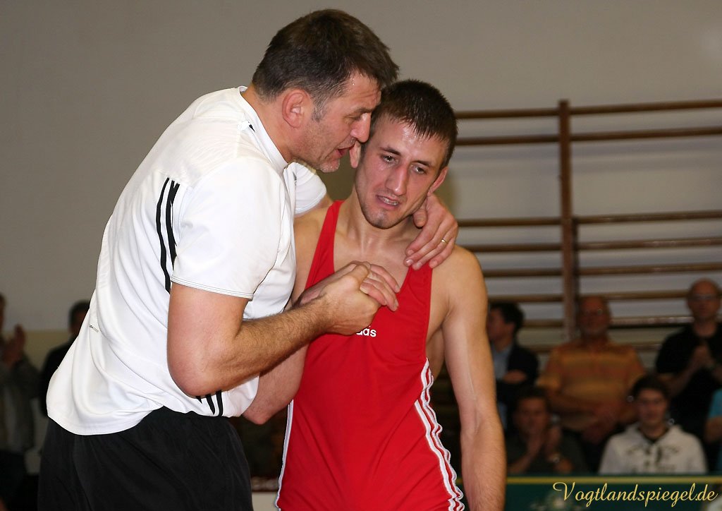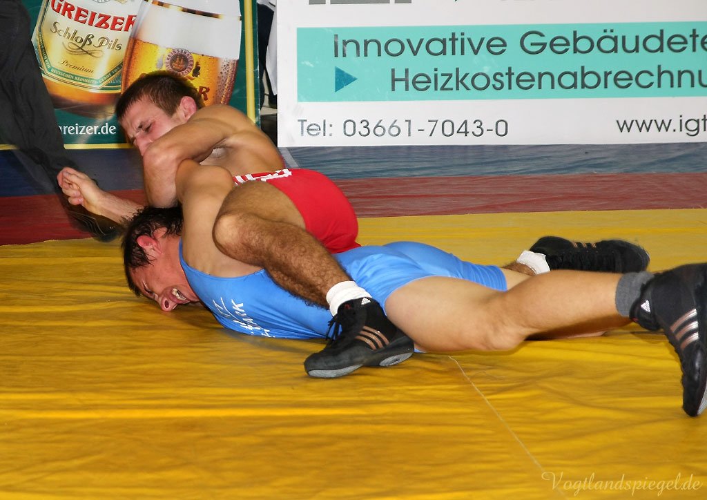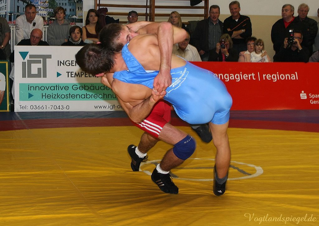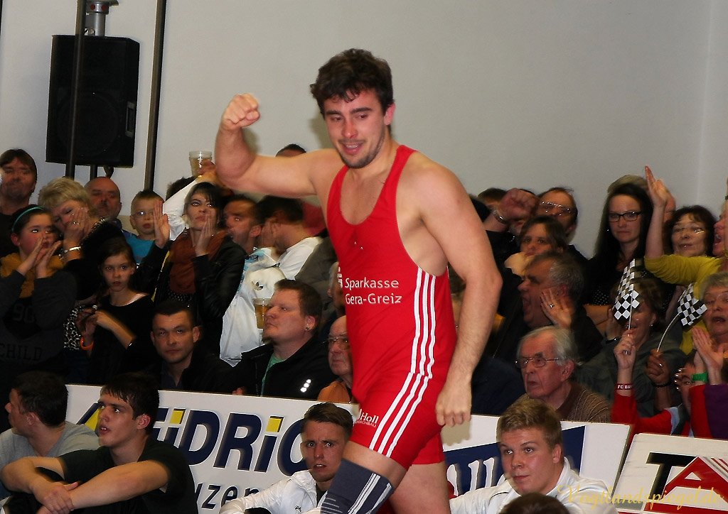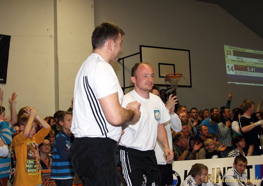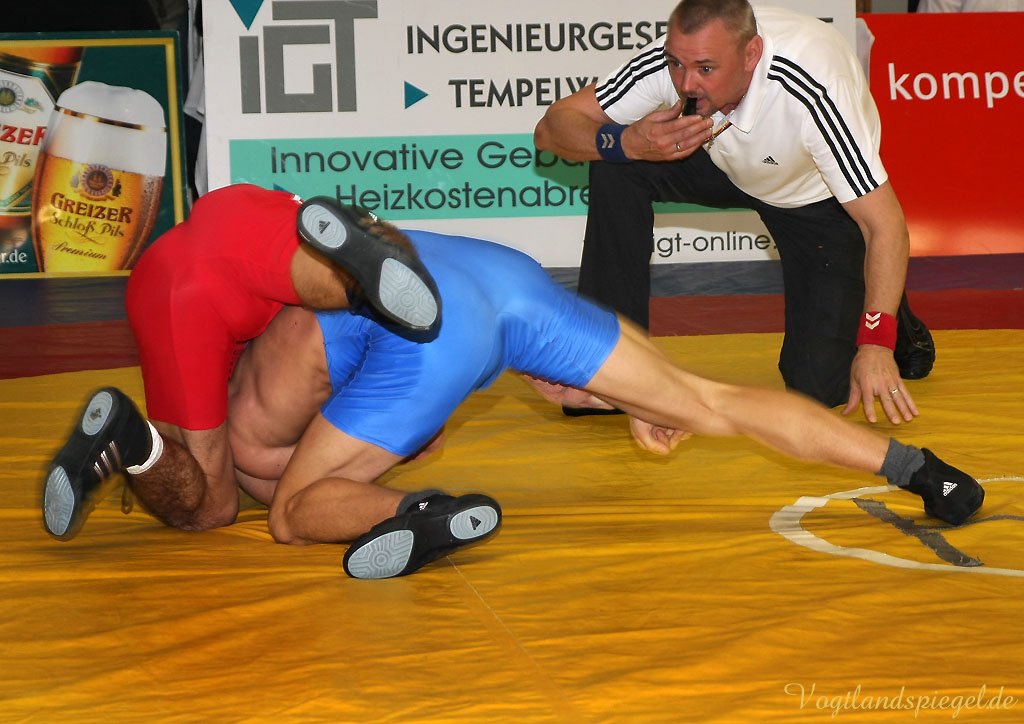 Bein sich mit dem Hinausdrängen aus der Matte begnügte (Wertung:1) anstelle beim Versuch, eine höhere Wertung zu erzielen, einen Konter zu riskieren. Der Altmeister gab sich nicht mit dem 0:5 geschlagen und versuchte kurz vor Ultimo wenigstens noch einen Mannschaftspunkt zu erkämpfen. Aber auch diesen Angriff konnte der Greizer kontern. (14:7) Die Greizer Kampfmaschine Radoslaw Kisiel (66 kg/Freistil) verlangte Heiko Holzapfel von der ersten Sekunde an alles ab. Er spielte sein ganzes technischer Repertoire aus und siegte gegen den früheren zweimaligen deutschen Jugendmeister durch Stand- und Bodengriffe bereits nach 4:06 Minuten mit 11:0. (18:7) Mit Marian Mihalik hatte Tom Linke (84 kg/greco) einen starken Widersacher. Der Greizer kämpfte gut. Doch da keine Punkte fielen, nutzte der gut und unauffällig leitende Kampfrichter Jörg Fleiter aus Gütersloh die leichten optischen Vorteile des mehrmaligen slowakischen Meisters, um den Greizer zweimal zu Boden zu schicken. Der Slowake kam so zu 6 Punkten. Trotz großen Kampfgeistes gelang Linke der Ehrenpunkt nicht mehr. (18:10). Da Toni Stade (74 kg/greco) im Vorkampf Filip Dubsky bezwungen hatte, stellten die Gäste diesmal mit Daniel Schlemmer den Bronzemedaillengewinner der Junioren auf. Der erreichte die Halbzeit aber nicht. Mit der zweiten Verwarnung zu Boden geschickt, wurde er von Toni Stade zu Beginn der dritten Minute geschultert. Der Kölner, der in Frankfurt/Oder trainiert, konnte es nicht fassen. Aber selbst Andy Schubert, der Markneukirchner Betreuer, der Kari und Gegner gern kritisiert und dabei oftmals kurz vor der roten Zone steht, unterstützte ihn nicht. (22:10) Der Sieg war sicher, die Fans skandierten: Hier regiert der RSV! als Adam Sobieraj (74 kg/Freistil) die Matte betrat. Sein Landsmann Lukasz Gorczynski, im Frühjahr von Pausa abgeworben, hatte es wirklich nicht leicht. Mit dem ersten Angriff ging der Greizer Verteidigungskünstler in Führung. Dann aber die Sensation, der Greizer wird am Bein gefasst rausgeschoben. Erster Verlustpunkt in dieser Saison 4:1. Das kann der Greizer nicht auf sich sitzen lassen, fünf Sekunden später steht es 6:1, kurz darauf 8:1. Nach der Pause erwischt der Gästeringer noch mal das Bein. 50 Sekunden wehrt sich der Greizer mit traumhafter Sicherheit, dann muss er doch noch von der Matte: 8:2. Am Ende geht alles sehr schnell. 14:2 in 5:41 Minuten. Greiz hat mit 26:10 den höchsten Saisonsieg eingefahren und 5 Runden vor Schluss 7 Punkte Vorsprung auf Verfolger Lübtheen. Wetter, die gegen den Staffelsieg von Greiz setzen, werden verzweifelt gesucht. Der nächste Kampf ist bereits am Freitag, um 20.30 Uhr in Leipzig.