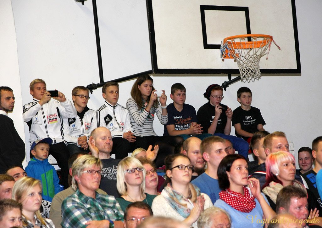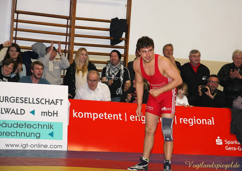 Den Anfang bei den Großen machte Vladimir Codreanu (55 kg), der erstmals in der 2.Bundesliga im griechisch-römischen Stil kämpfte und wie in Markneukirchen auf den Slowaken Attila Kovacs traf. Er sorgt immer für spektakuläre Aktionen. Nach 30 Sekunden führte er, nachdem er zweimal gekontert wurde, bereits 7:5 und die Halle tobte. Den Vorkampf hatte der Greizer in seinem Stil in 98 Sekunden 12:0 gewonnen, doch stilartfremd sieht das alles anders aus. Der slowakische Meister, immerhin EM-Teilnehmer seines Landes, führte zur Pause 9:8. Doch Codreanu zeigte den anwesenden Jugendringern, wie man mit Einsatz und Kampfkraft sowie unorthodoxen Techniken zum Sieg kommen kann. Am Ende stand es 12:9 und der enttäuschte Slowake verstand die Welt nicht mehr. (Zwischenstand 2:1) Franz Süß hatte Glück, dass er beim ersten Angriff von Sebastian Wendel (120 kg/Freistil) diesen gerade noch so von der Matte drängen konnte. Sonst hätte er im ganzen Kampf keinen Punkt erhalten. Der Greizer bestimmte gegen den ca. 15 kg schwereren DM-Zweiten der Junioren das Geschehen in allen Belangen. Er punktete durch eigene Beinangriffe und konterte geschickt die Attacken des Gegners. Endstand 8:1 (5:2) Merlin Sewina (60 kg/Freistil) kam mit Justin Müller gar nicht zurecht. Nach drei Jahren in der 55 kg-Klasse musste der Greizer beim ersten richtigen Saisoneinsatz erkennen, dass ein erfolgreicher Gewichtsklassenwechsel nur bei äußerst intensivem Training mit sehr viel Schweiß zu bewerkstelligen ist. Selbst ein Ausnahmeathlet wie Codreanu stand in der Vorwoche eine Klasse höher kurz vor der Schulterniederlage. Der DM-Vierte der A-Jugend aus Markneukirchen siegte mit 11:0 Punkten. Die Gäste gingen 6:5 in Führung und jubelten als Christoph Matz eine Drei gegen Boris Eisenstein (96 kg/greco) gelang. Doch dann rang nur noch der Greizer, der am Ende mit 4:3 erfolgreich war. (7:7) Den Schlusspunkt vor der Pause setzte Brian Tewes (66 kg/greco), der den Leipziger Sportschüler Bruce Bromnitz, kaum dass er diesen in die Bauchlage gebracht hatte, mit Bodentechniken bezwang. In nur 68 Sekunden siegte er 11:0. (11:7). Der Spitzenkampf kam doch zu Stande. Andre Backhaus stellte sich selbst gegen den aufstrebenden jungen Patryk Dublinowski (84 kg/Freistil), den Bundestrainer Thiele gern in seiner Truppe hätte. Hut ab! Normalerweise tastet der Greizer seine Gegner erst mal eine Minute ab, um deren Verhalten zu studieren. Diesmal waren beide Kämpfer von der ersten Sekunde konzentriert bis in die Fingerspitzen. Der Greizer ging mit Beinangriff 2:0 in Führung. Doch der in Lübtheen aufgewachsene und im Vogtland heimisch gewordene Evergreen machte es seinem nicht mal halb so alten Gegner nicht leicht. Dieser konnte aber einen Angriff kontern und mit 4:0 in die Pause gehen. Welchen Respekt er immer noch vor dem fünffachen deutschen Meister und zweimaligen Europameister hatte, erkannte man daran, wie er bei gefasstem.