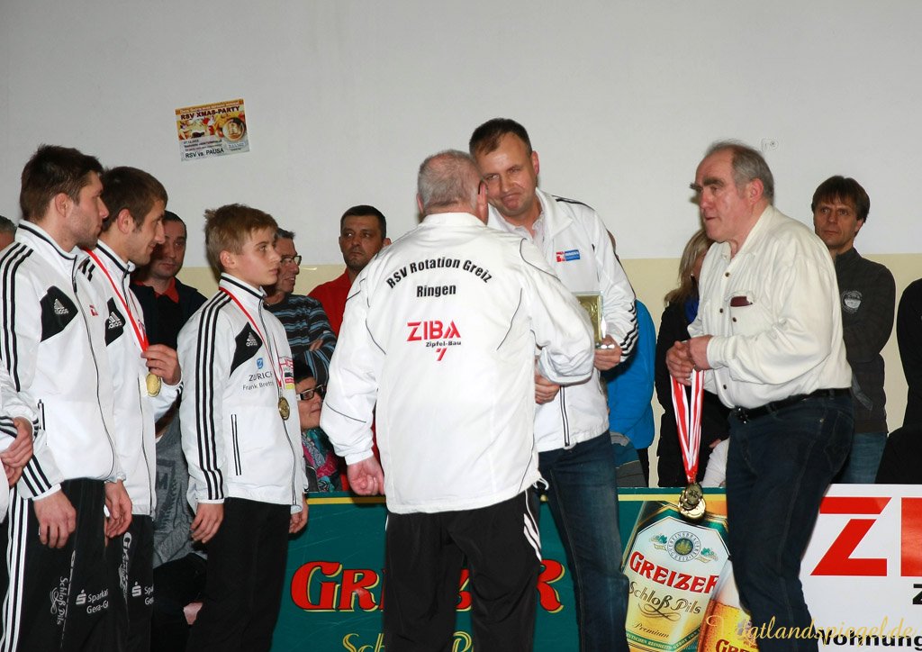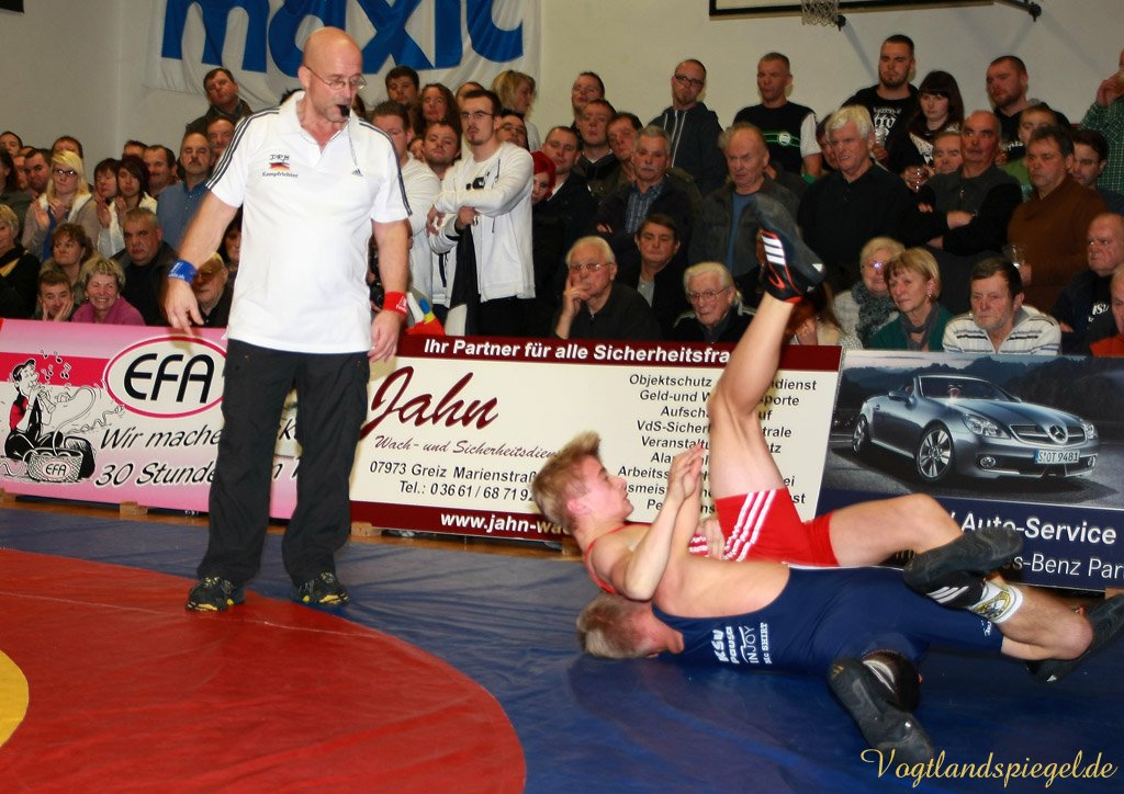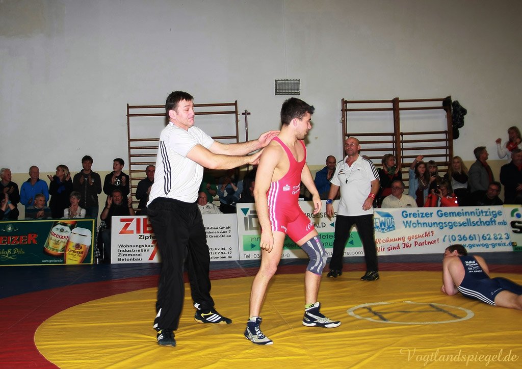 RSV-Trainer Tino Hempel wollte Vladimir Codreanu Freistil ringen lasen, so dass Ron Watzek (55 kg/greco) zu seinem Debüt in der Bundesliga kam. Er machte als Freistiler seine Sache nicht schlecht, traf aber auf Cedric Riedel, den deutschen Meister der B-Jugend von 2012. Gewichtsmäßig im Nachteil lag der Greizer zur Pause 0:4 zurück, musste dann aber nach einer Verwarnung im Bodenkampf eine Minute vor Schluss die Punkte zur technischen Niederlage abgeben. (Zwischenstand 0:4) Sebastian Wendel (120 kg/Freistil) musste sich wie im Vorkampf mit dem bulgarischen Vizemeister Georgi Sredkov auseinandersetzen. Er wollte diesmal ein knapperes Ergebnis erzielen und es sah lange aus, als ob er damit Erfolg haben könnte. Kurz vor der Pause verteidigte er sich 0:3 in Rückstand liegend mehrmals gut, konnte aber den wichtigen eigenen Zähler nicht erringen. In der fünften Minute gab er nach einer 30 Sekunden-Strafe den vierten Punkt ab. 28 Sekunden vor Schluss wurde er aber vom Bulgaren zum 0:5 von der Matte gedrängt und gab so doch noch 3 Zähler ab, was unter den gegnerischen Fans Jubelstürme auslöste. (0:7) Vladimir Codreanu (60 kg/Freistil) begann, wohl auch dem Mannschaftsstand geschuldet, etwas nervös. Immer wieder erwischte der polnische Jugendmeister Adam Slowinski seinen linken Unterschenkel und führte bald 3:0. Zur Pause lag der Greizer durch zwei Konter 4:3 vorn. Doch dann hatte der Gästeringer wieder den linken Fuß des Greizers erwischt, aber diesmal übernahm der Moldawier die Aktion und legte seinen Kontrahenten auf die Schultern. (4:7) Ganz schwer wurde es für Artem Grinko (96 kg/greco), der nicht einmal das volle Gewicht für die 84 kg-Klasse bringt und auf den deutschen Vizemeister von 2012 Bastian Kurz traf. Der Mann aus Frankfurt/Oder erwischte den Greizer Neuzugang gleich zu Beginn an der Hüfte und holte eine Fünfer-Wertung. Die Gästefans waren aus dem Häuschen, als Kurz den Greizer im Bodenkampf in nur 36 Sekunden zum 11:0 auspunktete, denn die WKG führte nun 4:11. Die Greizer hofften nun auf Mateusz Bierzanowski (66 kg/greco), der sich mit dem Plauener Werner Schellenberg auseinandersetzen musste. Der Plauener wurde vom ausgezeichnet leitenden stellvertretenden DRB-Schiedsrichterreferenten Utz Aißlinger verwarnt, kam aber nach einem Armdrehschwung zur 2:0 Führung. Der Greizer kämpfte verzweifelt, haderte auch mit einer Entscheidung, als dem Plauener ein eigener Griffversuch zugestanden wurde, konnte aber auch im Bodenkampf keinen Zähler erreichen. Wann lag Greiz in der Jahnturnhalle zur Pause jemals 4:13 zurück? Patryck Dublinowski (84 kg/Freistil) startete gegen Stefan Bonev, immerhin Dritter der diesjährigen bulgarischen Meisterschaft, die Aufholjagd. Bonev suchte sein Heil in der Flucht. Aißlinger geizte, als Fachmann wohl wissend, dass der Greizer sich durchsetzen würde, mit Verwarnungen, so dass es zur Pause nur 4:0 stand. Während Bonev schon erschöpft wirkte, suchte der coole Greizer noch Blickkontakt mit seiner aus Polen angereisten Freundin. Dann ging alles sehr schnell, in nur 98 Sekunden holte der Greizer 7 Punkte und gewann überzeugend 11:0. (8:13) Radoslaw Kisiel (66 kg/Freistil) und Robert Rogalewicz kommen aus dem gleichen Verein in Poznan, schenkten sich aber nichts. Wieder ein entscheidender Kampf. Der Greizer, der gegen seinen unter Profibedingungen trainierenden Gegner wieder großartige Verteidigungsaktionen demonstrierte, lag zur Pause 3:0 vorn, gab aber danach einen Zähler ab. Da nutze dann die letzte Konteraktion nichts, die das 5:1 einbrachte, der Kampf ging mit 2:1 in die Wertung ein. (10:14) Als dritter Greizer musste Konstantin Sommer (84 kg/greco) in den sauren Apfel beißen, im Sinne der Mannschaftsräson in der anderen Stilart zu kämpfen. Trotz vorbildlicher kämpferischer Leistung war gegen den zur erweiterten deutschen Auswahl zählenden Syrauer Maximilian Schwabe, der in zwei Minuten 12 Punkte sammelte, kein Kraut gewachsen. (10:18) Die WKG hatte nun das Remis sicher, die Greizer mussten dafür zweimal jeweils 4 Punkte holen. Der deutsche Vizemeister Toni Stade (74 kg/greco) dominierte fast zwei Minuten gegen Felix Wolf, aber erst als dieser zu Boden musste, fielen Punkte. Und es ging alles ganz schnell, zweimal in Sekundenabstand flog der Frankfurter im hohen Bogen durch die Luft; Stade holte zwei umjubelte Fünfer-Wertungen. (14:18) Eigentlich war jetzt schon alles entschieden. Adam Sobieraj (74 kg/Freistil) trat wie immer unaufgeregt an, Martin Waldeck war völlig chancenlos. Der brauchte einige Zeit bis er feststellte, dass er immer, wenn er zum Bein des Greizers griff, sofort zwei Zähler abgab. Aber auch Passivität half ihm nicht weiter. Nach 4:30 Minuten siegte der Greizer mit 11:0 und rettete das zwischenzeitlich schon in weite Ferne gerückte Remis. Die Gästefans feierten ihren Teilerfolg in Greiz wie einen Sieg, aber auch die Greizer Anhänger hatten einen großartigen Abend verlebt.