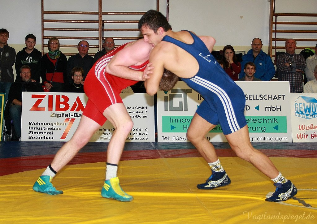 Patryk Dublinowski, RSV Rotation Greiz gegen Stefan Bonev, KSV PausaDer neue polnische U 23-Meister Patryk Dublinowski (rotes Trikot) bezwingt im Vogtlandderby 2013 Stefan Bonev aus Pausa.