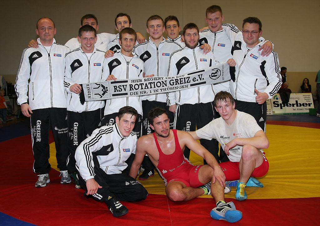 RSV Rotation Greiz Ringerverein Lübtheen 22:12 So seh’n Sieger aus: der erfolgreiche RSV Rotation Greiz. vl.hinten: Trainer Swen Lieberamm,Trainer Tino Hempel,Boris Eisenstein,Tom Linke,Sebastian Wendel, vl.vorn: Radoslaw Kisiel, Vladimir Codreanu, Patryk Dublinowski,Mateusz Bierzanowski, Betreuer Mario Neudeck, vl. sitzend: Lucas Bast, Toni Stade,Konstantin SommerGREIZ. Den ersten Auftritt des Lübtheener Ringervereins in der Jahnturnhalle wollten sich die einheimischen Ringerfans nicht entgehen lassen. Beim zweiten Heimkampf des RSV Rotation Greiz in der 2.Bundesliga blieb kaum ein Stehplatz unbesetzt, die Sitzplätze waren schon lange an Dauerkartenbesitzer vergeben. Die Mecklenburger, die zu ihren Auswärtskämpfen mit einem vollbesetzten Fanbus reisen, feuerten ihre Mannschaft lautstark an, so dass im Gegensatz zum Kampf gegen Leipzig/Taucha fast Derbystimmung herrschte. Vladimir Codreanu (55 kg/Freistil) traf im Auftaktkampf auf den ehemaligen Pausaer Mitko Asenov und ging bereits nach 27 Sekunden durch einen Achselwurf mit 3:0 in Führung. Nachdem sich der Greizer eine kleine Risswunde hatte verarzten lassen, war er einen Augenblick unaufmerksam und gab durch einen Beinangriff 2 Punkte ab. Es waren im siebenten Kampf für Greiz die ersten Verlustpunkte auf seinem Konto. Das konnte der Moldawier nicht auf sich sitzen lassen, nach einem Beinangriff rollte er den Lübtheener in nur 2:13 Minuten zum 13:2 Überlegenheitssieg. (Zwischenstand 4:0) Der Kampf zwischen dem eine Gewichtsklasse höher startenden Boris Eisenstein (120 kg/greco) und dem gleichschweren Bulgaren Daniel Bankov war nichts für Ringkampfästheten. Der bulgarische Juniorenmeister und immerhin Zweiter bei den Männern preschte wie ein Stier nach vorn, dass die Oberkörper aufeinander knallten und versuchte so den Greizer zu beeindrucken. In der Anfangsphase hatte er damit Erfolg; nach einem Zusammenprall kam der Bulgare zu einer Kopfrolle (3:0). Doch der Greizer gab nicht auf, scheiterte zwar mehrmals mit Hüftwürfen und Abreißern, kam aber durch Verwarnung zur 1:3 Resultatsverbesserung. (5:2) Mehr Mühe als erwartet hatte Mateusz Bierzanowski (60 kg/greco) mit dem erst 15-jährigen Talent Andrej Ginc aus Torgelow. Der Fünfte der A-Jugendmeisterschaften lieferte den Greizer einen großen Kampf, hatte in der vierten Minute sogar die Chance zum Ausgleich. Kampfrichter Rene Wenzel aus Leuna sah eine Aktion des Greizers aber im Gegensatz zu den Gästen noch in der Matte und gab 3 Punkte. Wie von der Tarantel gestochen stürzten vier Betreuer der Gäste auf die Matte, freilich ohne am Ergebnis etwas ändern zu können. Bierzanowski kam durch einen Konter im Bodenkampf noch zum 6:0 Erfolg (8:2) Sebastian Wendel (96 kg/Freistil) ließ sich vom muskulösen Oberkörper von Max Kriwoschein nicht beeindrucken sondern sammelte hauptsächlich durch Beinangriffe Punkt für Punkt. Am Ende stand ein 14:5 Sieg für den technisch stärkeren Greizer zu Buche. (11:3) Einen sehr ausgeglichenen Kampf mit einigen technischen Feinheiten sahen die Zuschauer beim Vergleich von Radoslaw Kisiel (66 kg/Freistil) gegen den ehemaligen deutschen Vizemeister Dennis Langner. Nach 4:30 Minuten stand es bei verteiltem Kampfverlauf 3:3, dann konterte der Greizer einen Beinangriff mit einer verkehrten Rolle und ließ sich nach diesem Kabinettstückchen nicht mehr von der Siegerstraße abbringen. Er gewann 6:5. Zur Pause führte Greiz 13:4 und dann baute Tom Linke (84 kg/greco) die Führung auf 17:4 aus. Er hatte es allerdings nicht sehr schwer, denn der etatmäßige Gegner, der Ex-Greizer Stefan Lippke, wie auch sein Vertreter Alex Dell fielen verletzt aus. Der junge Benjamin Sadkowiak war gewichtsmäßig und technisch so im Nachteil, dass der Greizer schon nach zwei Minuten mit 11:0 triumphierte. Der 18-jährige Greizer Lucas Bast (66 kg/greco) traf auf den 5 Jahre älteren dänischen Meister Anders Ekström, mit dem er sich ein offenes kampfstarkes Gefecht lieferte. Beide konnten sich keine entscheidenden Vorteile erarbeiten. Im angeordneten Bodenkampf kam der die zweite Saison in Deutschland ringende Däne zu einem minimalen Vorteil, der den 1:0 Sieg brachte. (17:6) Der mecklenburgische Fanblock war nach diesem zweiten Erfolg so aus dem Häuschen, dass er lautstark Hier regiert der RVL skandierte. Die wahren Kräfteverhältnisse wurden durch Patryk Dublinowski (84 kg/Freistil) wieder zurechtgerückt. Der hervorragend kämpfende Hallenser Sebastian Otto sah sich ständig in die Defensive gedrängt und unterlag nach vier Minuten mit 0:12. (21:6) Konstantin Sommer (74 kg/Freistil) begann gegen den erstligaerfahrenen Sebastian Novak sehr stark, führte zur Halbzeit 2:1, musste sich aber noch 2:7 geschlagen geben. (22:9) Der noch immer mit den Folgen einer Erkrankung ringende Toni Stade (74 kg/greco) wurde vom dänischen Meister Frederik Bjerrehuus in die Defensive gedrängt, blieb aber trotz seiner 0:10 Niederlage immer gefährlich. Mit dem 22:12 Erfolg siegte die Greizer Mannschaft zum fünften Mal mit 9 oder gar 10 Punkten Vorsprung und bleibt weiter ungeschlagen an der Tabellenspitze.
