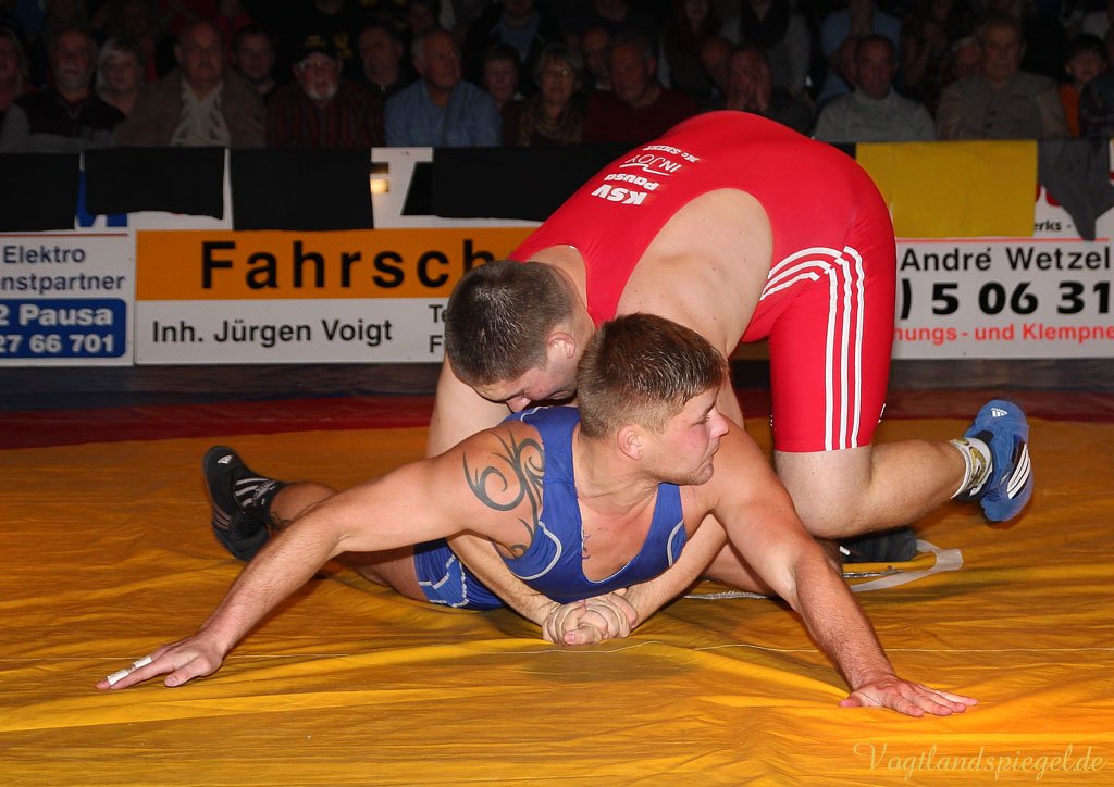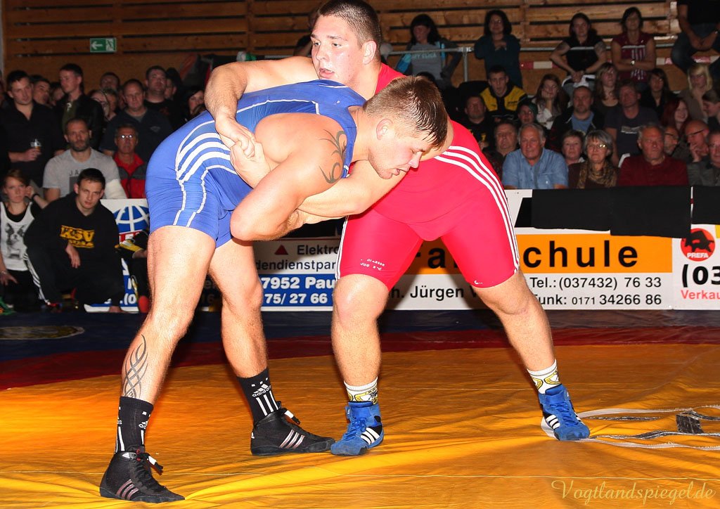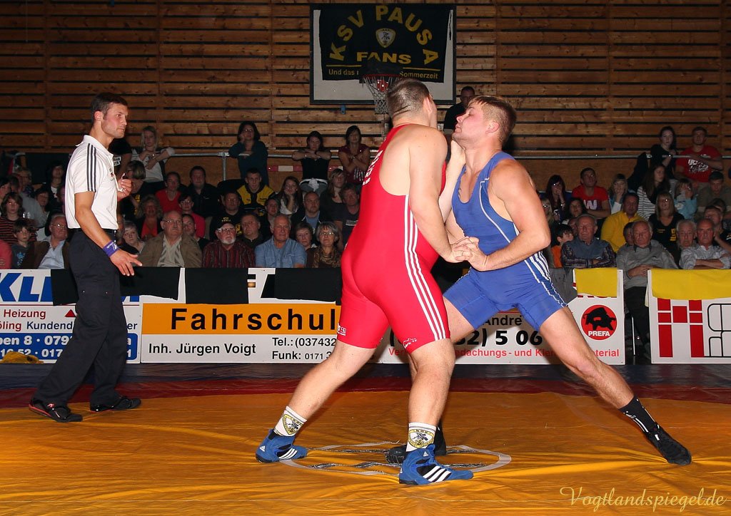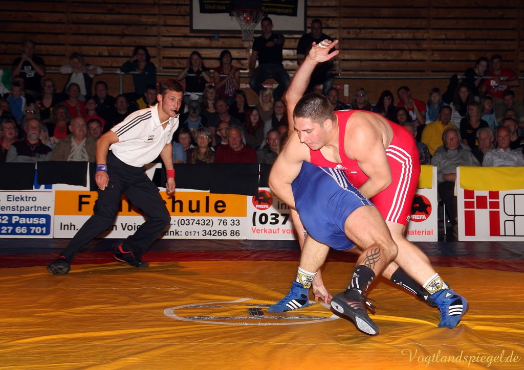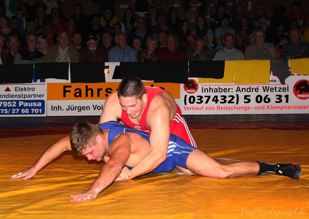 WKG Pausa/Plauen – RSV Rotation Greiz 10: 22 Adam Slowinski,WKG Pausa/Plauen gegen Vladimir Codreanu (rot), RSV Rotation Greiz.PAUSA. Der Tag begann erfolgreich für die Ringer der WKG Pausa/Plauen in der Schulturnhalle Pausa. Die Jugendmannschaft bezwang die WKG Lugau/Thalheim und dann auch den Spitzenreiter aus Greiz mit 20:16. Allerdings war bei diesem Erfolg schon ein Schönheitsfehler dabei, denn die Greizer haben den Vorkampf höher gewonnen und würden bei Punktgleichheit am Ende der Saison vorn liegen. Am Abend freute sich dann nur noch der Kassierer der Wettkampfgemeinschaft. Zwar hatten mehr als 500 Zuschauer den Weg zum Spitzenkampf der 2.Bundesliga Nord zwischen der zweitplatzierten Wettkampfgemeinschaft und dem ungeschlagenen Tabellenführer RSV Rotation Greiz gefunden, die Gastgeber hatten aber keine Chance auf den Sieg. Den Greizern, zurzeit in hervorragender Form, scheint einfach alles zu gelingen. Nach dem sechsten Sieg im sechsten Kampf haben sie nun schon sechs Punkte Vorsprung vor den Verfolgern Pausa/Plauen, Markneukirchen und Werdau. Natürlich war auch eine vielköpfige Fangemeinde aus dem thüringischen Vogtland angereist, die für die nötige Derbystimmung sorgte. Und Klassekämpfe standen auf dem Programm. Hallensprecher Andreas Seidel konnte bei der Vorstellung der Mannschaften fast bei jedem Aktiven auf Medaillen bei Meisterschaften in Deutschland, Polen, Bulgarien und Moldawien verweisen.