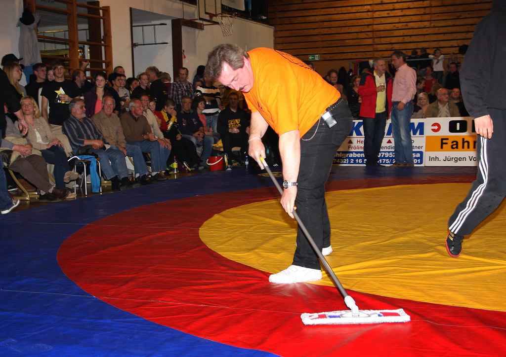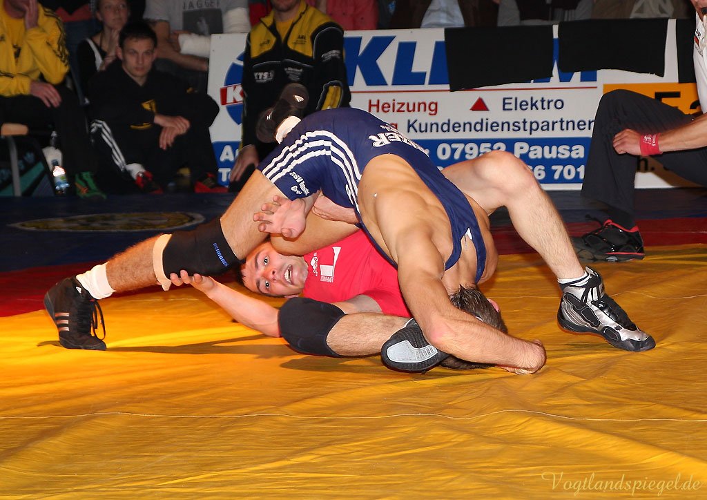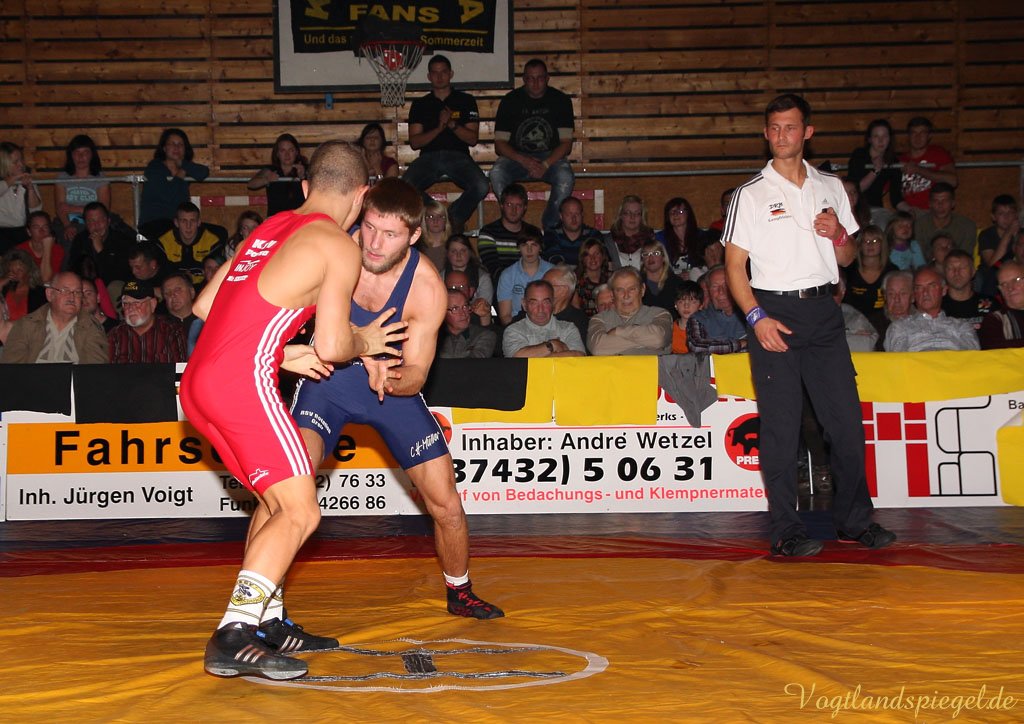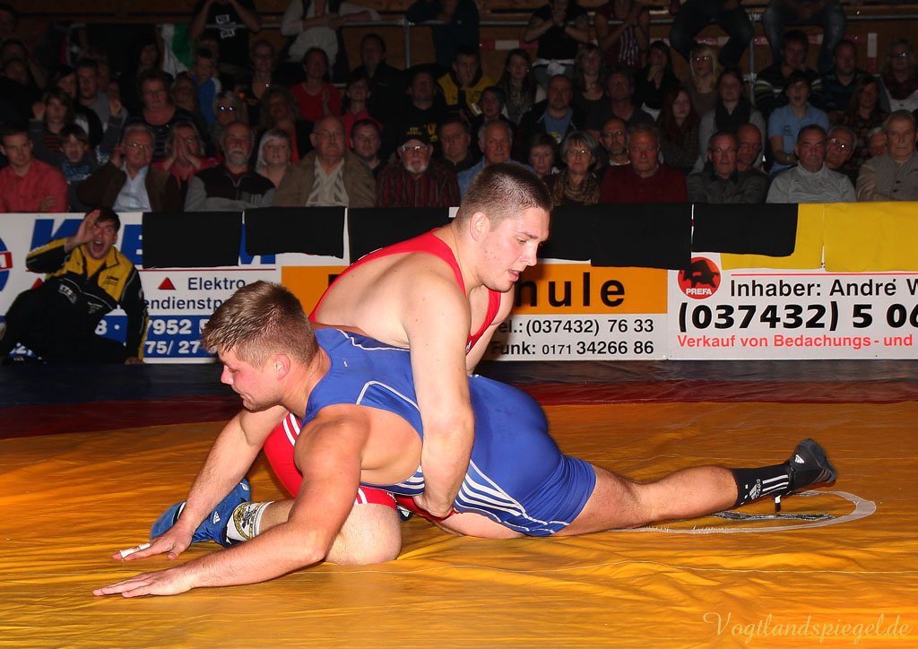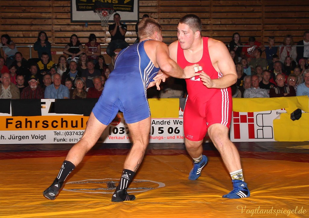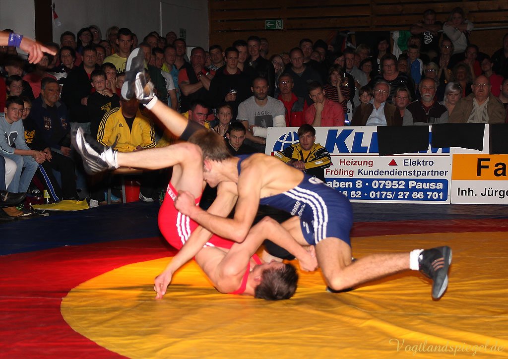 WKG Pausa/Plauen – RSV Rotation Greiz 10: 22 Adam Slowinski,WKG Pausa/Plauen gegen Vladimir Codreanu (rot), RSV Rotation Greiz.PAUSA. Der Tag begann erfolgreich für die Ringer der WKG Pausa/Plauen in der Schulturnhalle Pausa. Die Jugendmannschaft bezwang die WKG Lugau/Thalheim und dann auch den Spitzenreiter aus Greiz mit 20:16. Allerdings war bei diesem Erfolg schon ein Schönheitsfehler dabei, denn die Greizer haben den Vorkampf höher gewonnen und würden bei Punktgleichheit am Ende der Saison vorn liegen. Am Abend freute sich dann nur noch der Kassierer der Wettkampfgemeinschaft. Zwar hatten mehr als 500 Zuschauer den Weg zum Spitzenkampf der 2.Bundesliga Nord zwischen der zweitplatzierten Wettkampfgemeinschaft und dem ungeschlagenen Tabellenführer RSV Rotation Greiz gefunden, die Gastgeber hatten aber keine Chance auf den Sieg. Den Greizern, zurzeit in hervorragender Form, scheint einfach alles zu gelingen. Nach dem sechsten Sieg im sechsten Kampf haben sie nun schon sechs Punkte Vorsprung vor den Verfolgern Pausa/Plauen, Markneukirchen und Werdau. Natürlich war auch eine vielköpfige Fangemeinde aus dem thüringischen Vogtland angereist, die für die nötige Derbystimmung sorgte. Und Klassekämpfe standen auf dem Programm. Hallensprecher Andreas Seidel konnte bei der Vorstellung der Mannschaften fast bei jedem Aktiven auf Medaillen bei Meisterschaften in Deutschland, Polen, Bulgarien und Moldawien verweisen.