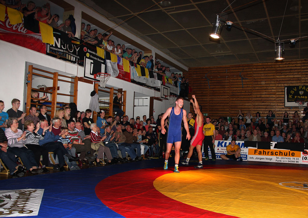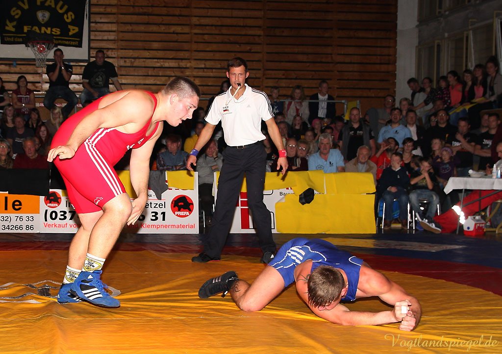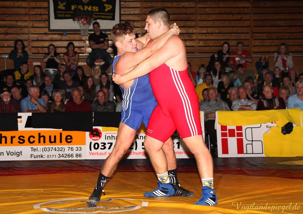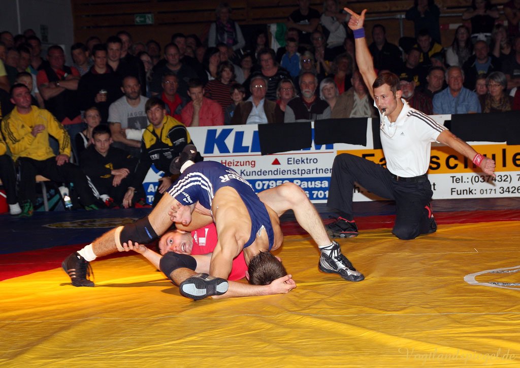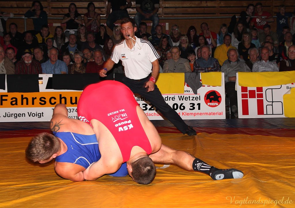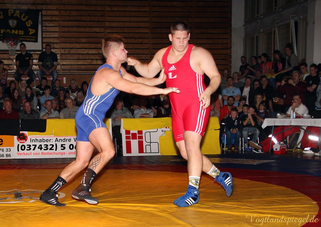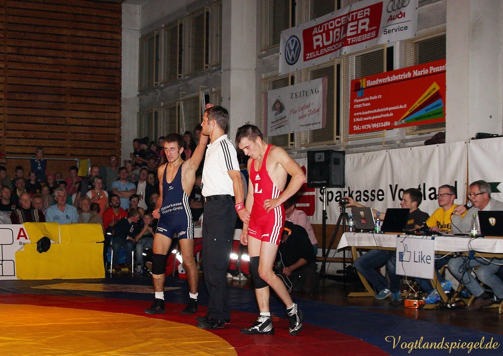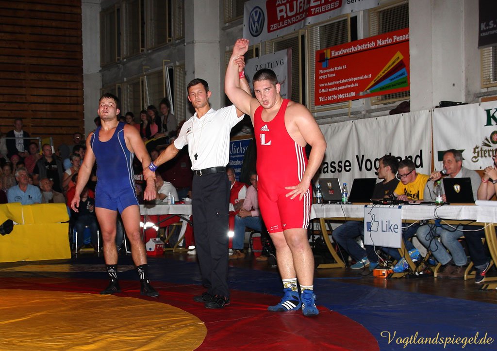 Bereits der erste Kampf hatte es in sich, zwei ungeschlagene Sportler kämpften um den Titel des Besten der Staffel. Vladimir Codreanu (55 kg/Freistil) ging zwar 4:0 in Führung, musste sich dann aber immer wieder der überfallartigen Angriffe der polnischen Jugendmeisters Adam Slowinski auf sein linkes Bein erwehren. Nach 9:4 Halbzeitführung nahm der Greizer das Heft des Handelns in die Hand, stand nach einem doppelten Beinangriff fast vor dem Schultersieg und siegte in 5:29 Minuten mit 16:4. (Kampfstand aus Greizer Sicht: 4:0) David und Goliath trafen im Kampf von Mirco Redmann (120 kg/greco), der den erkrankten Boris Eisenstein ersetzen musste, gegen Ricardo Melz aufeinander. Genau 31,5 kg betrug der Gewichtsvorteil des deutschen Vizemeisters auf Seiten der WKG, der am Boden 2:0 in Führung ging. Mateusz Bierzanowski, RSV Rotation GreizDoch der Greizer kämpfte unermüdlich und ließ kaum klare Aktionen von Melz zu. Der Greizer Trainer Tino Hempel feuerte seinen Mann leidenschaftlich an und hätte wohl gern selbst mitgekämpft. Melz siegte mit 4 Punkten Vorsprung, der Jubel in der Greizer Ecke galt aber dem wahren Sieger. (4:2) Der Kampf zwischen dem bulgarischen Jugendmeister Nestar Nestarov und Mateusz Bierzanowski (60 kg/greco) brachte die Pausaer Volksseele zum Kochen. Der Greizer schob zwar den Bulgaren dreimal – zwar in seiner Angriffsfassart nach außen und erhielt dafür 3 seiner 6 Punkte, doch die Schieberrufe des Pausaer Anhangs galten Schiedsrichter Nikolai Schum aus Hessen, der Nestarov in der vierten Minute wegen passiver Ringweise disqualifiziere. (8:2) Der ungeschlagene bulgarische Vizemeister Georgi Sredkov tat sich mit seiner Favoritenstellung gegen Sebastian Wendel (96 kg/Freistil) schwerer als erwartet. Gegen den gut eingestellten Greizer gelang nur ein Beinangriff und ein Konter. Zwei 30 Sekundenstrafen, bei denen Wendel selbst keinen Punkt erzielte und deshalb bestraft wurde und eine Verwarnung brachten den 0:6 Endstand. (5:8) Nach der Verletzung ihres etatmäßigen Kämpfers ging WKG-Trainer Silvio Hoffmann über die Waage, trat aber nicht zum Kampf an. Radoslaw Kisiel (66 kg/Freistil) kam so kampflos zu vier Punkten. Die Greizer Fans feierten einen Pausenstand von 12:5. Tom Linke (84 kg/greco) hatte gegen Maximilian Schwabe vor allem in der ersten Kampfhälfte Vorteile, als er den Syrauer im Standkampf zweimal von hinten zu packen bekam und 5 Zähler sammelte. Im zweiten Abschnitt kam der kampfstarke WKG-Aktive, der in seiner ersten Saison im 84 kg-Limit noch einige Anpassungsschwierigkeiten hat, auf 1:5 heran.(6:14) Brian Tewes (66 kg/greco) hatte mit dem Plauener Werner Schellenberg einen sehr unangenehmen Gegner. Keiner der Ringer konnte trotz verbissenen Kampfes einen Vorteil erarbeiten. Bei solchen Kämpfen siegen gewöhnlich die Sportler im roten Heimtrikot. Dies war auch diesmal der Fall; 1:0 für Schellenberg. (14:8) Schon als Stefan Bonev gegen Patryk Dublinowski (84 kg/Freistil) die Matte betrat, wurde er von den Pausaer Anhängern frenetisch gefeiert. Nicht einmal vier Minuten später verstummten die frustrierten Gastgeber und die Greizer skandierten: Hier regiert der RSV! Was war geschehen? Nach einer Minute des Abtastens brannte der Greizer ein ringerisches Feuerwerk ab und ließ durch seine katzenhafte Geschmeidigkeit und technische Brillanz beim 13:0 Erfolg den Dritten der bulgarischen Meisterschaften wie einen Anfänger aussehen.(18:8) Konstantin Sommer (74 kg/Freistil) wurde von Martin Waldeck zwar optisch in die Defensive gedrängt, blieb aber immer gefährlich. Die Führung des Greizers war von allerdings unbegründeten Protesten der Pausaer begleitet. Die Greizer Kampfmaschine baute die Führung nach zwei 30 Sekundenstrafen auf 3:1 aus und ließ trotz der ständigen Beinangriffe des Pausaers nur eine Resultatsverbesserung von 3:2 zu ((20:9) Toni Stade (74 kg/greco) hat seine Erkrankung überwunden wie Martin Lehmann erkennen musste. Durch einen Kopf-Hüft-Schwung 4:2 führend, ließ der Greizer trotz ständiger Angriffe des Gegners durch seine Verteidigungskünste nur ein 4:4 zu, das ihm durch seine Dreierwertung den Sieg brachte. Die Greizer Wand neben der Gästeecke feierte den 10:22 Auswärtserfolg enthusiastisch. Stimmen zum Kampf: Tino Hempel, RSV-Trainer: Eine Superleistung der ganzen Mannschaft. Da kann man eigentlich keinen herausheben. Mirco Redmann und Konstantin Sommer möchte ich auf Grund ihres hervorragenden Einsatzes doch nennen. Ulrich Leithold, 1.Vorstand des KSV Pausa: Eine großartige Veranstaltung, der Sieg der Greizer fiel aber zu hoch aus. Jürgen Wolf, twowolfes-Filmproduktion Zeulenroda, der gerade einen Film über den RSV dreht: Ich war das erste Mal beim Ringkampf und bin von dem Fluidum überrascht. Solche Stimmung habe ich noch nicht erlebt. Erhard Schmelzer @19.10.2013