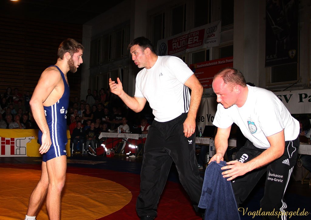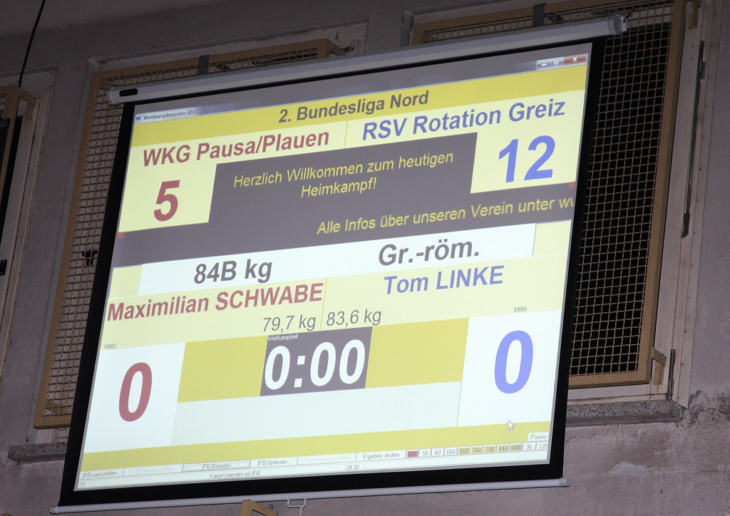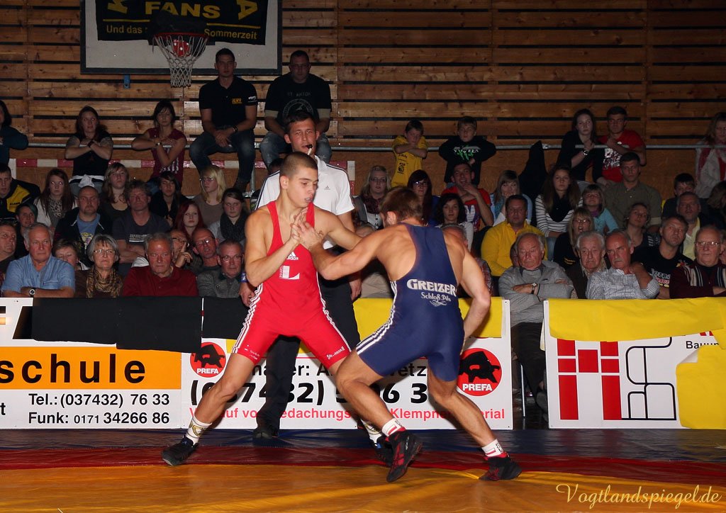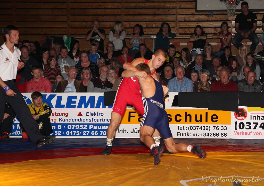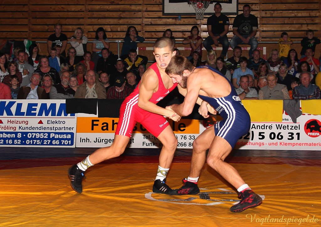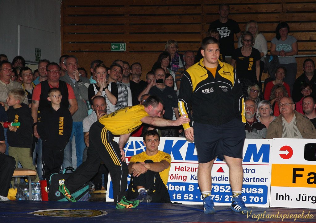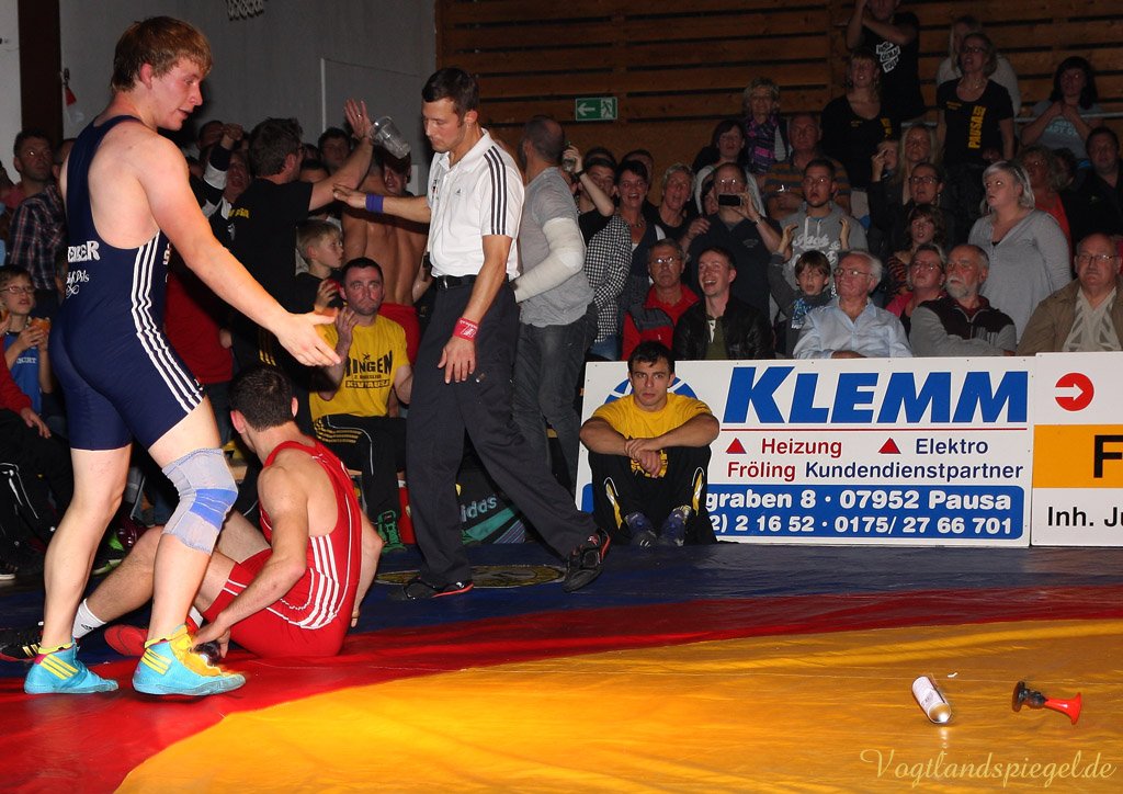 Bereits der erste Kampf hatte es in sich, zwei ungeschlagene Sportler kämpften um den Titel des Besten der Staffel. Vladimir Codreanu (55 kg/Freistil) ging zwar 4:0 in Führung, musste sich dann aber immer wieder der überfallartigen Angriffe der polnischen Jugendmeisters Adam Slowinski auf sein linkes Bein erwehren. Nach 9:4 Halbzeitführung nahm der Greizer das Heft des Handelns in die Hand, stand nach einem doppelten Beinangriff fast vor dem Schultersieg und siegte in 5:29 Minuten mit 16:4. (Kampfstand aus Greizer Sicht: 4:0) David und Goliath trafen im Kampf von Mirco Redmann (120 kg/greco), der den erkrankten Boris Eisenstein ersetzen musste, gegen Ricardo Melz aufeinander. Genau 31,5 kg betrug der Gewichtsvorteil des deutschen Vizemeisters auf Seiten der WKG, der am Boden 2:0 in Führung ging. Mateusz Bierzanowski, RSV Rotation GreizDoch der Greizer kämpfte unermüdlich und ließ kaum klare Aktionen von Melz zu. Der Greizer Trainer Tino Hempel feuerte seinen Mann leidenschaftlich an und hätte wohl gern selbst mitgekämpft. Melz siegte mit 4 Punkten Vorsprung, der Jubel in der Greizer Ecke galt aber dem wahren Sieger. (4:2) Der Kampf zwischen dem bulgarischen Jugendmeister Nestar Nestarov und Mateusz Bierzanowski (60 kg/greco) brachte die Pausaer Volksseele zum Kochen. Der Greizer schob zwar den Bulgaren dreimal – zwar in seiner Angriffsfassart nach außen und erhielt dafür 3 seiner 6 Punkte, doch die Schieberrufe des Pausaer Anhangs galten Schiedsrichter Nikolai Schum aus Hessen, der Nestarov in der vierten Minute wegen passiver Ringweise disqualifiziere. (8:2) Der ungeschlagene bulgarische Vizemeister Georgi Sredkov tat sich mit seiner Favoritenstellung gegen Sebastian Wendel (96 kg/Freistil) schwerer als erwartet. Gegen den gut eingestellten Greizer gelang nur ein Beinangriff und ein Konter. Zwei 30 Sekundenstrafen, bei denen Wendel selbst keinen Punkt erzielte und deshalb bestraft wurde und eine Verwarnung brachten den 0:6 Endstand. (5:8) Nach der Verletzung ihres etatmäßigen Kämpfers ging WKG-Trainer Silvio Hoffmann über die Waage, trat aber nicht zum Kampf an. Radoslaw Kisiel (66 kg/Freistil) kam so kampflos zu vier Punkten. Die Greizer Fans feierten einen Pausenstand von 12:5. Tom Linke (84 kg/greco) hatte gegen Maximilian Schwabe vor allem in der ersten Kampfhälfte Vorteile, als er den Syrauer im Standkampf zweimal von hinten zu packen bekam und 5 Zähler sammelte. Im zweiten Abschnitt kam der kampfstarke WKG-Aktive, der in seiner ersten Saison im 84 kg-Limit noch einige Anpassungsschwierigkeiten hat, auf 1:5 heran.(6:14) Brian Tewes (66 kg/greco) hatte mit dem Plauener Werner Schellenberg einen sehr unangenehmen Gegner. Keiner der Ringer konnte trotz verbissenen Kampfes einen Vorteil erarbeiten. Bei solchen Kämpfen siegen gewöhnlich die Sportler im roten Heimtrikot. Dies war auch diesmal der Fall; 1:0 für Schellenberg. (14:8) Schon als Stefan Bonev gegen Patryk Dublinowski (84 kg/Freistil) die Matte betrat, wurde er von den Pausaer Anhängern frenetisch gefeiert. Nicht einmal vier Minuten später verstummten die frustrierten Gastgeber und die Greizer skandierten: Hier regiert der RSV! Was war geschehen? Nach einer Minute des Abtastens brannte der Greizer ein ringerisches Feuerwerk ab und ließ durch seine katzenhafte Geschmeidigkeit und technische Brillanz beim 13:0 Erfolg den Dritten der bulgarischen Meisterschaften wie einen Anfänger aussehen.(18:8) Konstantin Sommer (74 kg/Freistil) wurde von Martin Waldeck zwar optisch in die Defensive gedrängt, blieb aber immer gefährlich. Die Führung des Greizers war von allerdings unbegründeten Protesten der Pausaer begleitet. Die Greizer Kampfmaschine baute die Führung nach zwei 30 Sekundenstrafen auf 3:1 aus und ließ trotz der ständigen Beinangriffe des Pausaers nur eine Resultatsverbesserung von 3:2 zu ((20:9) Toni Stade (74 kg/greco) hat seine Erkrankung überwunden wie Martin Lehmann erkennen musste. Durch einen Kopf-Hüft-Schwung 4:2 führend, ließ der Greizer trotz ständiger Angriffe des Gegners durch seine Verteidigungskünste nur ein 4:4 zu, das ihm durch seine Dreierwertung den Sieg brachte. Die Greizer Wand neben der Gästeecke feierte den 10:22 Auswärtserfolg enthusiastisch. Stimmen zum Kampf: Tino Hempel, RSV-Trainer: Eine Superleistung der ganzen Mannschaft. Da kann man eigentlich keinen herausheben. Mirco Redmann und Konstantin Sommer möchte ich auf Grund ihres hervorragenden Einsatzes doch nennen. Ulrich Leithold, 1.Vorstand des KSV Pausa: Eine großartige Veranstaltung, der Sieg der Greizer fiel aber zu hoch aus. Jürgen Wolf, twowolfes-Filmproduktion Zeulenroda, der gerade einen Film über den RSV dreht: Ich war das erste Mal beim Ringkampf und bin von dem Fluidum überrascht. Solche Stimmung habe ich noch nicht erlebt. Erhard Schmelzer @19.10.2013