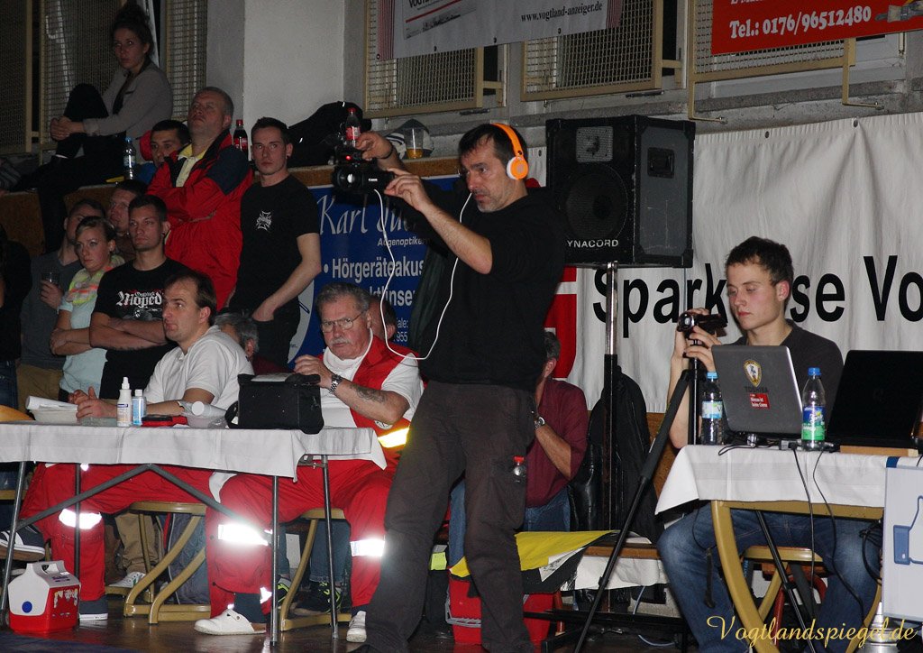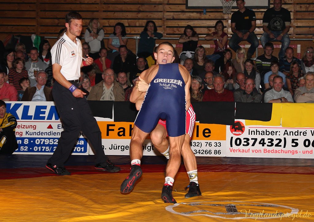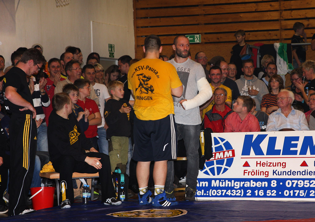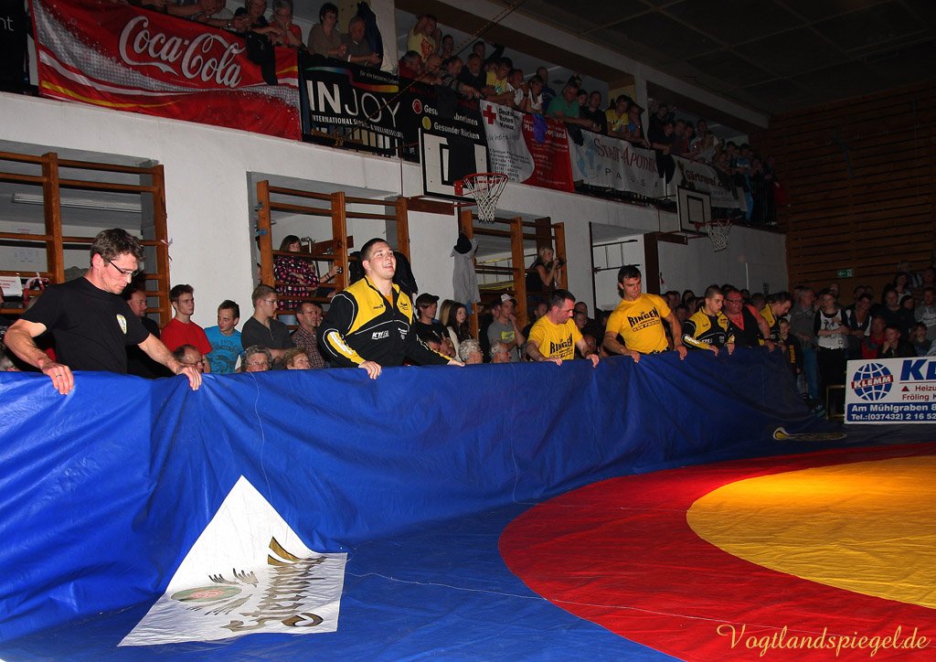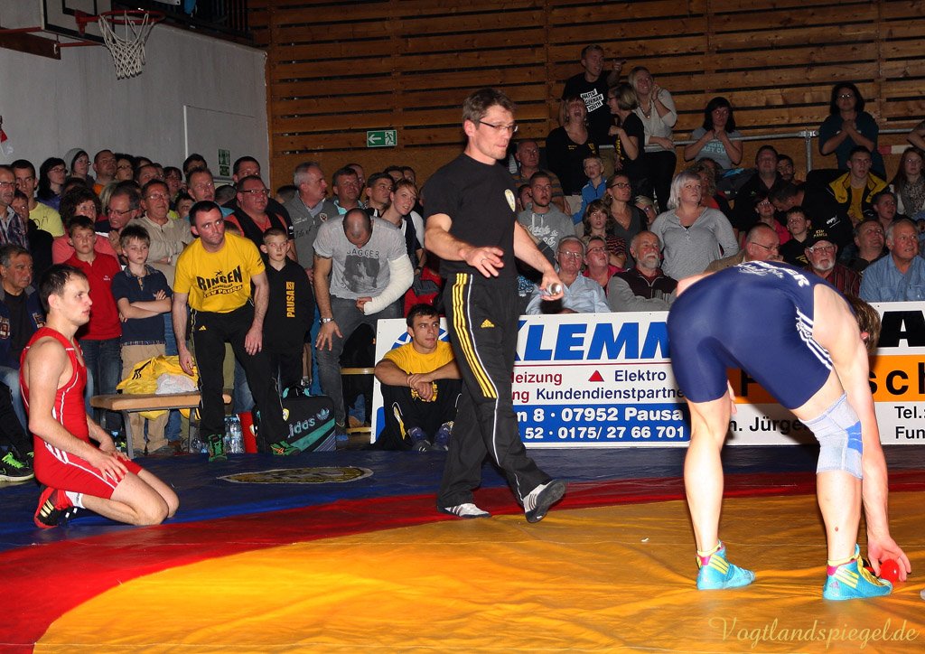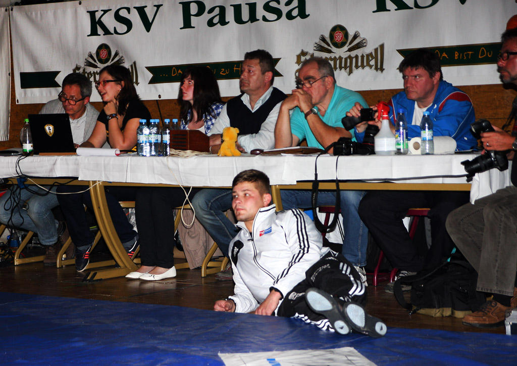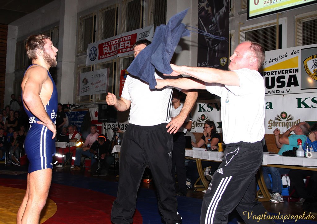 Bereits der erste Kampf hatte es in sich, zwei ungeschlagene Sportler kämpften um den Titel des Besten der Staffel. Vladimir Codreanu (55 kg/Freistil) ging zwar 4:0 in Führung, musste sich dann aber immer wieder der überfallartigen Angriffe der polnischen Jugendmeisters Adam Slowinski auf sein linkes Bein erwehren. Nach 9:4 Halbzeitführung nahm der Greizer das Heft des Handelns in die Hand, stand nach einem doppelten Beinangriff fast vor dem Schultersieg und siegte in 5:29 Minuten mit 16:4. (Kampfstand aus Greizer Sicht: 4:0) David und Goliath trafen im Kampf von Mirco Redmann (120 kg/greco), der den erkrankten Boris Eisenstein ersetzen musste, gegen Ricardo Melz aufeinander. Genau 31,5 kg betrug der Gewichtsvorteil des deutschen Vizemeisters auf Seiten der WKG, der am Boden 2:0 in Führung ging. Mateusz Bierzanowski, RSV Rotation GreizDoch der Greizer kämpfte unermüdlich und ließ kaum klare Aktionen von Melz zu. Der Greizer Trainer Tino Hempel feuerte seinen Mann leidenschaftlich an und hätte wohl gern selbst mitgekämpft. Melz siegte mit 4 Punkten Vorsprung, der Jubel in der Greizer Ecke galt aber dem wahren Sieger. (4:2) Der Kampf zwischen dem bulgarischen Jugendmeister Nestar Nestarov und Mateusz Bierzanowski (60 kg/greco) brachte die Pausaer Volksseele zum Kochen. Der Greizer schob zwar den Bulgaren dreimal – zwar in seiner Angriffsfassart nach außen und erhielt dafür 3 seiner 6 Punkte, doch die Schieberrufe des Pausaer Anhangs galten Schiedsrichter Nikolai Schum aus Hessen, der Nestarov in der vierten Minute wegen passiver Ringweise disqualifiziere. (8:2) Der ungeschlagene bulgarische Vizemeister Georgi Sredkov tat sich mit seiner Favoritenstellung gegen Sebastian Wendel (96 kg/Freistil) schwerer als erwartet. Gegen den gut eingestellten Greizer gelang nur ein Beinangriff und ein Konter. Zwei 30 Sekundenstrafen, bei denen Wendel selbst keinen Punkt erzielte und deshalb bestraft wurde und eine Verwarnung brachten den 0:6 Endstand. (5:8) Nach der Verletzung ihres etatmäßigen Kämpfers ging WKG-Trainer Silvio Hoffmann über die Waage, trat aber nicht zum Kampf an. Radoslaw Kisiel (66 kg/Freistil) kam so kampflos zu vier Punkten. Die Greizer Fans feierten einen Pausenstand von 12:5. Tom Linke (84 kg/greco) hatte gegen Maximilian Schwabe vor allem in der ersten Kampfhälfte Vorteile, als er den Syrauer im Standkampf zweimal von hinten zu packen bekam und 5 Zähler sammelte. Im zweiten Abschnitt kam der kampfstarke WKG-Aktive, der in seiner ersten Saison im 84 kg-Limit noch einige Anpassungsschwierigkeiten hat, auf 1:5 heran.(6:14) Brian Tewes (66 kg/greco) hatte mit dem Plauener Werner Schellenberg einen sehr unangenehmen Gegner. Keiner der Ringer konnte trotz verbissenen Kampfes einen Vorteil erarbeiten. Bei solchen Kämpfen siegen gewöhnlich die Sportler im roten Heimtrikot. Dies war auch diesmal der Fall; 1:0 für Schellenberg. (14:8) Schon als Stefan Bonev gegen Patryk Dublinowski (84 kg/Freistil) die Matte betrat, wurde er von den Pausaer Anhängern frenetisch gefeiert. Nicht einmal vier Minuten später verstummten die frustrierten Gastgeber und die Greizer skandierten: Hier regiert der RSV! Was war geschehen? Nach einer Minute des Abtastens brannte der Greizer ein ringerisches Feuerwerk ab und ließ durch seine katzenhafte Geschmeidigkeit und technische Brillanz beim 13:0 Erfolg den Dritten der bulgarischen Meisterschaften wie einen Anfänger aussehen.(18:8) Konstantin Sommer (74 kg/Freistil) wurde von Martin Waldeck zwar optisch in die Defensive gedrängt, blieb aber immer gefährlich. Die Führung des Greizers war von allerdings unbegründeten Protesten der Pausaer begleitet. Die Greizer Kampfmaschine baute die Führung nach zwei 30 Sekundenstrafen auf 3:1 aus und ließ trotz der ständigen Beinangriffe des Pausaers nur eine Resultatsverbesserung von 3:2 zu ((20:9) Toni Stade (74 kg/greco) hat seine Erkrankung überwunden wie Martin Lehmann erkennen musste. Durch einen Kopf-Hüft-Schwung 4:2 führend, ließ der Greizer trotz ständiger Angriffe des Gegners durch seine Verteidigungskünste nur ein 4:4 zu, das ihm durch seine Dreierwertung den Sieg brachte. Die Greizer Wand neben der Gästeecke feierte den 10:22 Auswärtserfolg enthusiastisch. Stimmen zum Kampf: Tino Hempel, RSV-Trainer: Eine Superleistung der ganzen Mannschaft. Da kann man eigentlich keinen herausheben. Mirco Redmann und Konstantin Sommer möchte ich auf Grund ihres hervorragenden Einsatzes doch nennen. Ulrich Leithold, 1.Vorstand des KSV Pausa: Eine großartige Veranstaltung, der Sieg der Greizer fiel aber zu hoch aus. Jürgen Wolf, twowolfes-Filmproduktion Zeulenroda, der gerade einen Film über den RSV dreht: Ich war das erste Mal beim Ringkampf und bin von dem Fluidum überrascht. Solche Stimmung habe ich noch nicht erlebt. Erhard Schmelzer @19.10.2013