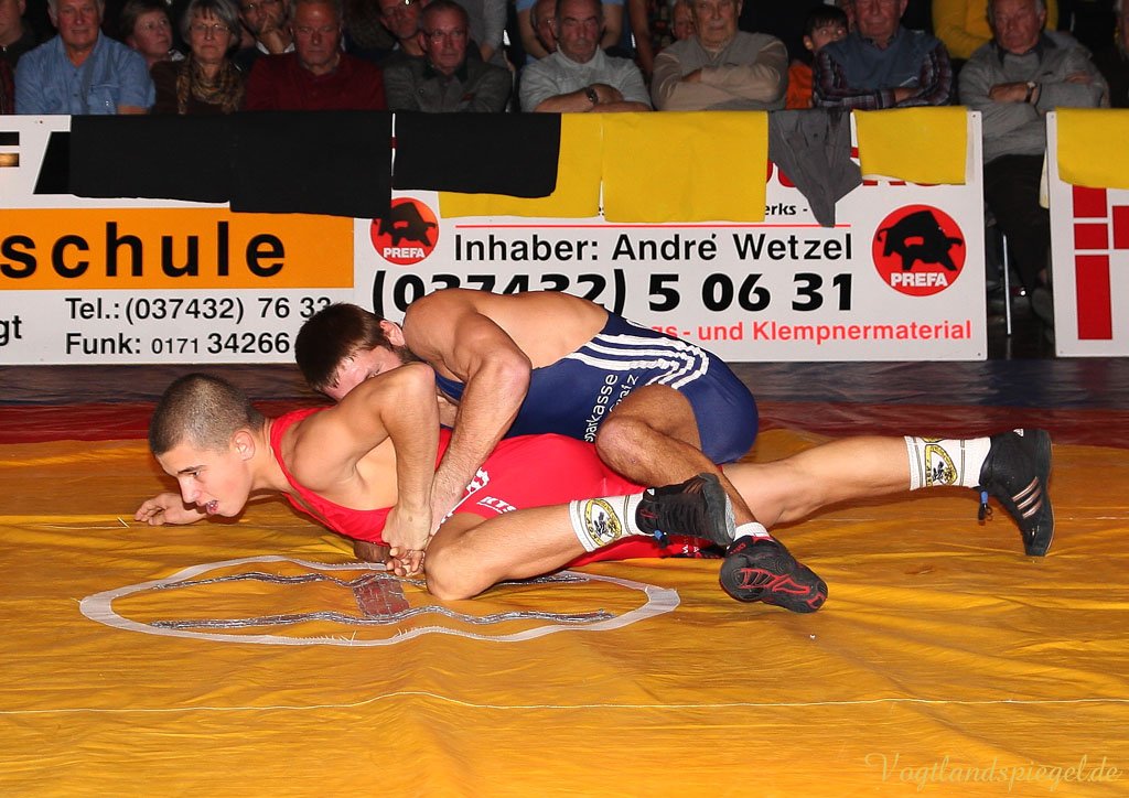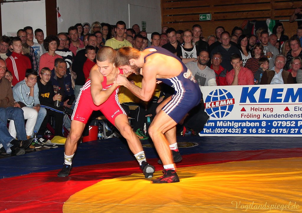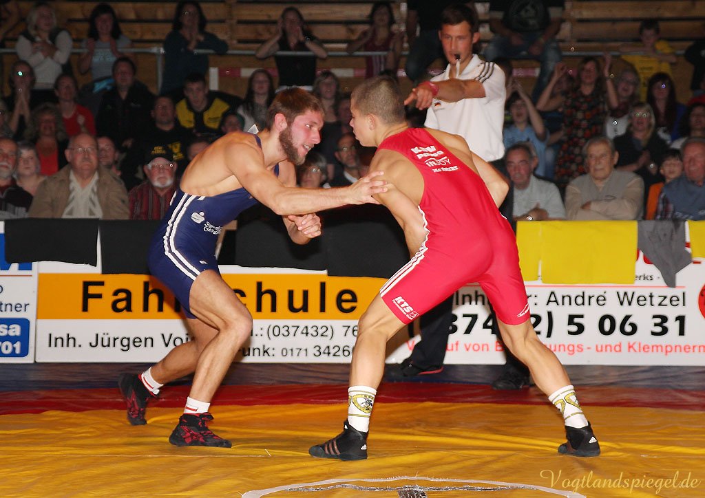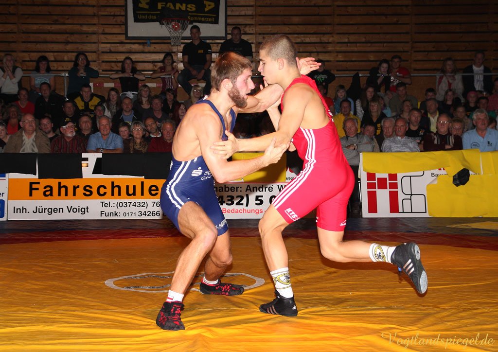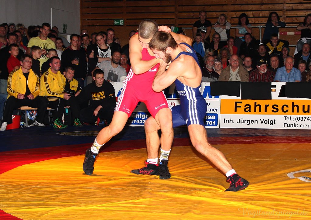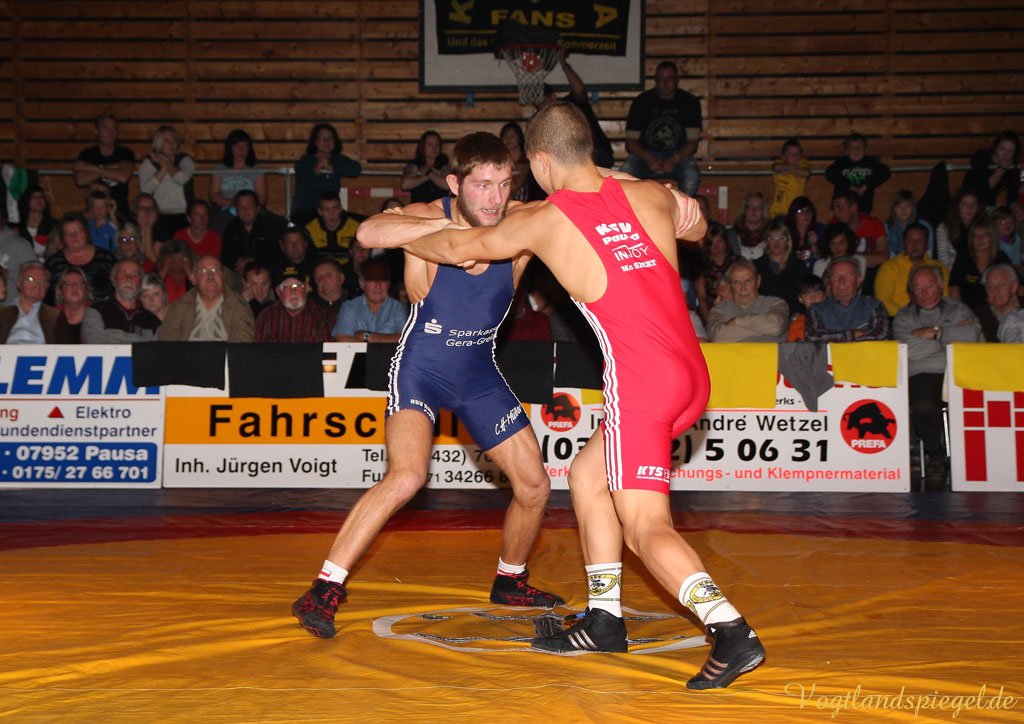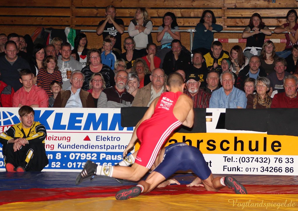 WKG Pausa/Plauen – RSV Rotation Greiz 10: 22 Adam Slowinski,WKG Pausa/Plauen gegen Vladimir Codreanu (rot), RSV Rotation Greiz.PAUSA. Der Tag begann erfolgreich für die Ringer der WKG Pausa/Plauen in der Schulturnhalle Pausa. Die Jugendmannschaft bezwang die WKG Lugau/Thalheim und dann auch den Spitzenreiter aus Greiz mit 20:16. Allerdings war bei diesem Erfolg schon ein Schönheitsfehler dabei, denn die Greizer haben den Vorkampf höher gewonnen und würden bei Punktgleichheit am Ende der Saison vorn liegen. Am Abend freute sich dann nur noch der Kassierer der Wettkampfgemeinschaft. Zwar hatten mehr als 500 Zuschauer den Weg zum Spitzenkampf der 2.Bundesliga Nord zwischen der zweitplatzierten Wettkampfgemeinschaft und dem ungeschlagenen Tabellenführer RSV Rotation Greiz gefunden, die Gastgeber hatten aber keine Chance auf den Sieg. Den Greizern, zurzeit in hervorragender Form, scheint einfach alles zu gelingen. Nach dem sechsten Sieg im sechsten Kampf haben sie nun schon sechs Punkte Vorsprung vor den Verfolgern Pausa/Plauen, Markneukirchen und Werdau. Natürlich war auch eine vielköpfige Fangemeinde aus dem thüringischen Vogtland angereist, die für die nötige Derbystimmung sorgte. Und Klassekämpfe standen auf dem Programm. Hallensprecher Andreas Seidel konnte bei der Vorstellung der Mannschaften fast bei jedem Aktiven auf Medaillen bei Meisterschaften in Deutschland, Polen, Bulgarien und Moldawien verweisen.