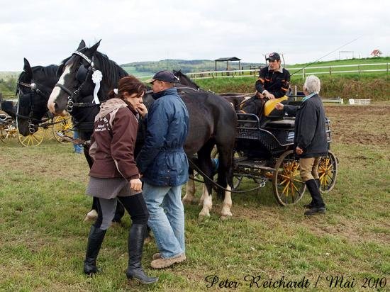 Bei der Dressurprüfung der Einspänner der Klasse A war Hausherr Hubert Jäschke am sichersten auf dem Parcours, Michael Sprigade vom Ludwigshofer RFV erfuhr hier den Sieg bei den Zweispännern. Im Hindernisfahren, dem Manövrieren der Kutsche samt aufgelegtem Ball durch Kegeltore bei hoher Geschwindigkeit, trugen sich die Nachwuchsfahrer im Einspänner Pia Zenkel vom RFV Höchstadt/Aisch und Florian Deckert vom RFV Naumburg in die Siegliste ein. Silke Zenkel (RFV Höchstadt/Aisch) triumphierte in der Klasse A, während bei den Zweispännern Michael Sprigade vom Ludwigshofer RFV einmal mehr nicht zu schlagen war. Die Dressurreitprüfung für den Nachwuchs der Klasse E gewann die Mohlsdorferin Monique Becker auf Eliza. Um den Wanderpokal für die beste Geländereitstaffel und den Pokal um die Goldene Badewanne, einem Hindernisreiten für Gespanne, wurde am Sonntag gekämpft. Gerhard Dietzsch vom RFV Greiz eröffnete den Reigen mit seinen Shetlandponys, die er zweispännig vor der Kutsche vorführte. Die Einspännerquadrille des RFV Mohlsdorf zeigte ein Zusammenspiel von sechs Gespannen.