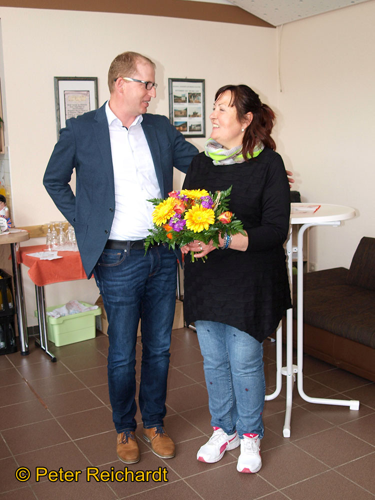 Steffi Böhme erhält von Enrico Heinke einen Blumenstrauß.