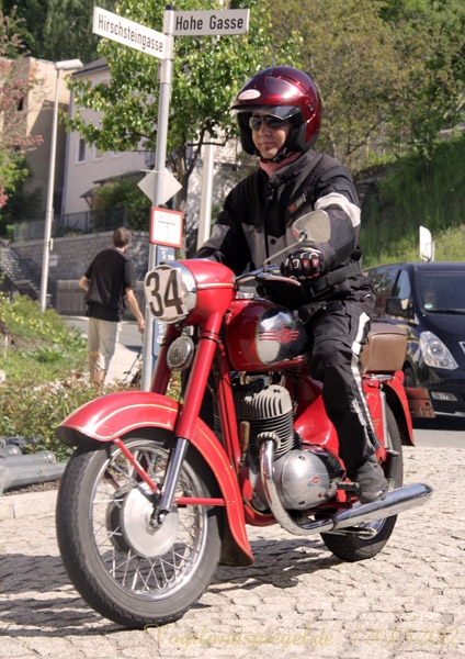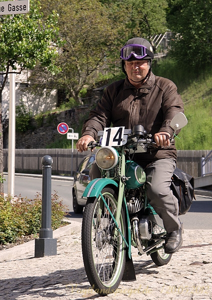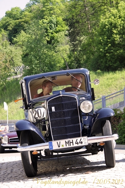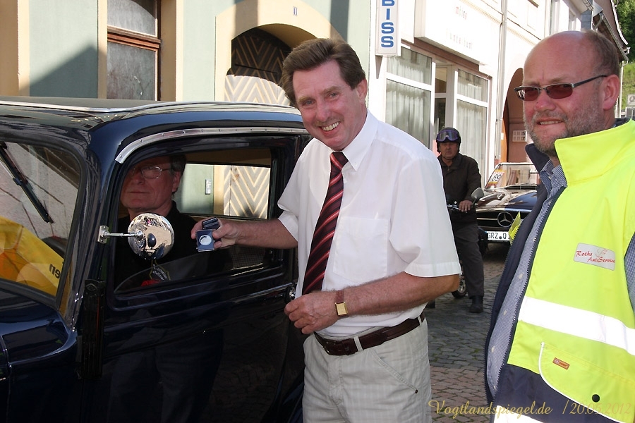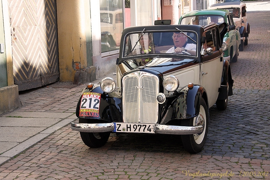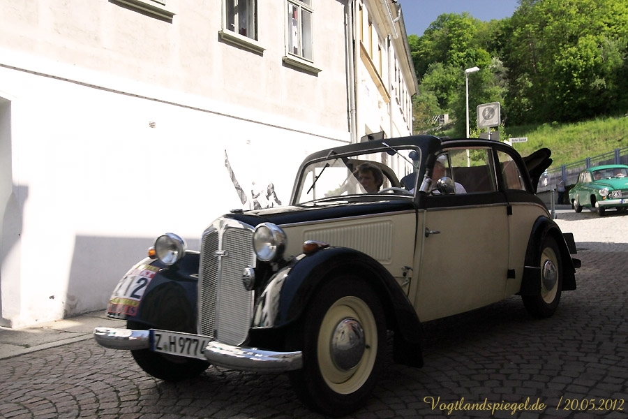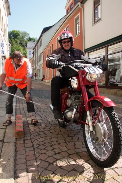 ADAC Oldtimerausfahrt rund um die Park- und Schlossstadt Greiz des Historischen Rennsportclub Greiz-Neumühle im ADAC machte Zwischenstopp auf dem Greizer Markt Oldtimerausfahrt rund um die Park- und Schlossstadt Greiz des Historischen Rennsportclub Greiz-Neumühle im ADAC machte Zwischenstopp auf dem Greizer MarktGREIZ. Nicht nur in und um Eisenach waren an diesem Wochenende Oldtimer unterwegs. Nein, auch in und um die Park- und Schlossstadt Greiz waren am vergangenen Sonntag wunderschöne Oldtimer, seien es nun PKW oder Motorrad, auf den Straßen zu sehen und erstaunten so manchen der Straßenpassanten. Hatte doch der Historische Rennsportclub Greiz-Neumühle im ADAC zu seiner 28. ADAC Oldtimerausfahrt rund um die Park- und Schlossstadt Greiz nach Neumühle/Elster eingeladen. Mei Vugtland iss so wunnerschie . . . – heißt es in einem Heimatlied aus der Region. Und davon schwärmten die rund 150 Teilnehmer dieser Oldtimerausfahrt in den Frühling, die sich auf die Tour von Neumühle/Elster über Greiz, Zeulenroda, rund um die Zeulenrodaer Talsperre und weiter über Pöllwitz, Dobia, die Steinermühle, Elsterberg, zurück nach Greiz und dann zum Ziel in Neumühle/Elster begeben hatten. Wie sagte doch Thomas Roth, der Vorsitzende des HRC Greiz-Neumühle e.V. in seiner Begrüßung: Ich freue mich darüber, dass sich Teilnehmer aus den verschiedensten Teilen Deutschlands auch zur diesjährigen Ausfahrt den Weg nach Neumühle gefunden haben. Mit Sicherheit bietet ihnen die schöne Umgebung von Neumühle oder die Park- und Schlossstadt Greiz die Möglichkeit, um mit ihren geliebten Oldtimern auch diesen Teil Deutschlands zu erkunden, neue Kontakte zu knüpfen oder Erfahrungen auszutauschen. Davon waren die Teilnehmer, die in 10 Wertungsklassen starteten, so begeistert. Kaiserwetter und strahlender Sonnenschein auf der Fahrt, dazu so begeistert mitgehende Zuschauer und Passanten an den Straßen, gute Gespräche untereinander und manch guter Ratschlag, den man im Gespräch erhielt – das macht wohl die Faszination dieser ADAC Oldtimerausfahrten aus und so beliebt. Natürlich hatte sich die gute Stube von Greiz, der Greizer Markt, besonders herausgeputzt. Auch viele Greizer ließen sich das Spektakel der Wagen- und Motorradauffahrt nicht entgehen, war doch hier ein Zwischenstopp bei dieser ADAC Oldtimerausfahrt vorgesehen. Ulrich Zschegner in Vertretung des Greizer Bürgermeisters begrüßte alle Teilnehmer mit Handschlag, wünschte ihnen einen angenehmen Aufenthalt in der Region und überreichte jedem Teilnehmer als kleines Andenken an die 28. ADAC Oldtimerausfahrt rund um die Park- und Schlossstadt Greiz den diesjährigen Stadttaler, der in diesem Jahr das Ulf-Merbold-Gymnasium zeigt. Wertungsprüfungen, insgesamt fünf, mussten natürlich ebenso absolviert werden wie die Fahrtstrecke, und das nach Möglichkeit fehlerlos. Ein Spurbrett sauber und ordnungsgemäß befahren, einen Bremspunkt genau treffen, da hieß es schon in Neumühle/Elster Konzentration und Augen auf. Einen genauen Abstand zur Bordsteinkante anfahren und einen bestimmten Frontabstand vor einem Hindernis punktgenau erreichen, da gehörte auf dem Greizer Markt eine ganze Menge Geschicklichkeit dazu. Es waren aber auch tolle Autos, vom PKW bis zum Kleinlaster, und Motorräder zu sehen. Ja, selbst Dreiradfahrzeuge waren dabei und ließen manchen staunend blicken. Eine tolle Verbindung von Weltmuseumstag und gelebter Historie. Haben die Oldtimerfreunde doch einen nicht unerheblichen Anteil bei der Bewahrung und Erhaltung musealer Objekte aus der jüngeren Geschichte unseres Landes sowie Europas und tragen damit auch am motorisierten Geschichtsbild unserer Epoche bei. Natürlich wurden die Besten in den einzelnen Fahrtklassen mit entsprechenden Pokalen geehrt. Deren Aufzählung würde allerdings hier zu weit führen und den Rahmen sprengen, doch einige Sonderpreise dieser 28. ADAC Oldtimerausfahrt rund um die Park- und Schlossstadt Greiz muss man wohl nennen. So ist der älteste Teilnehmer mit 81 Jahren, Wolfgang Sell, im März 1931 geboren und mit seinem Motorrad aus Eisenach angereist. Der jüngste Teilnehmer mit 17 Jahren, Florian Walter, wurde im Juli 1995 geboren und kam aus Linda bei Gera nach Neumühle/Elster. Das älteste Motorrad dieser Oldtimerausfahrt war eine BMW R62 mit dem Baujahr 1929, die Reinhard Schütze aus Hartmannsdorf bei Crossen auf die Strecke brachte. Bei den PKW war es ein Ford A mit dem Baujahr 1929, den Heinrich Scholz aus Reichenbach/V. sein Eigen nennt und in dieser Oldtimerausfahrt vorstellte.