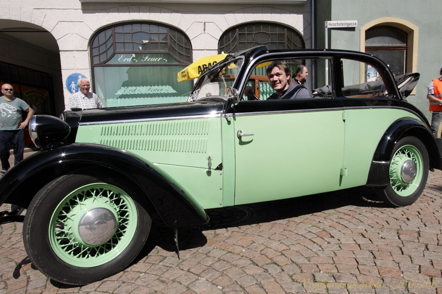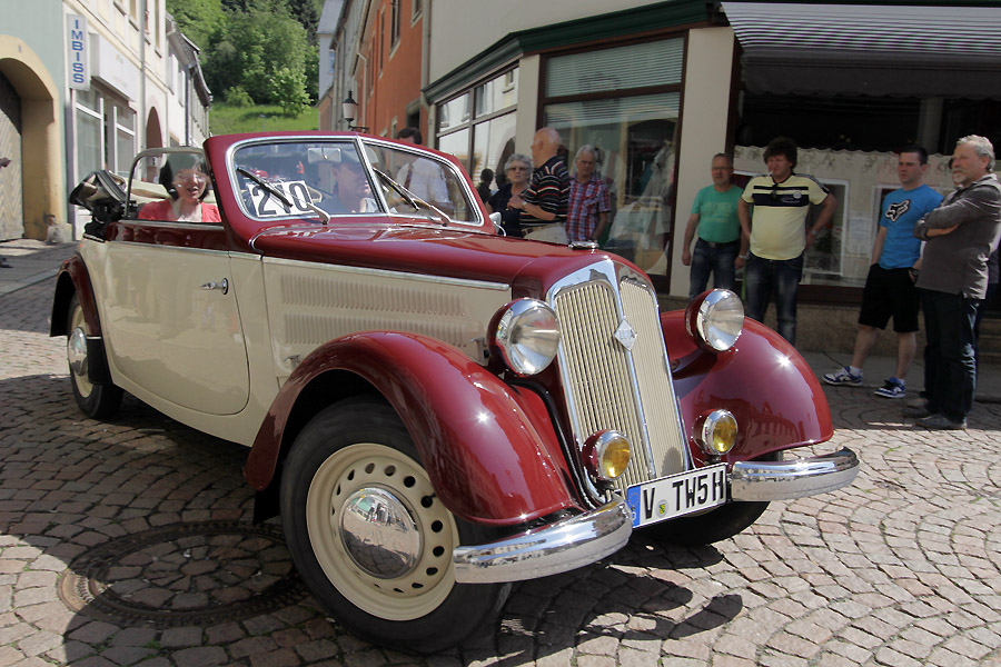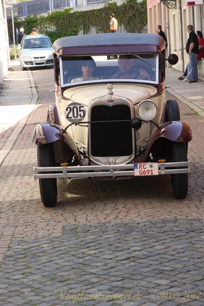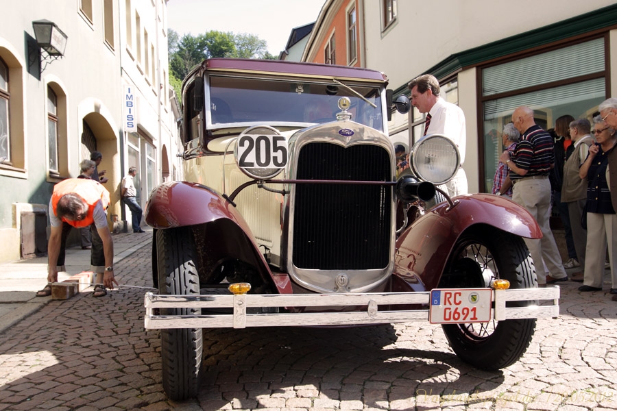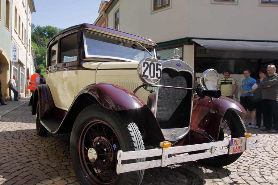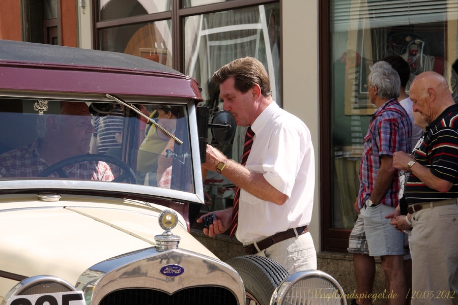 ADAC Oldtimerausfahrt rund um die Park- und Schlossstadt Greiz des Historischen Rennsportclub Greiz-Neumühle im ADAC machte Zwischenstopp auf dem Greizer Markt Oldtimerausfahrt rund um die Park- und Schlossstadt Greiz des Historischen Rennsportclub Greiz-Neumühle im ADAC machte Zwischenstopp auf dem Greizer MarktGREIZ. Nicht nur in und um Eisenach waren an diesem Wochenende Oldtimer unterwegs. Nein, auch in und um die Park- und Schlossstadt Greiz waren am vergangenen Sonntag wunderschöne Oldtimer, seien es nun PKW oder Motorrad, auf den Straßen zu sehen und erstaunten so manchen der Straßenpassanten. Hatte doch der Historische Rennsportclub Greiz-Neumühle im ADAC zu seiner 28. ADAC Oldtimerausfahrt rund um die Park- und Schlossstadt Greiz nach Neumühle/Elster eingeladen. Mei Vugtland iss so wunnerschie . . . – heißt es in einem Heimatlied aus der Region. Und davon schwärmten die rund 150 Teilnehmer dieser Oldtimerausfahrt in den Frühling, die sich auf die Tour von Neumühle/Elster über Greiz, Zeulenroda, rund um die Zeulenrodaer Talsperre und weiter über Pöllwitz, Dobia, die Steinermühle, Elsterberg, zurück nach Greiz und dann zum Ziel in Neumühle/Elster begeben hatten. Wie sagte doch Thomas Roth, der Vorsitzende des HRC Greiz-Neumühle e.V. in seiner Begrüßung: Ich freue mich darüber, dass sich Teilnehmer aus den verschiedensten Teilen Deutschlands auch zur diesjährigen Ausfahrt den Weg nach Neumühle gefunden haben. Mit Sicherheit bietet ihnen die schöne Umgebung von Neumühle oder die Park- und Schlossstadt Greiz die Möglichkeit, um mit ihren geliebten Oldtimern auch diesen Teil Deutschlands zu erkunden, neue Kontakte zu knüpfen oder Erfahrungen auszutauschen. Davon waren die Teilnehmer, die in 10 Wertungsklassen starteten, so begeistert. Kaiserwetter und strahlender Sonnenschein auf der Fahrt, dazu so begeistert mitgehende Zuschauer und Passanten an den Straßen, gute Gespräche untereinander und manch guter Ratschlag, den man im Gespräch erhielt – das macht wohl die Faszination dieser ADAC Oldtimerausfahrten aus und so beliebt. Natürlich hatte sich die gute Stube von Greiz, der Greizer Markt, besonders herausgeputzt. Auch viele Greizer ließen sich das Spektakel der Wagen- und Motorradauffahrt nicht entgehen, war doch hier ein Zwischenstopp bei dieser ADAC Oldtimerausfahrt vorgesehen. Ulrich Zschegner in Vertretung des Greizer Bürgermeisters begrüßte alle Teilnehmer mit Handschlag, wünschte ihnen einen angenehmen Aufenthalt in der Region und überreichte jedem Teilnehmer als kleines Andenken an die 28. ADAC Oldtimerausfahrt rund um die Park- und Schlossstadt Greiz den diesjährigen Stadttaler, der in diesem Jahr das Ulf-Merbold-Gymnasium zeigt. Wertungsprüfungen, insgesamt fünf, mussten natürlich ebenso absolviert werden wie die Fahrtstrecke, und das nach Möglichkeit fehlerlos. Ein Spurbrett sauber und ordnungsgemäß befahren, einen Bremspunkt genau treffen, da hieß es schon in Neumühle/Elster Konzentration und Augen auf. Einen genauen Abstand zur Bordsteinkante anfahren und einen bestimmten Frontabstand vor einem Hindernis punktgenau erreichen, da gehörte auf dem Greizer Markt eine ganze Menge Geschicklichkeit dazu. Es waren aber auch tolle Autos, vom PKW bis zum Kleinlaster, und Motorräder zu sehen. Ja, selbst Dreiradfahrzeuge waren dabei und ließen manchen staunend blicken. Eine tolle Verbindung von Weltmuseumstag und gelebter Historie. Haben die Oldtimerfreunde doch einen nicht unerheblichen Anteil bei der Bewahrung und Erhaltung musealer Objekte aus der jüngeren Geschichte unseres Landes sowie Europas und tragen damit auch am motorisierten Geschichtsbild unserer Epoche bei. Natürlich wurden die Besten in den einzelnen Fahrtklassen mit entsprechenden Pokalen geehrt. Deren Aufzählung würde allerdings hier zu weit führen und den Rahmen sprengen, doch einige Sonderpreise dieser 28. ADAC Oldtimerausfahrt rund um die Park- und Schlossstadt Greiz muss man wohl nennen. So ist der älteste Teilnehmer mit 81 Jahren, Wolfgang Sell, im März 1931 geboren und mit seinem Motorrad aus Eisenach angereist. Der jüngste Teilnehmer mit 17 Jahren, Florian Walter, wurde im Juli 1995 geboren und kam aus Linda bei Gera nach Neumühle/Elster. Das älteste Motorrad dieser Oldtimerausfahrt war eine BMW R62 mit dem Baujahr 1929, die Reinhard Schütze aus Hartmannsdorf bei Crossen auf die Strecke brachte. Bei den PKW war es ein Ford A mit dem Baujahr 1929, den Heinrich Scholz aus Reichenbach/V. sein Eigen nennt und in dieser Oldtimerausfahrt vorstellte.