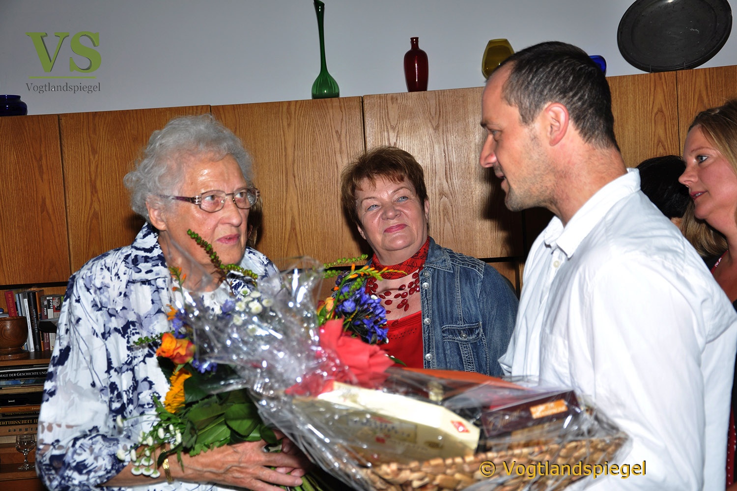 Ingo Hufenbach, Leiter der Musikschule Greiz, gratuliert der Jubilarin.