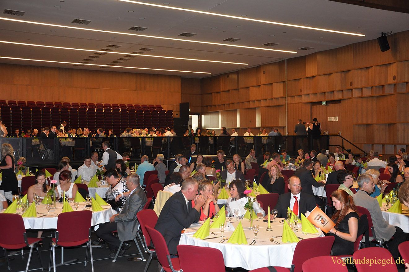 Die Gäste haben an den Tischen in der Vogtlandhalle Greiz Platz genommen.