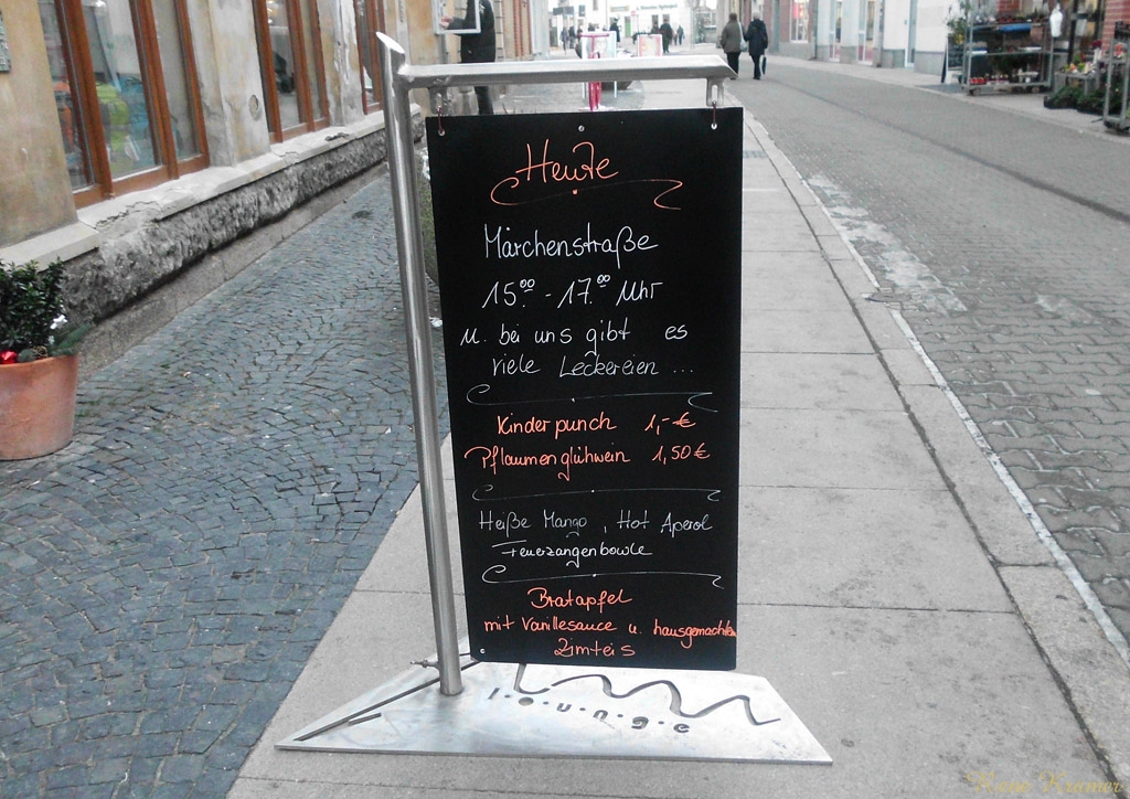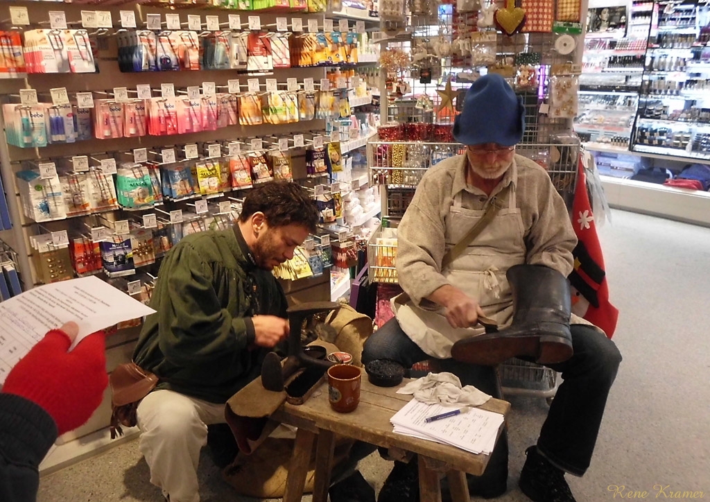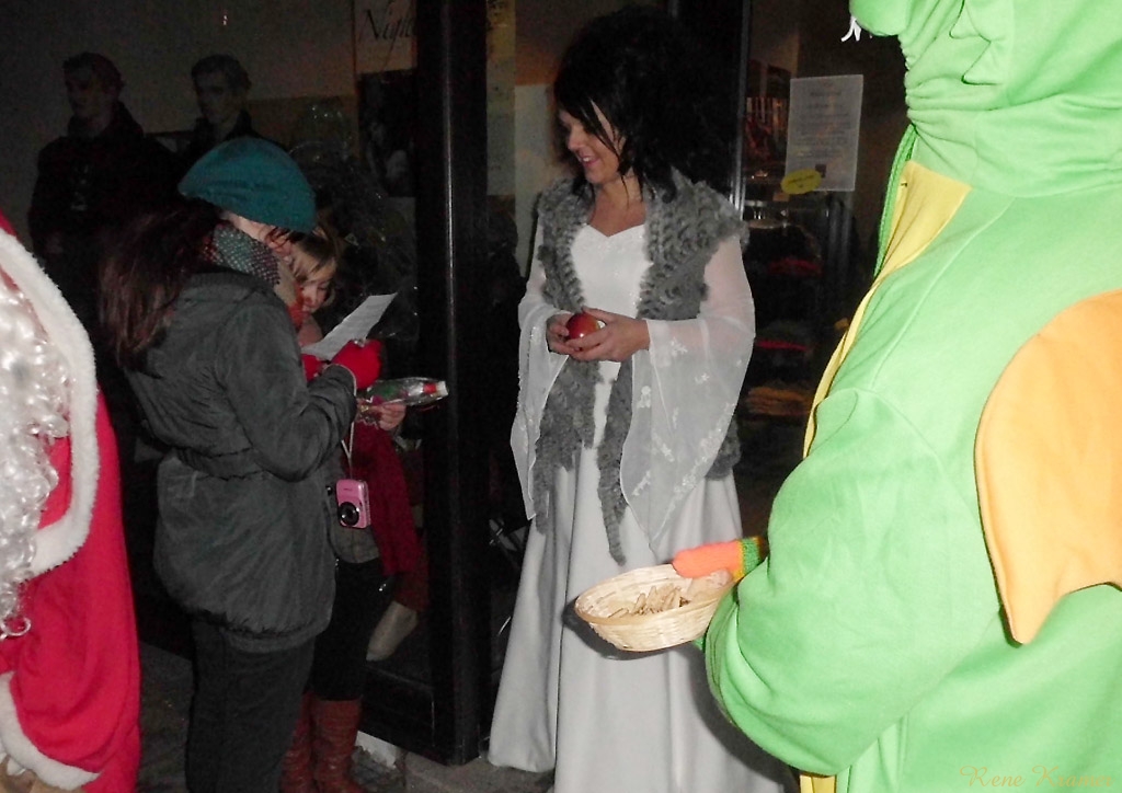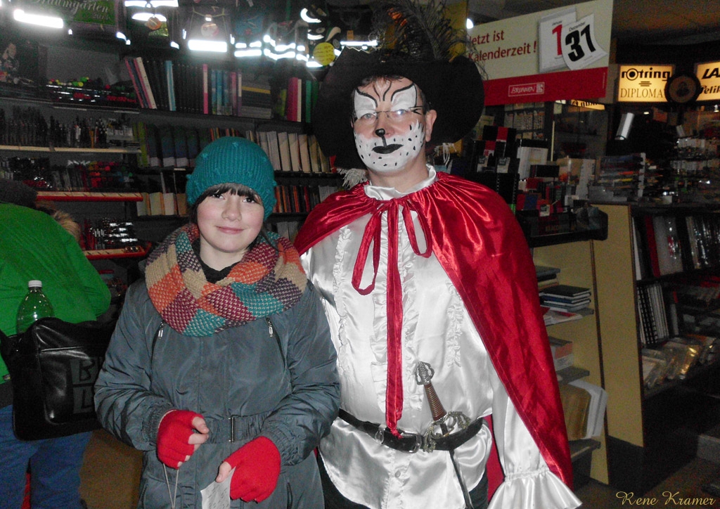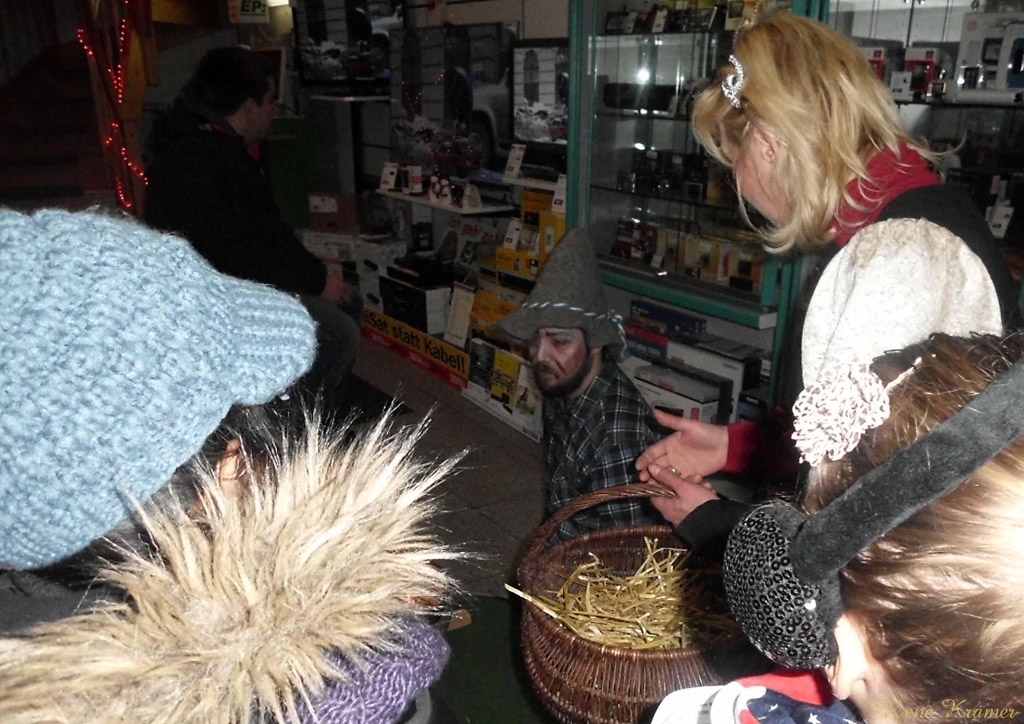Währenddessen boten neun andere Geschäfte eine Märchen-Rätsel-Rate-Tour durch ihre Geschäfte an. Im Zeitsprung in der Brückenstraße musste man Schneeweißchen und Rosenrot erkennen, was noch relativ leicht war, ebenso wie Dornröschen im Bücherwurm. Dass die Goldene Gans im dm-Drogeriemarkt gesucht wurde, war doch schon etwas schwerer zu erraten. Aber die Darsteller hatten bei jeder Station immer die passenden Hinweise parat. Bei Quick-Schuh war es dann wieder leichter. Denn in welchem Märchen spielt schon ein Schuh eine Hauptrolle? Dazu die Musik aus Drei Haselnüsse für Aschenbrödel, welche im Laden gespielt wurde, ließen alle erkennen, dass es sich nur um Aschenputtel handeln konnte. Frau Holle empfing die Kinder im Wäscheladen Hautnah in der Altstadtgalerie. Beim Papierhandel Tischendorf begrüßte alle Kinder ein eleganter Kater mit Stiefel. Im Tee-Treff-Punkt gab es Brot mit Mus und ein Schneider erzählte von seinen Abenteuern. Bei der Klamotte stand ein Schneewittchen an der Tür und das Ziel der Märchen-Rallye war bei k&k City-Sound. Dort befand sich die Gewinnbox und, nachdem jeder Rumpelstilzchen erkannt hatte, konnten die Teilnehmer ihren Gewinnspielschein dort einwerfen.