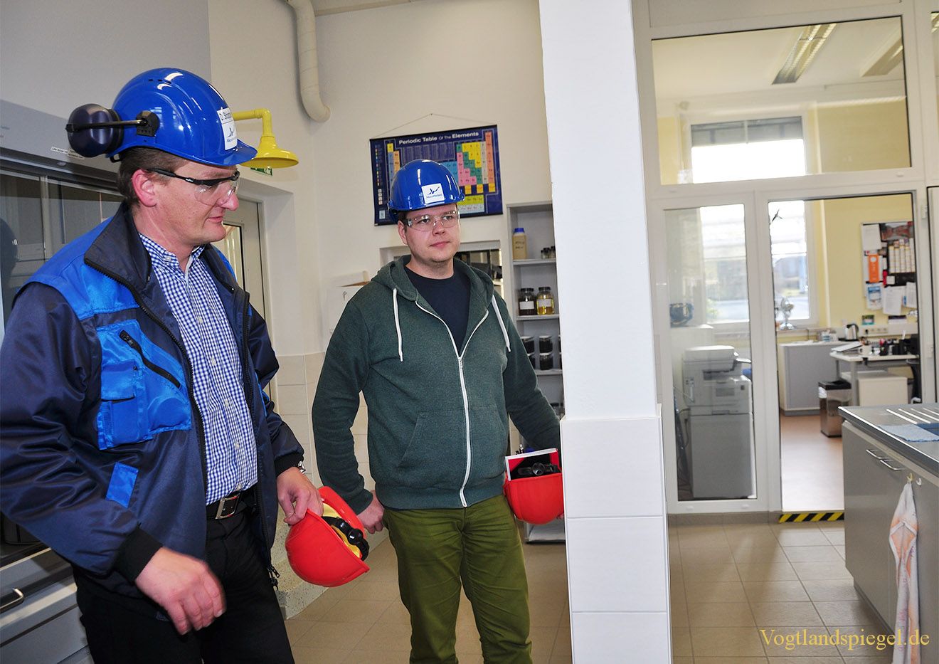 Werksleiter Dirk Stöppler (l.) und der Chef der Betriebsfeuerwehr, Stephan Schaller führen durch die Abteilung Forschung.