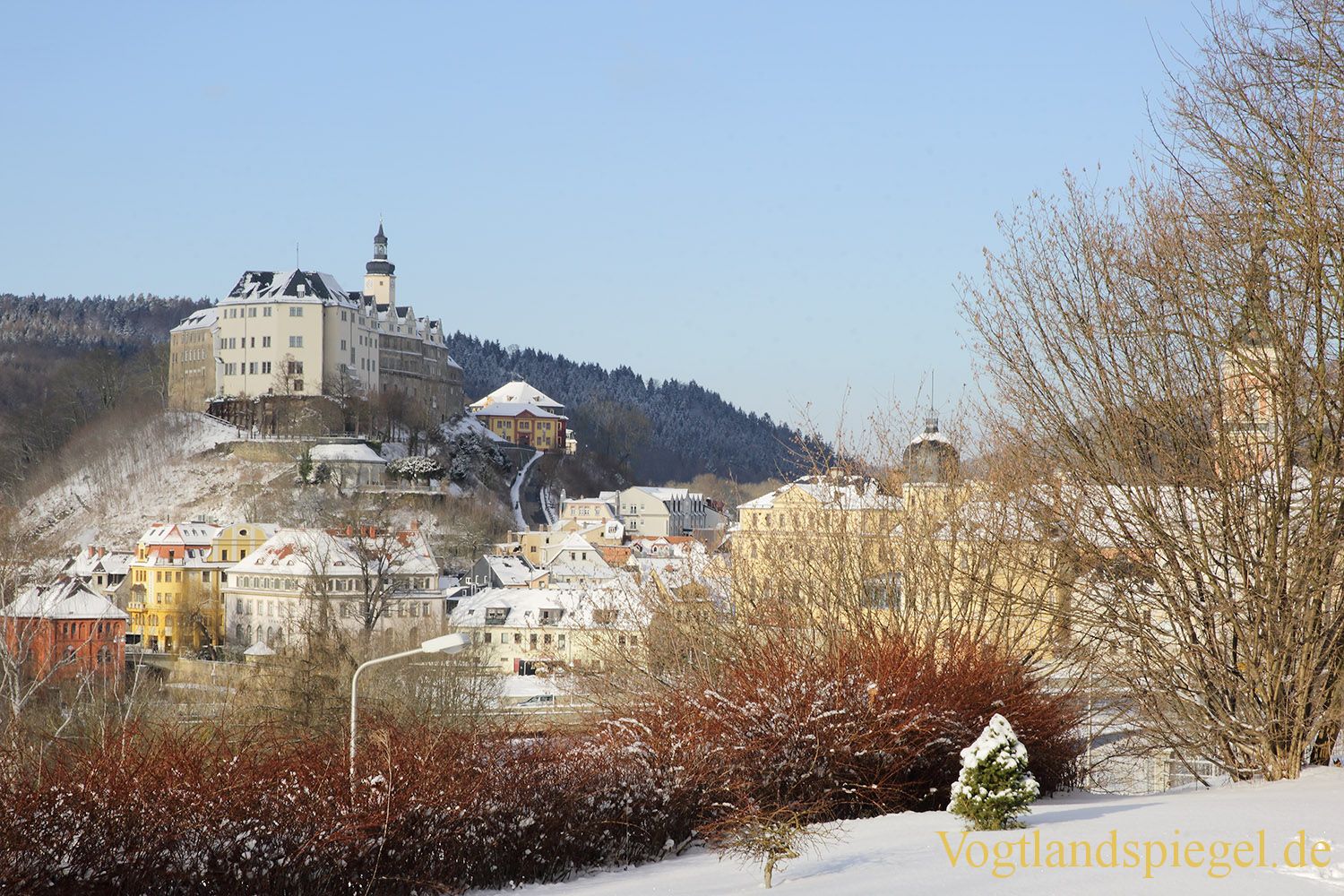 Blick vom Papiermühlenweg in Richtung Greizer Zentrum und zum Oberen Schloss. Aufnahme von Anfang Januar 2017.