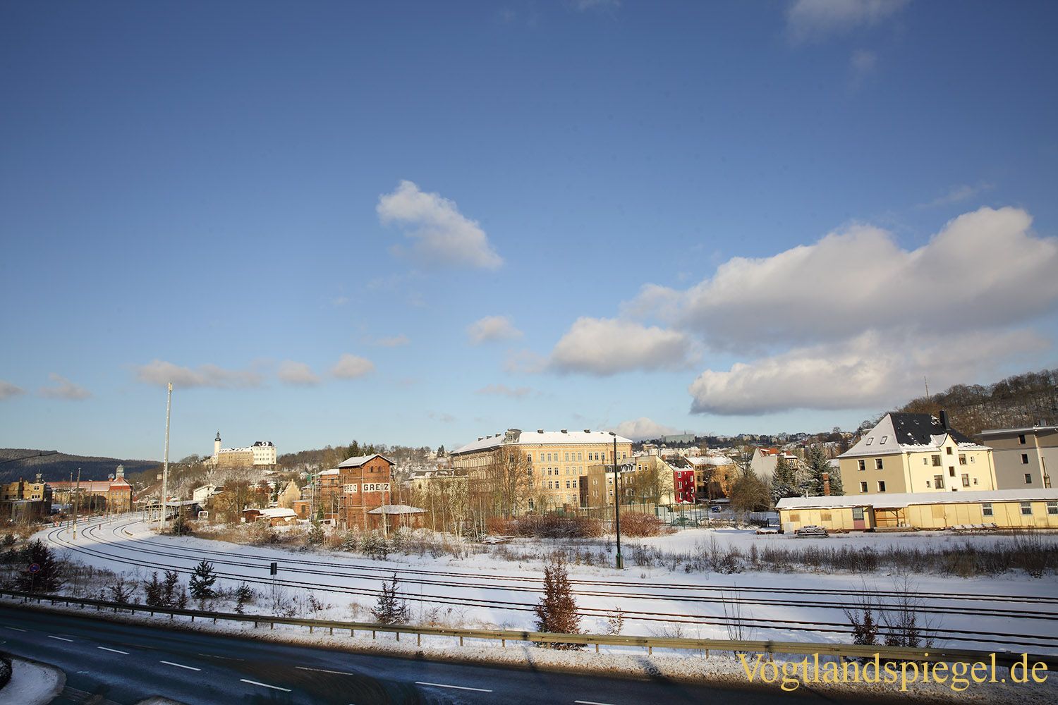 Blick in Richtung Bahnhof, Oberes Schloss und Ulf-Merbold-Gymnasium. Aufnahme von Anfang Januar 2017.