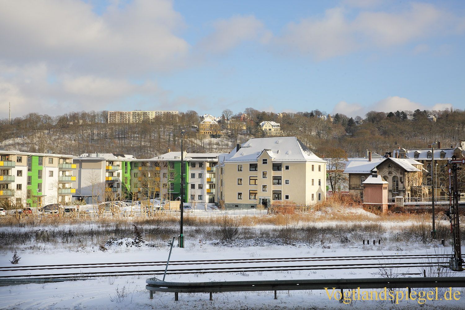 Blick über die Gleise in Richtung Wohnpark der GWG Greiz. Aufnahme von Anfang Januar 2017.
