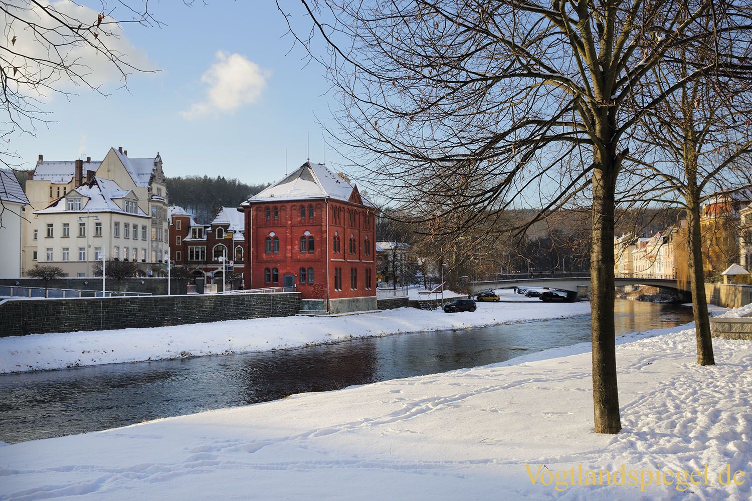 Blick über die Weiße Elster zum Roten Haus. Aufnahme von Anfang Januar 2017.