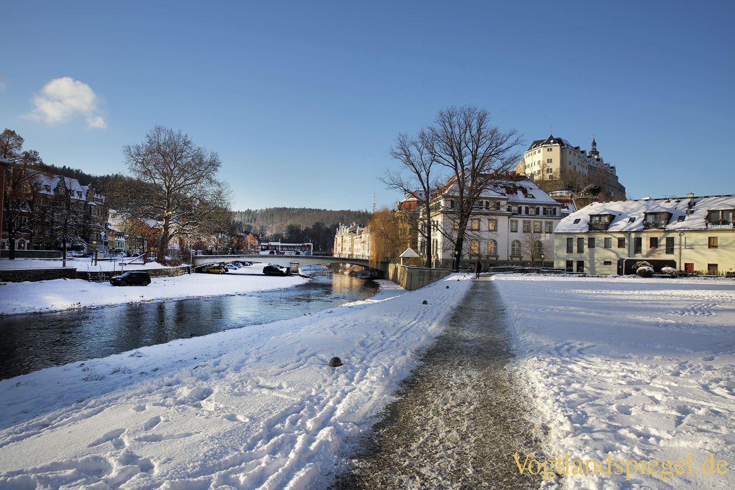 Winterlicher Blick vom Schlossgarten elsterabwärts. Aufnahme von Anfang Januar 2017.