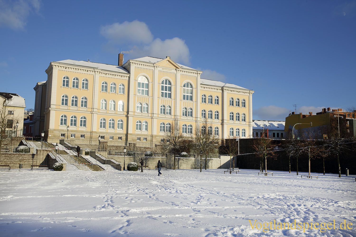 Winterlicher Blick zum Gebäude der Lessing-Regelschule Greiz. Aufnahme von Anfang Januar 2017.