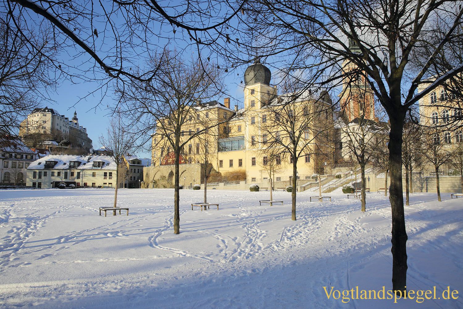 Verschneiter Schlossgarten mit Blick zur Stadtmühle und dem Unteren Schloss mit großem Schwibbbogen. Aufnahme von Anfang Januar 2017.