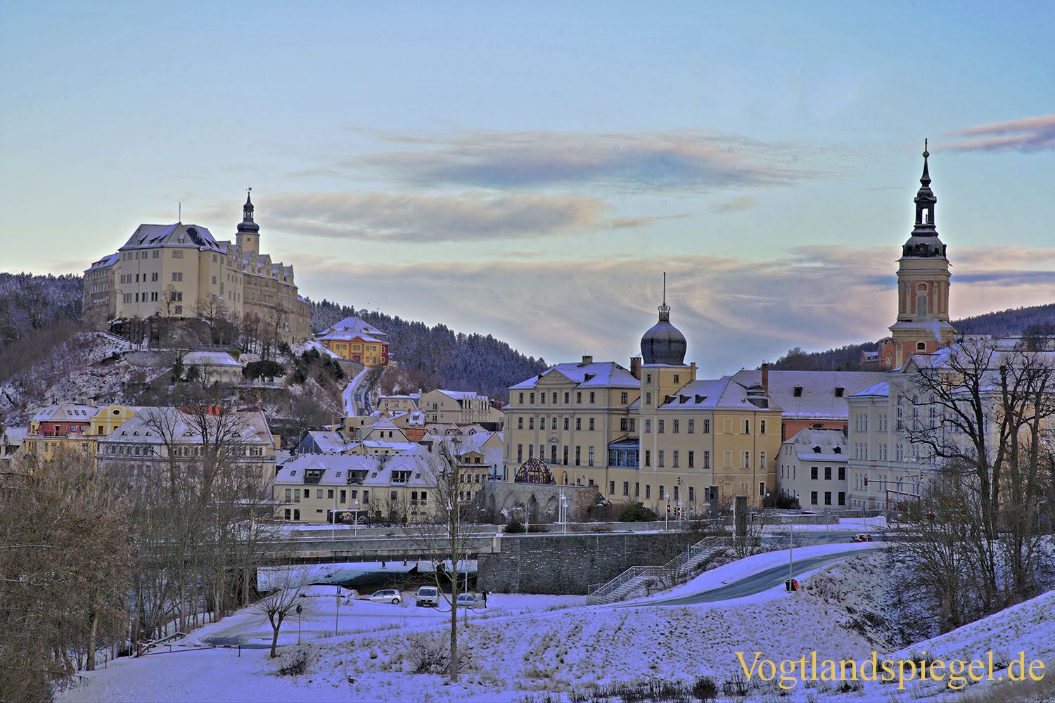 Winterlicher Blick in Richtung Greizer Schlossbrücke mit Oberem Schloss. Aufnahme von Mitte Januar 2017.