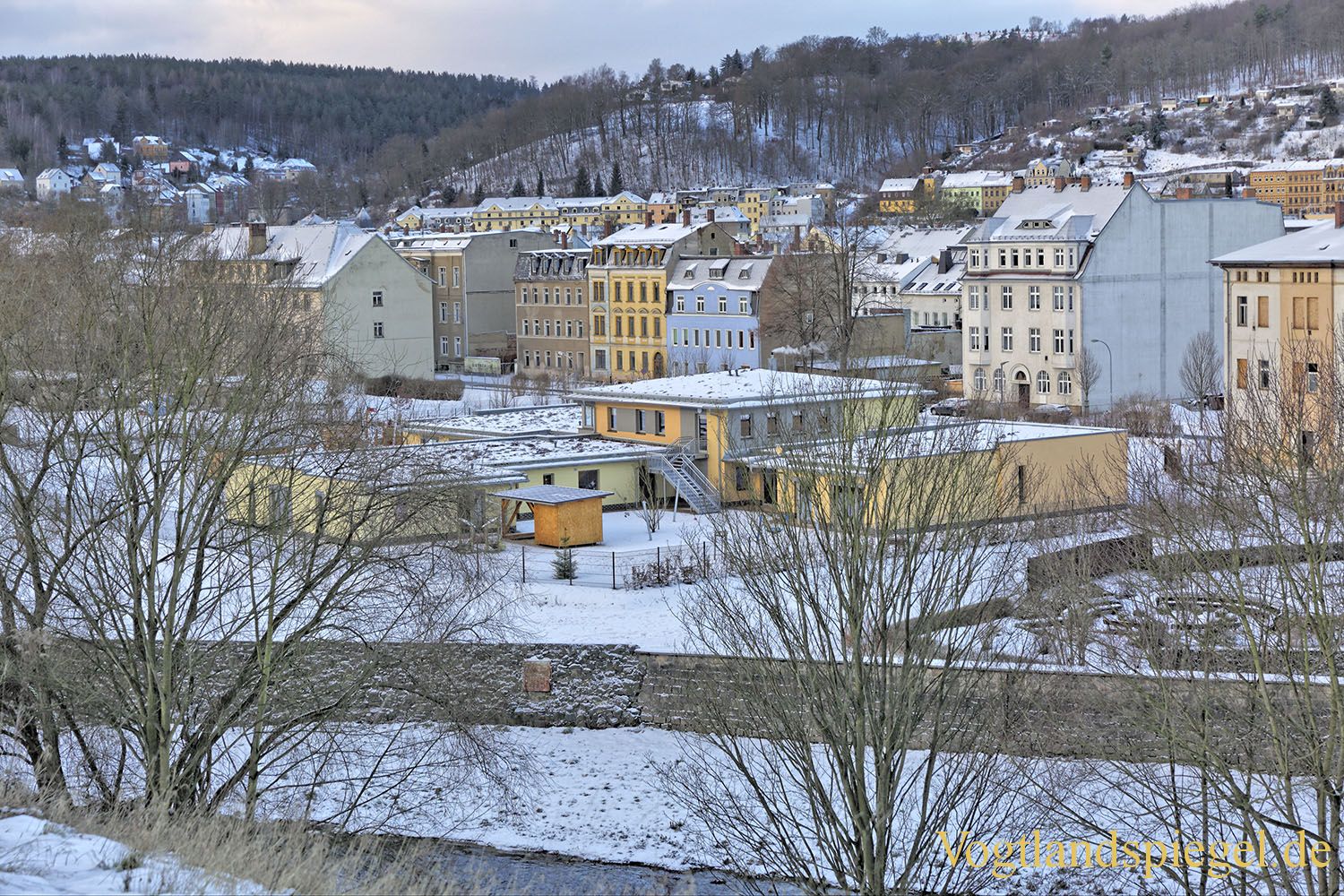 Blick vom Papiermühlenweg zum Kinderhaus Am Elsterufer. Aufnahme von mitte Januar 2017.
