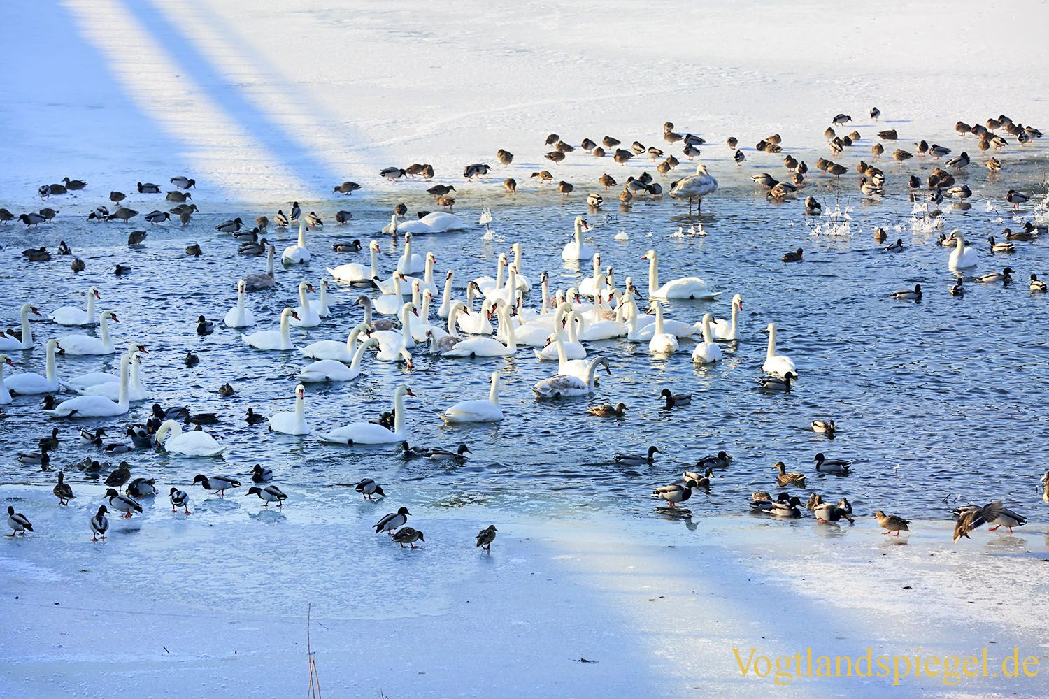 Die Talsperre Zeulenroda beherbergt eine Vielzahl von Enten und Schwänen, die sich in einem Wasserloch versammeln. Aufnahme von Ende Januar 2017.
