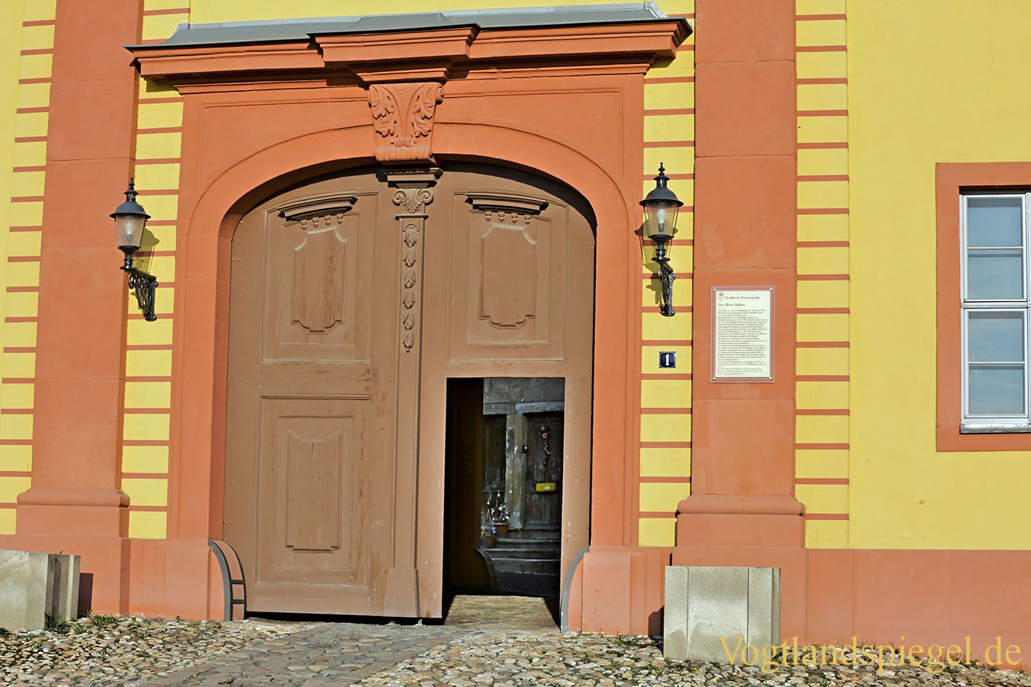 Offenes Tür am Torhaus des Oberen Schlosses Greiz. Aufnahme vom 1. April 2017.