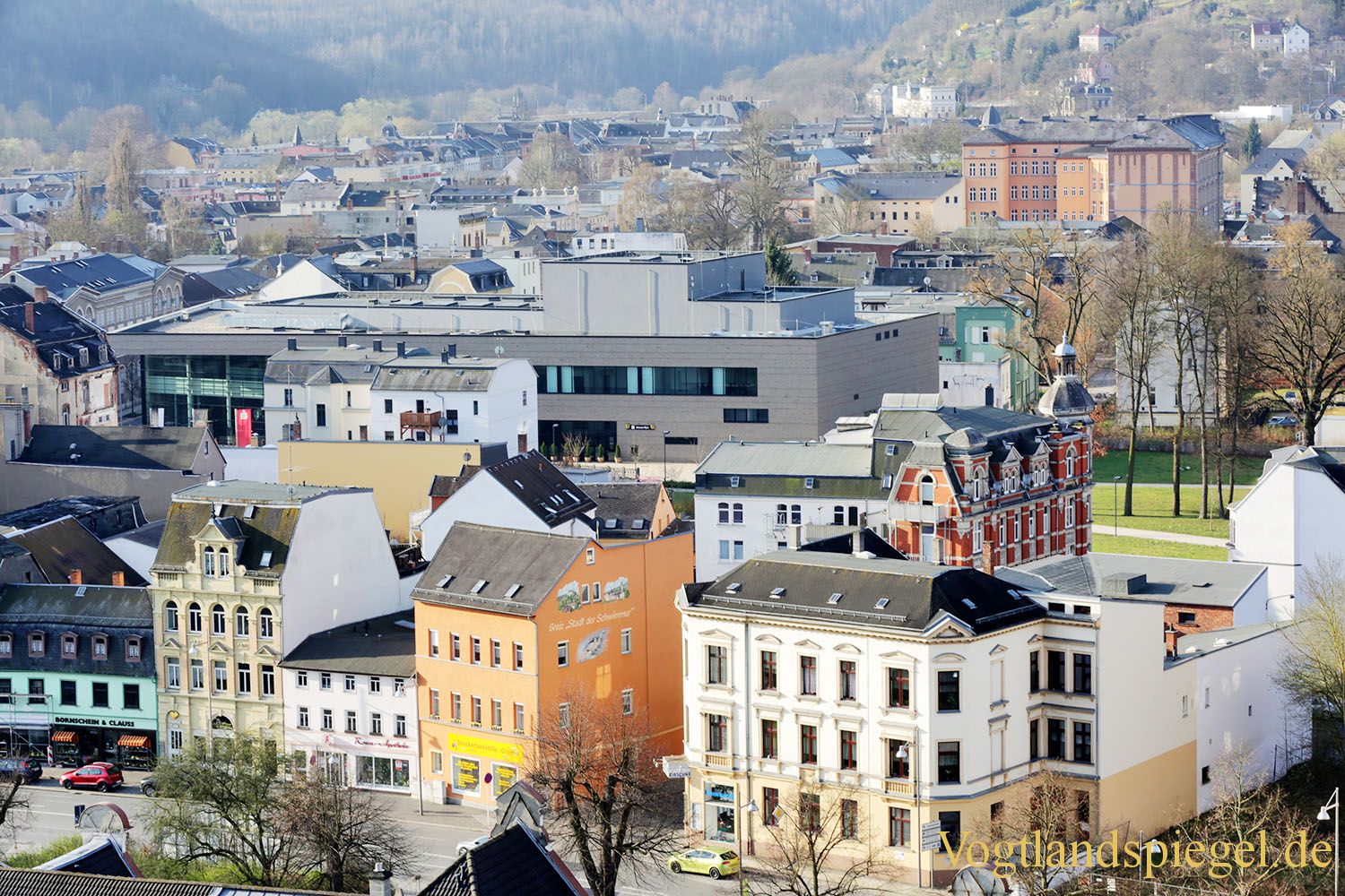 Die Vogtlandhalle Greiz aus Perspektive des Oberen Schlosses. Aufnahme vom 1. April 2017.
