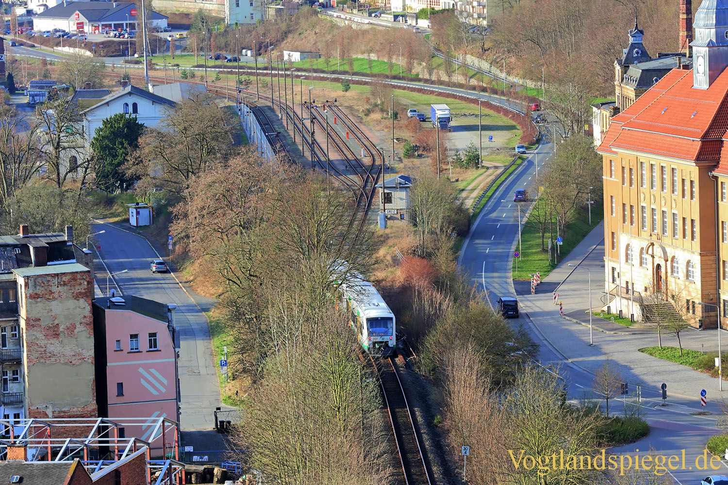 Die Vogtlandbahn fährt auf den Gleisen. Aufnahme vom 1. April 2017.