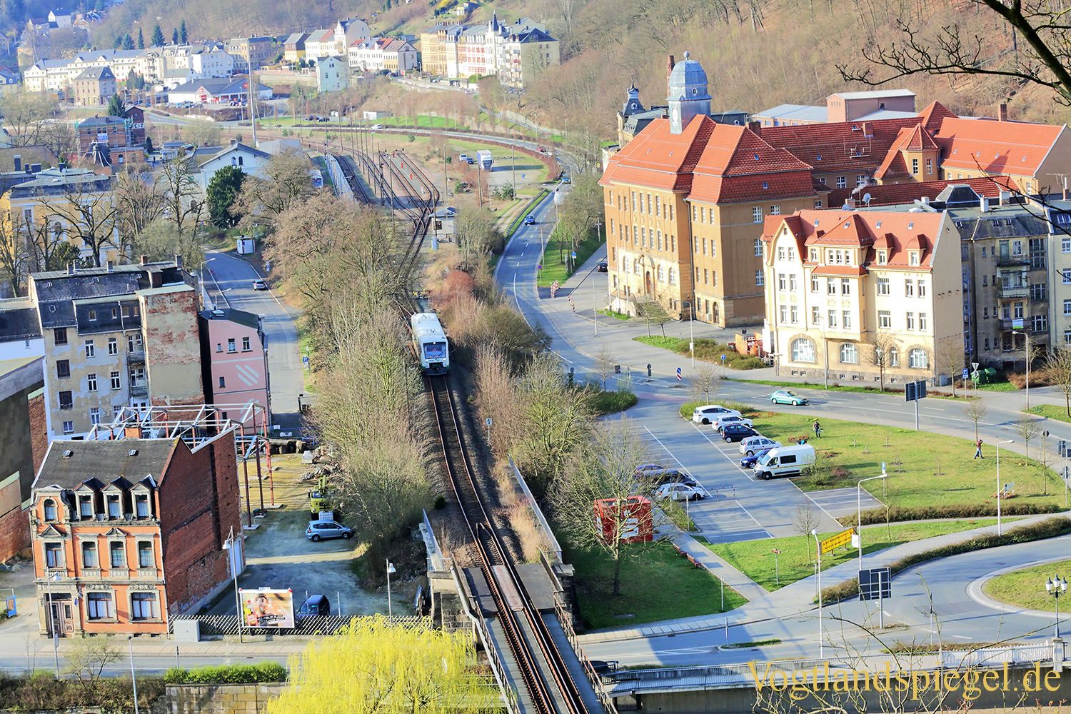 Die Vogtlandbahn fährt los – rechts das Justizgebäude. Aufnahme vom 1. April 2017.