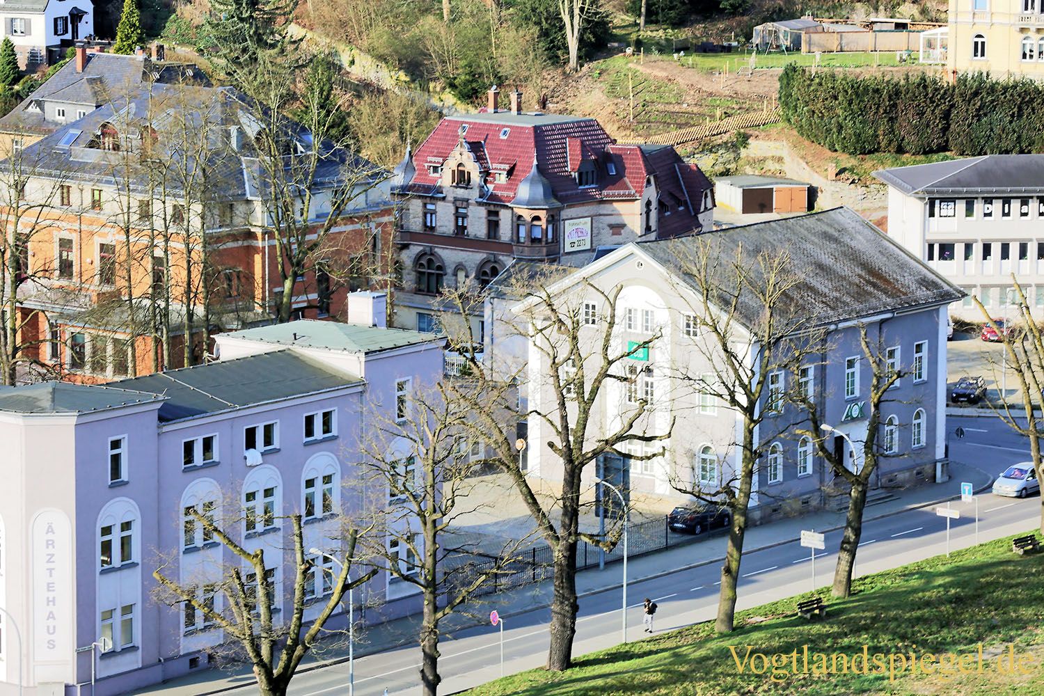 Blick auf das Ärztehaus und das AOK-Gebäude in der Bruno-Bergner-Straße. Aufnahme vom 1. April 2017.