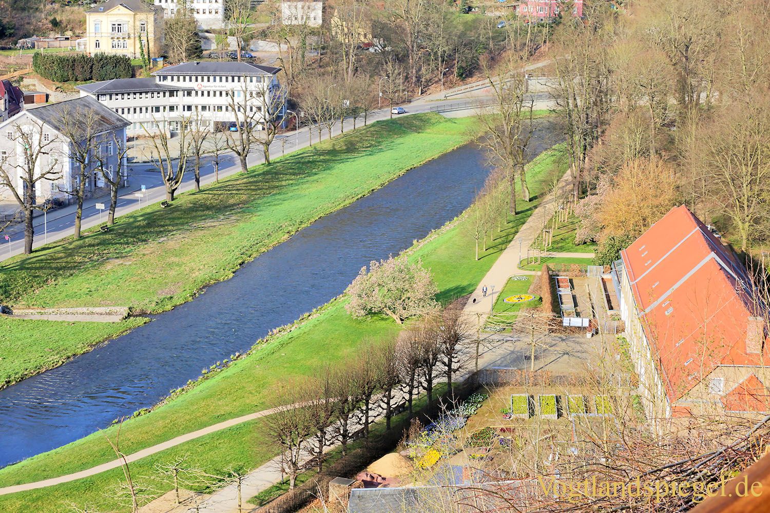 Blick elsterabwärts – rechts die Parkgärtnerei. Aufnahme vom 1. April 2017.